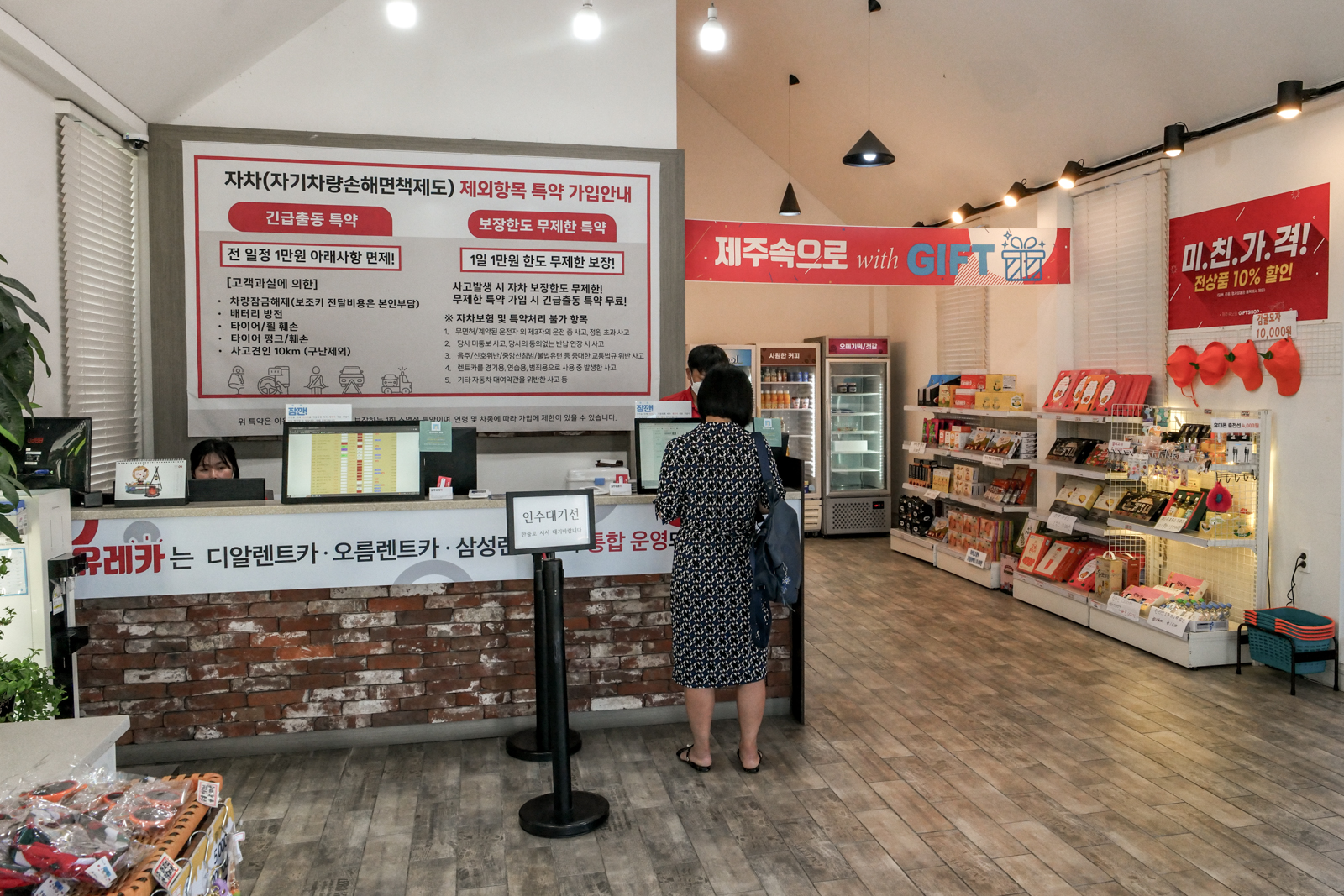 제주 렌트카 유레카에는 생수, 커피, 음료와 각종 먹거리를 살 수 있는 기념품샵도 운영하고 있어 필요에 따라 쇼핑을 할 수 있으며 렌트카 이용객인 경우 할인 혜택도 적용받을 수 있다.