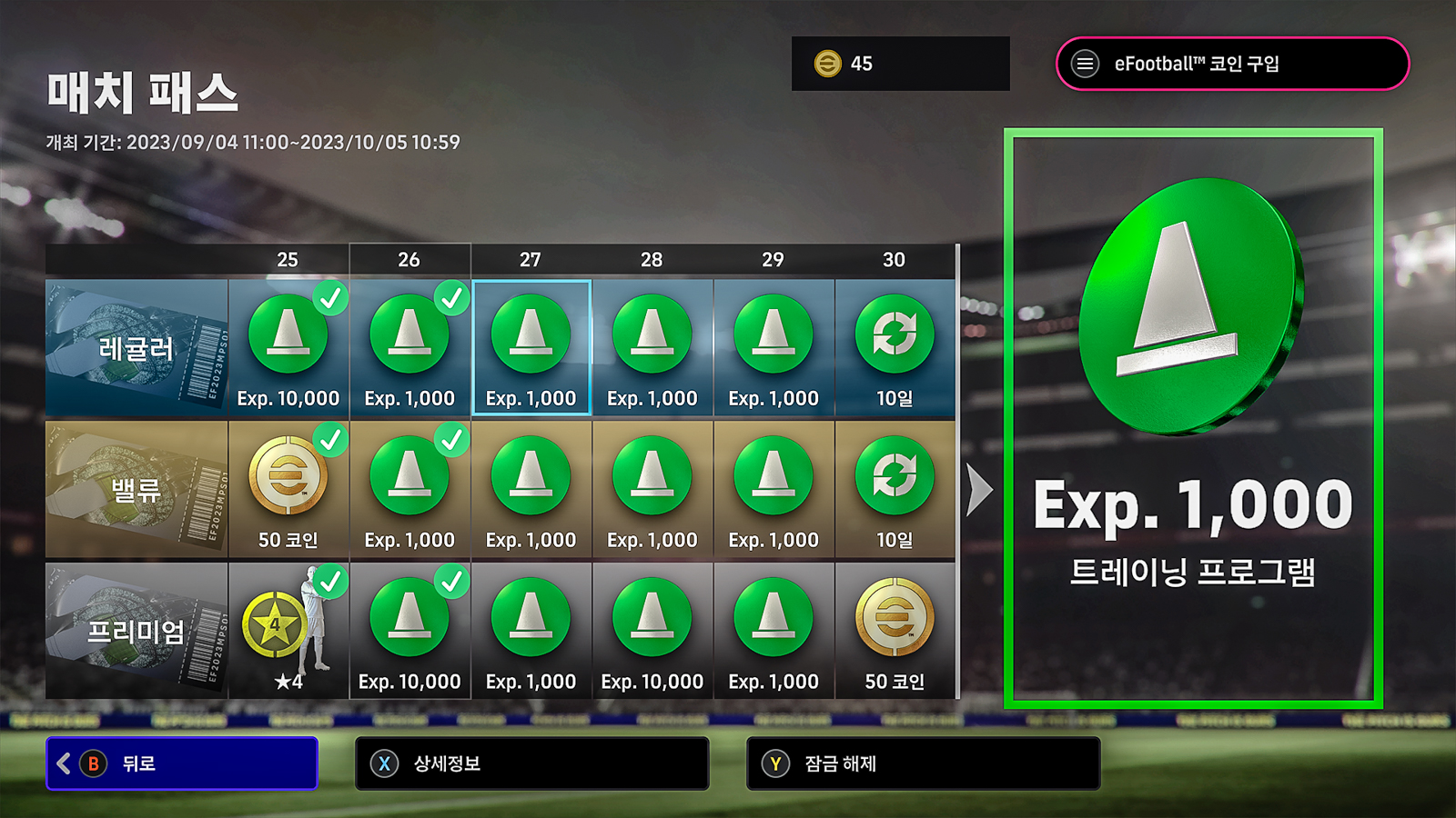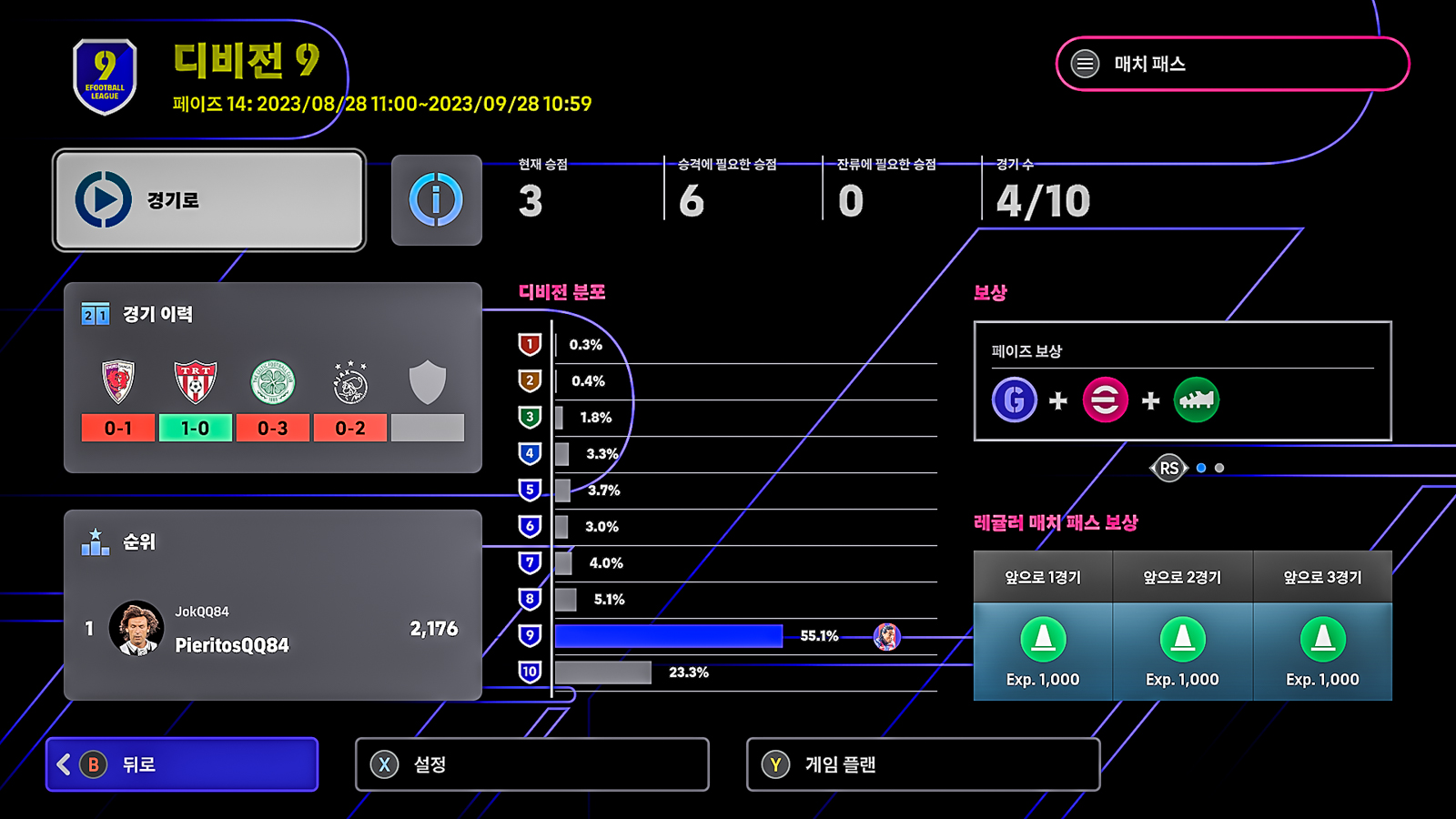 플레이를 하고 나면 매치 패스를 통해 경험치나 코인, 선수 뽑기권을 받을 수 있다. 밸류, 프리미어 모드는 금액적으로 부담이 없기에 오랫동안 플레이를 한다면 이용해보는 것도 좋다.
