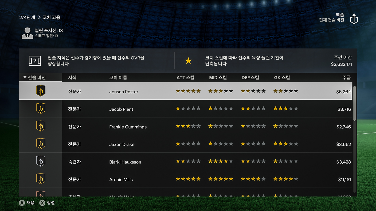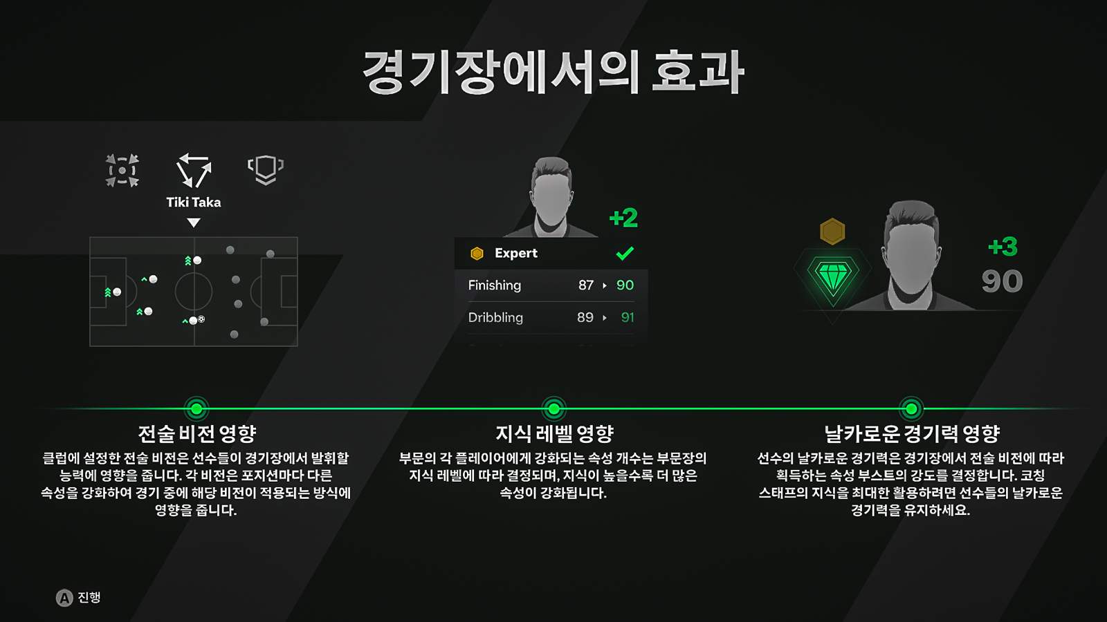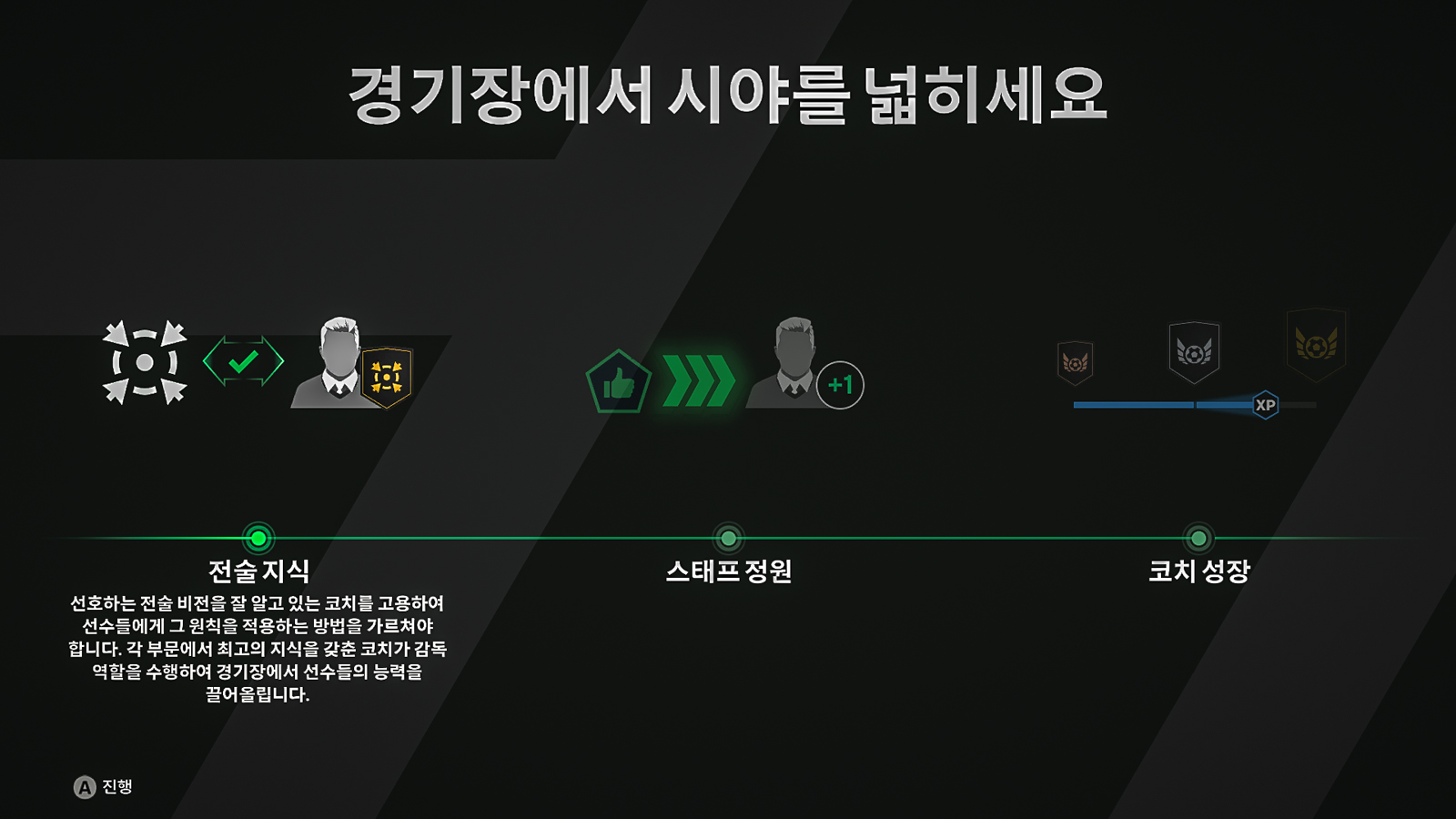 전술 비전을 통해 게임 플레이 시 다양한 전술을 설정할 수 있으며 지식 레벨도 키울 수 있는데 이건 커리어모드를 조금 더 해봐야 알 수 있을 것 같다.
