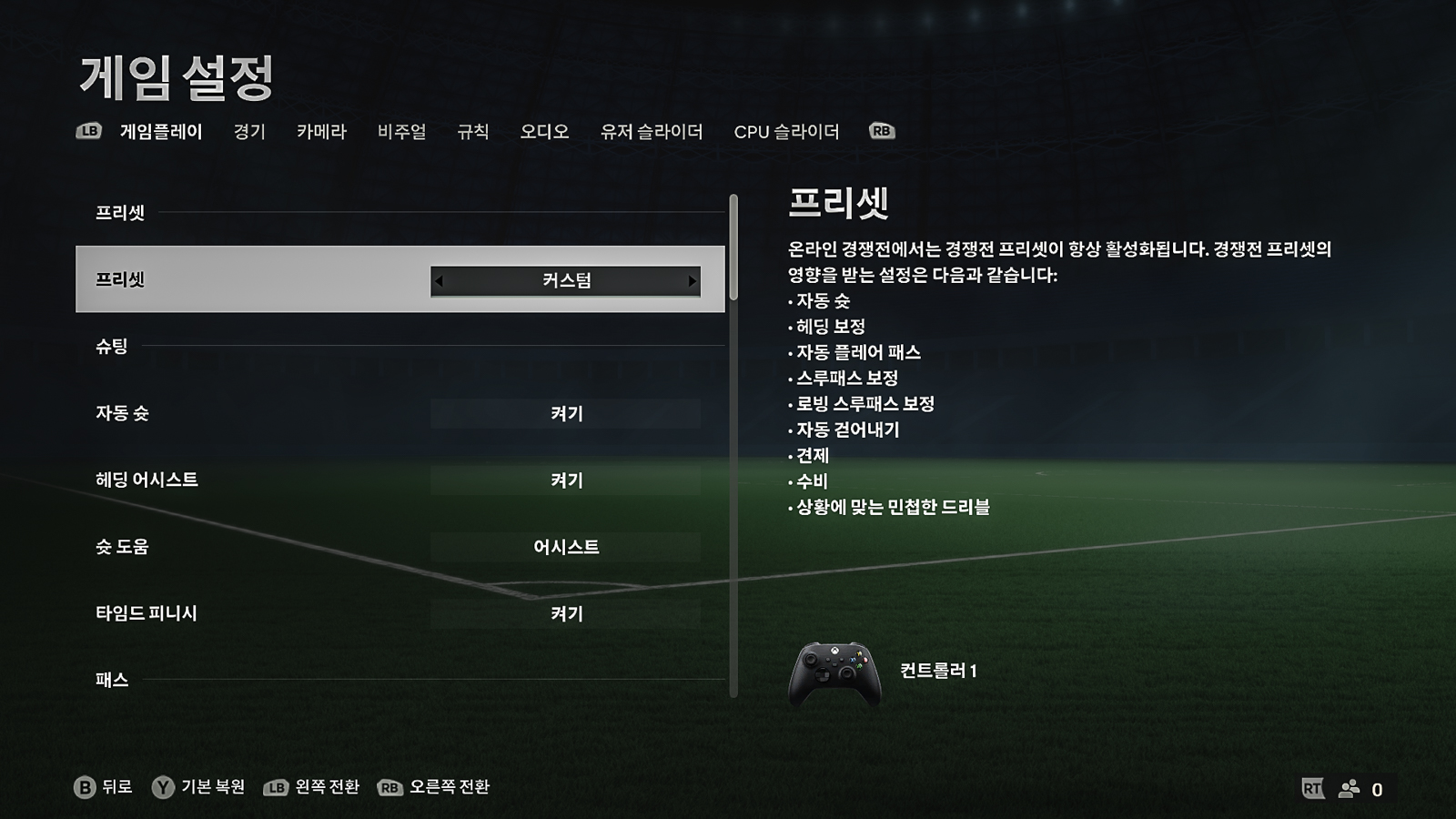 EA FC24를 플레이하기 전 게임 설정을 보니 기존작과 크게 다르지 않았으나 게임플레이 탭에서 프리셋을 통해 슈팅, 패스, 수비 등을 사용자의 취향에 따라 변경할 수 있다.