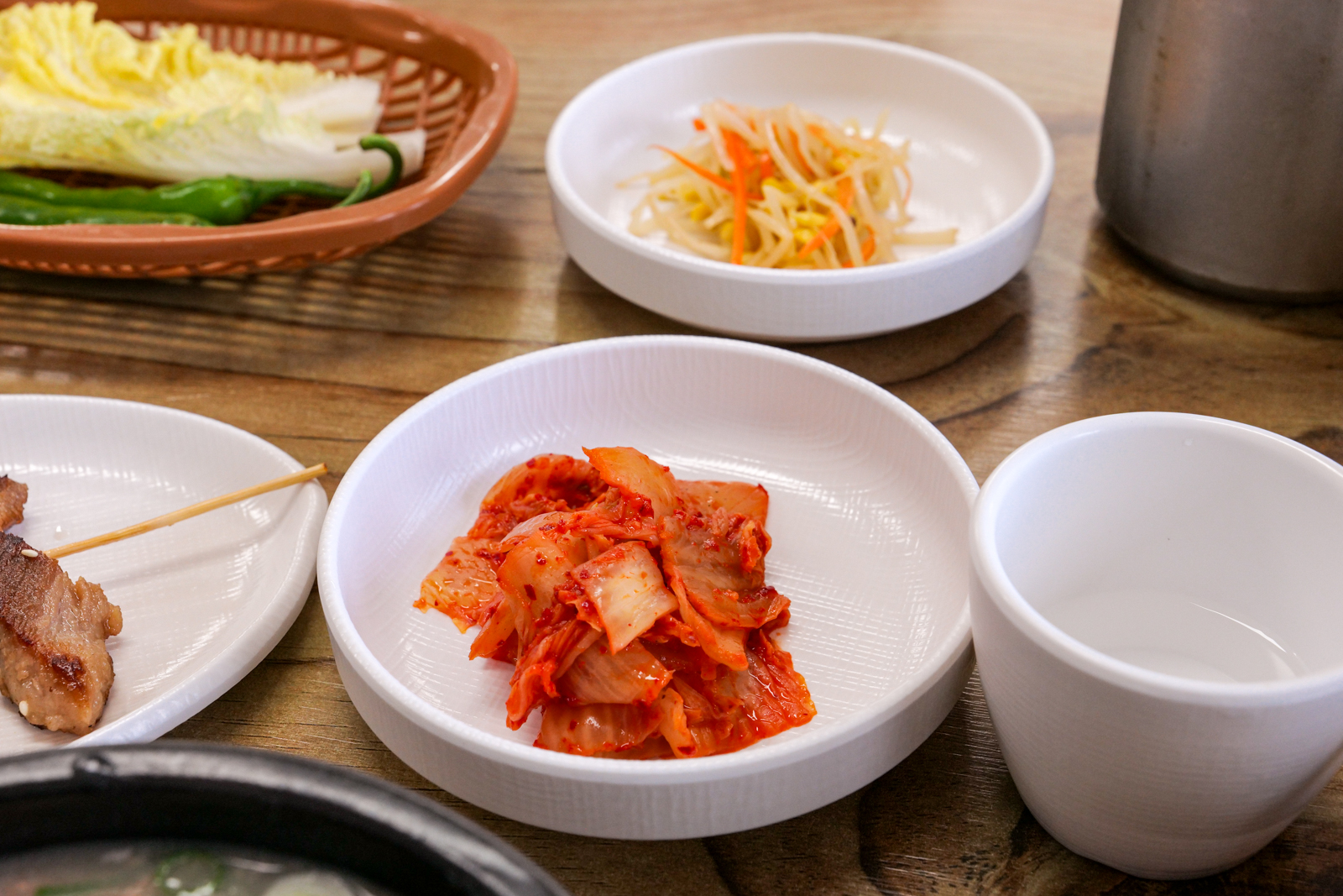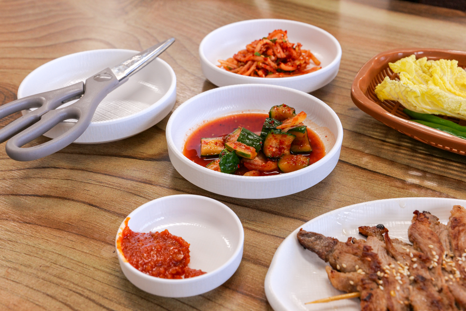 제주 외도회관에 처음 방문했던 날에는 향토음식 중 하나인 접짝뼈국과 함께 제주산 흑돼지를 사용해 만든 고기적을 주문했다. 주문 후 잠시 기다리면 이곳에서 만든 여러 밑반찬과 함께 뼈국이 나온다.