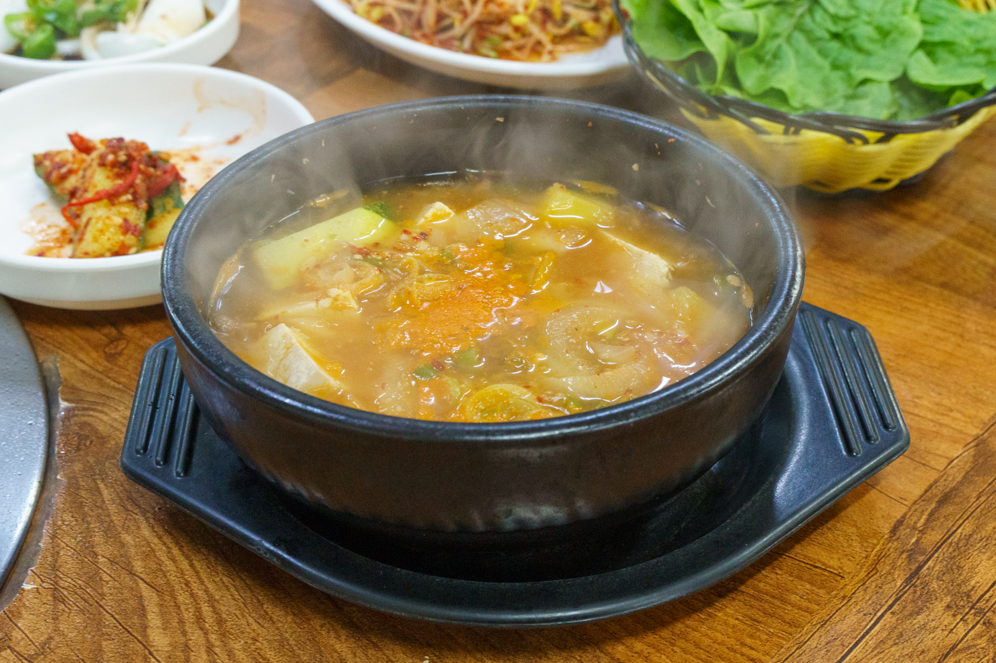 추가금액 없이 서비스로 나오는 된장찌개는 두부와 애호박이 듬뿍 들어 있는 구수한 맛을 자랑한다. 여기에 앞서 구운 오겹살이나 차돌박이를 넣어 먹으면 더욱 진한 풍미를 느낄 수 있어 술 안주로 제격이라 말할 수 있다.