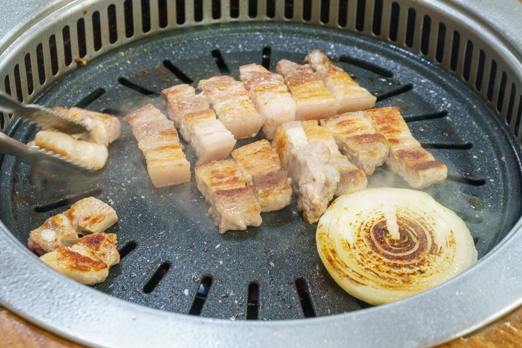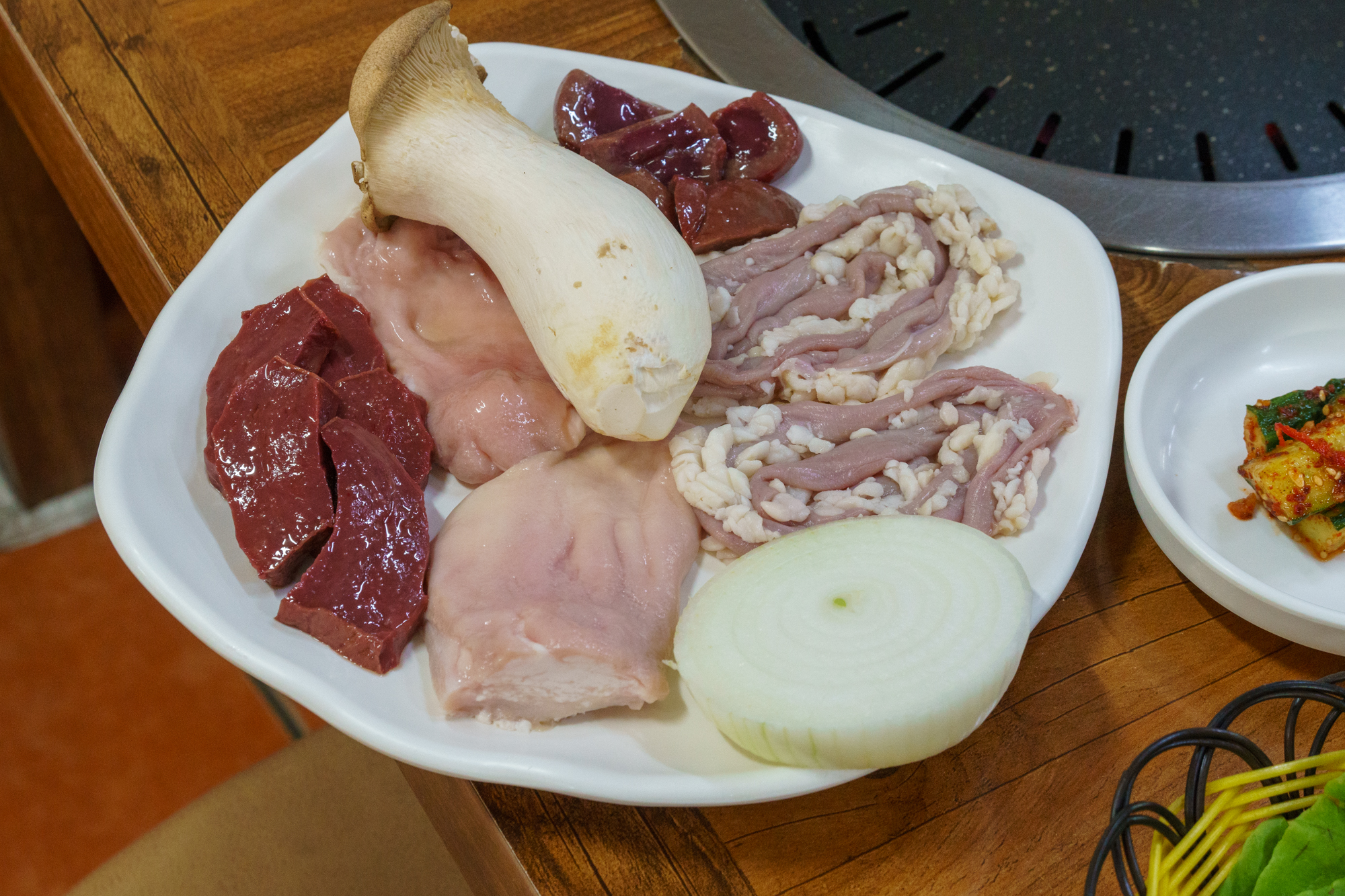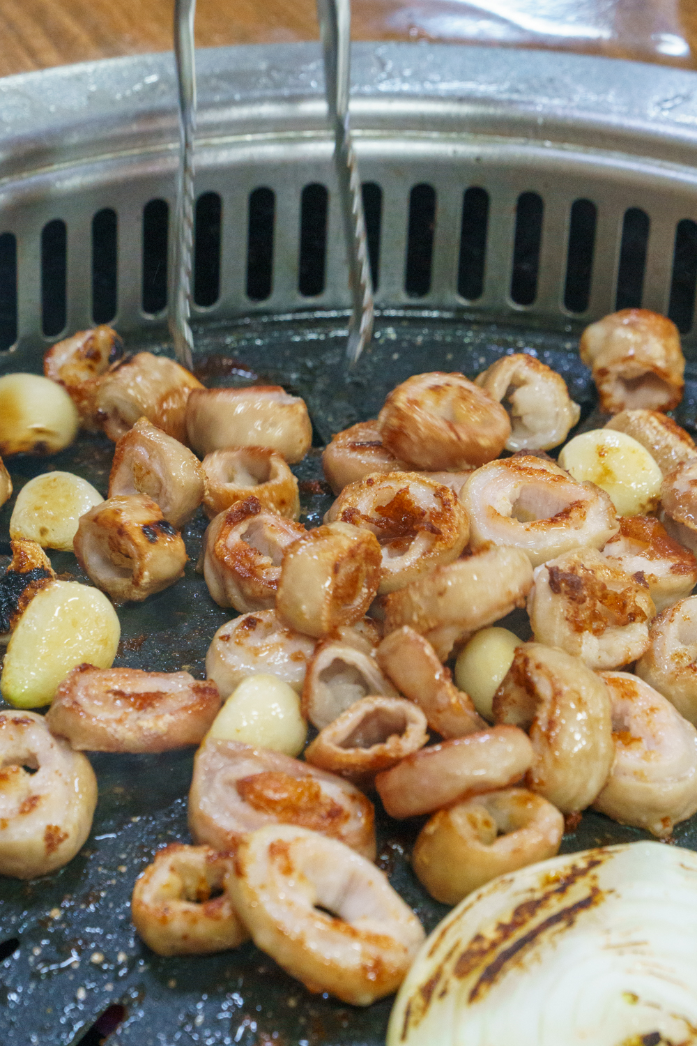 사장님이 직접 가져다준 모듬세트에는 소곱창, 소막창, 소염통, 소콩팥으로 구성되어 있으며 사진에 보이는 건 2인분이다. 버섯, 양파, 마늘과 함께 불판에 올려 오랫동안 구워야 제대로 된 맛이 나고 부위마다 다른 식감과 맛이 나서 많이 먹어도 질리지 않아서 좋다.