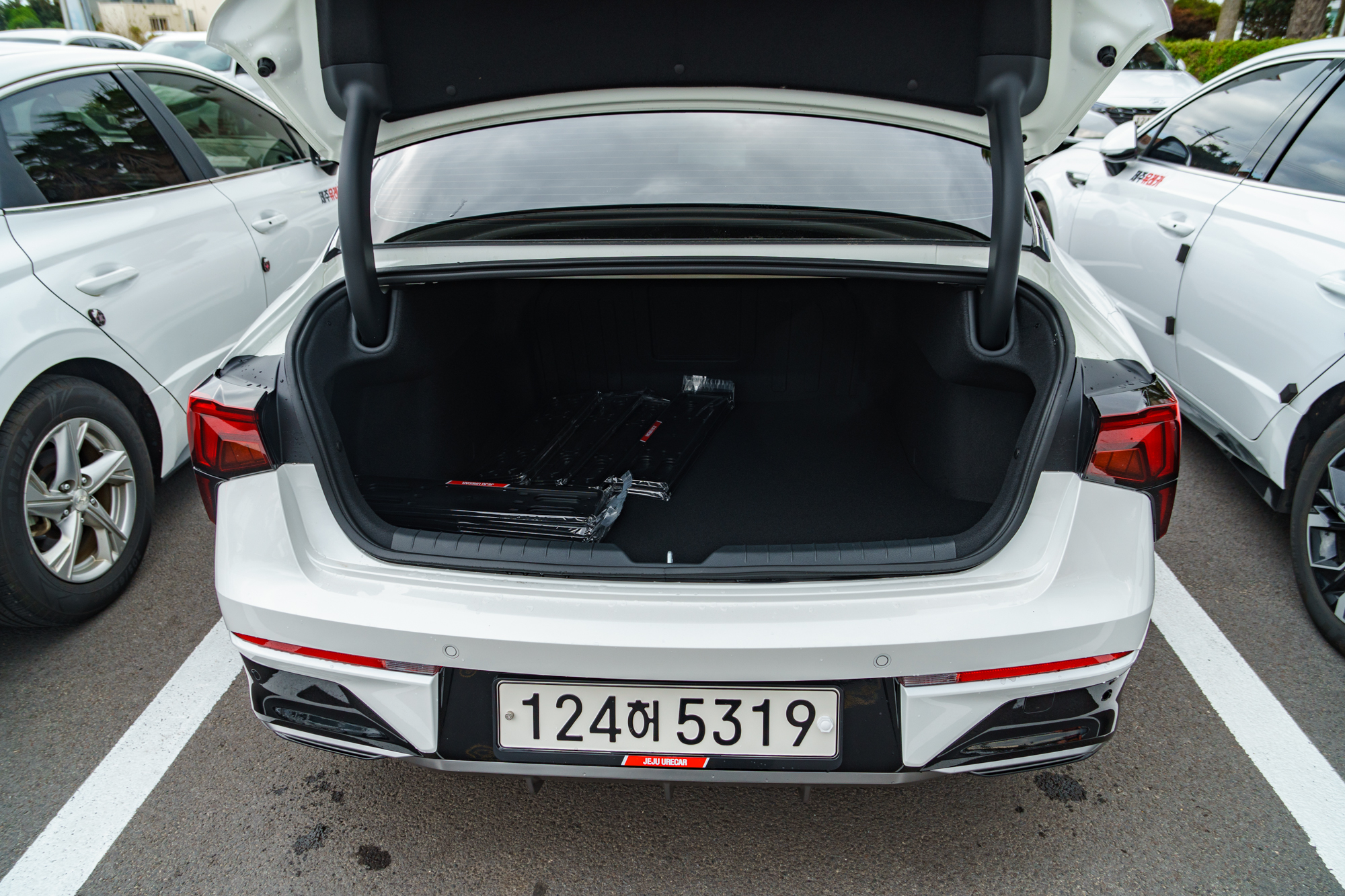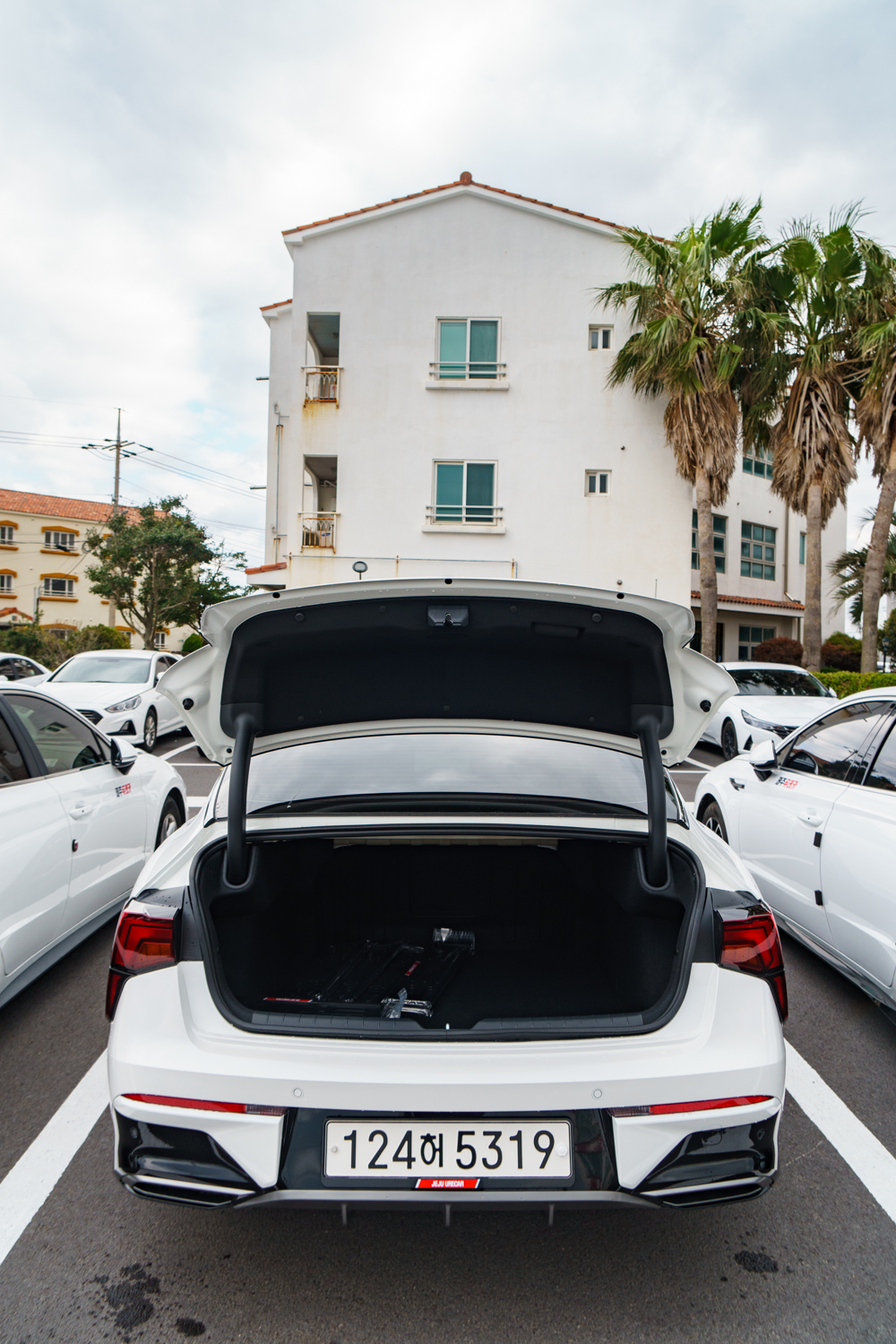 2024 더뉴 K5 페이스리프트 트렁크는 전작과 비교하면 크게 바뀐 점은 없지만 2~3개 여행 캐리어 가방은 충분히 담을 수 있다. 아반떼나 K3보다 차체 크기가 큰 만큼 여유롭게 사용이 가능한 제주공항 렌트카로 여행하는 내내 무척 편리했다.