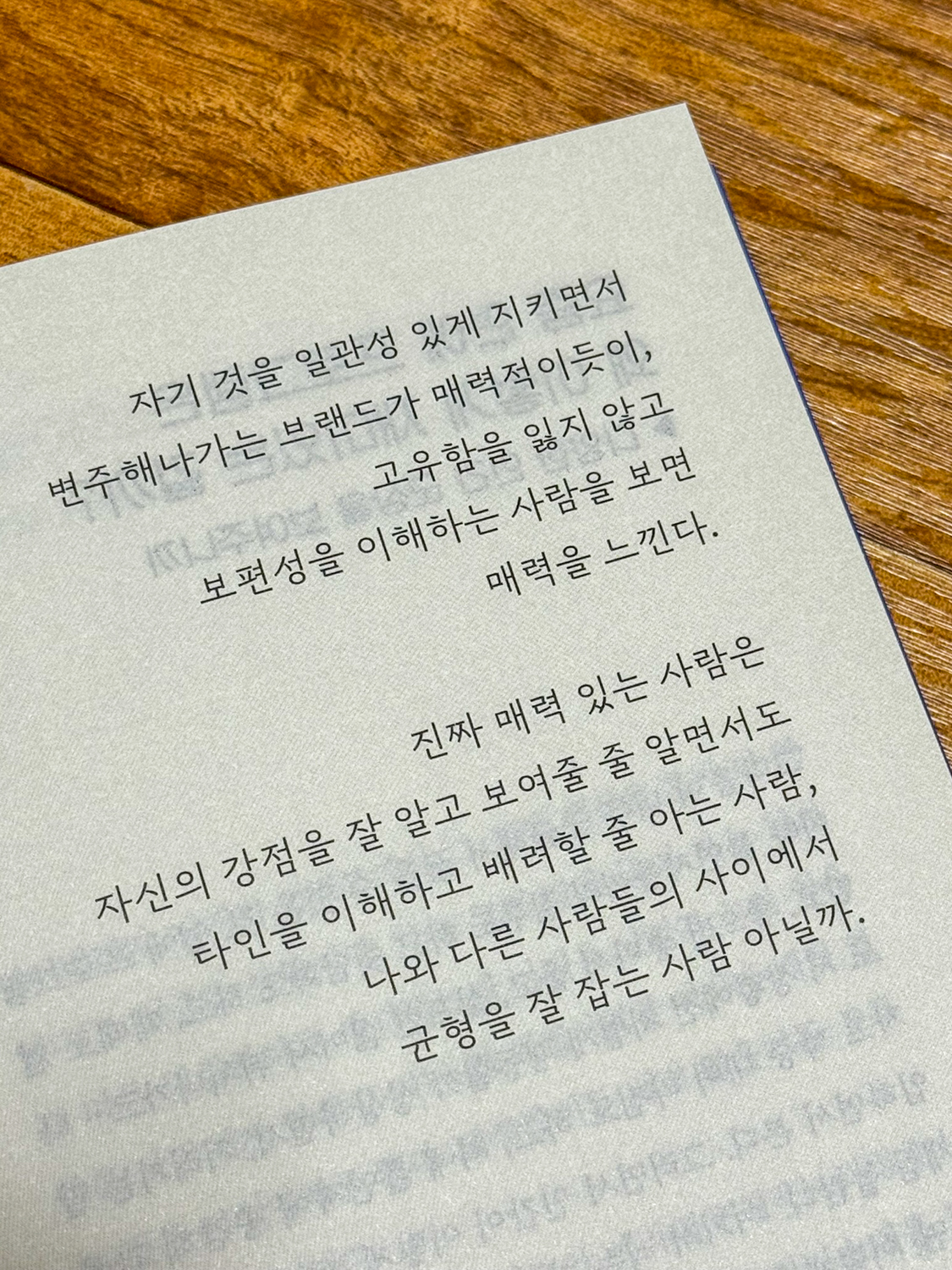 본업, 부업, 취미, 특기처럼 그 사람의 삶 전반에서 볼 수 있고, '그 사람답다'는 말과 닮았다는 점에서 매력은 퍼스널브랜딩과 비슷하게 느껴진다 - 24