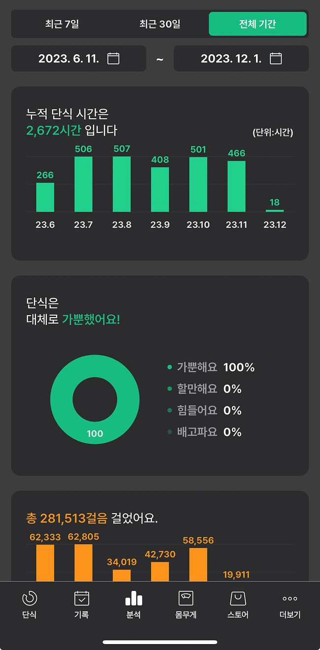 2023년 6월 11일부터 12월 초까지 총 2,600시간 넘게 단식을 하며 체크했던 기록이다. 간헐적단식 방법은 누구든 쉽게 할 수 있고 중간에 실패하더라도 계속해서 할 수 있으며, 하면 할수록 체중감량과 함께 컨디션이 좋아지는 것을 알 수 있기에 다가오는 새해를 맞아 다이어트 계획을 세우는 분들이라면 18시간 혹은 16시간으로 단식에 도전해보자.
