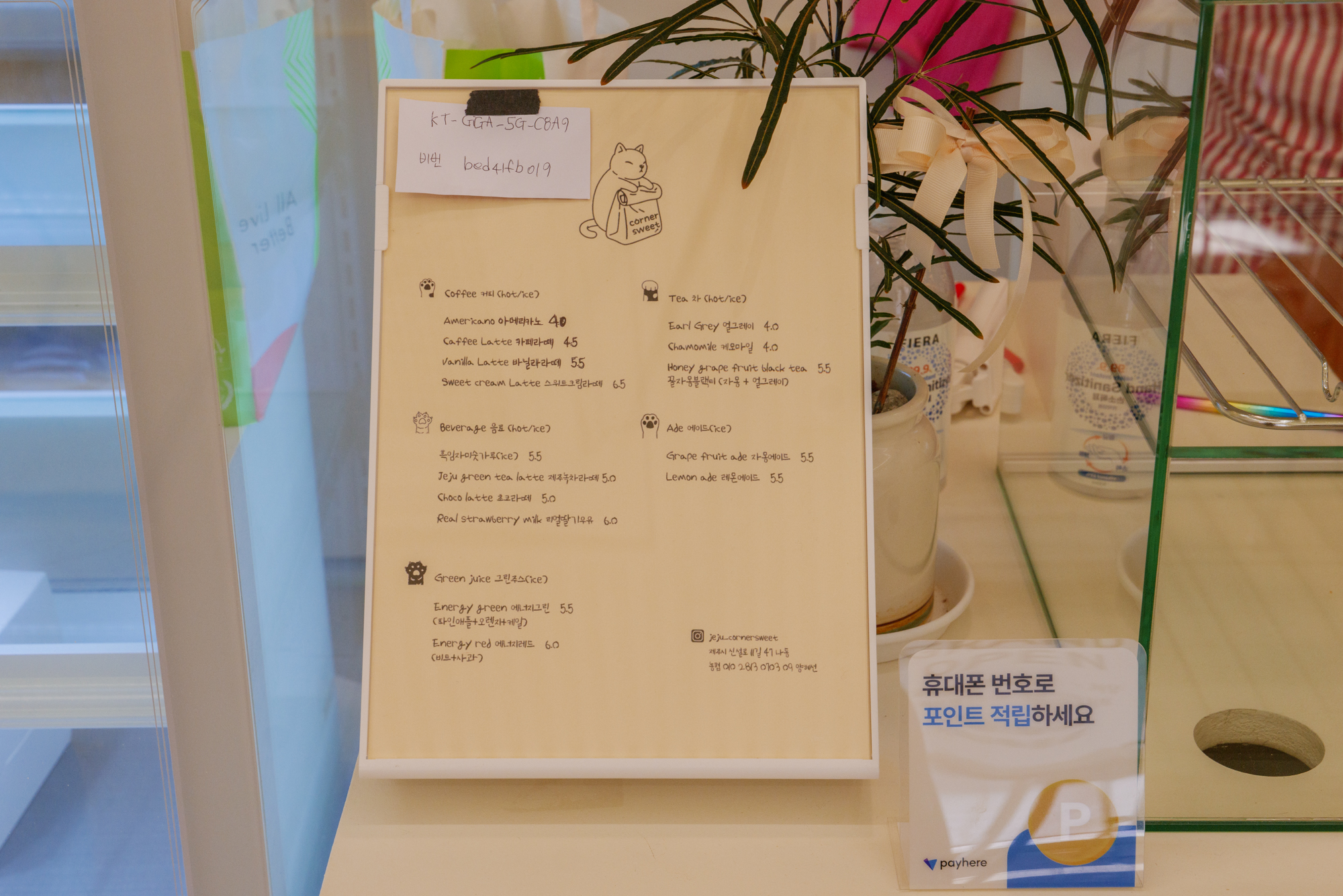 미리 예약했던 케이크를 픽업하기 전 제주 케이크 맛집 코너스윗을 소개할 겸 내부 사진을 담아봤다. 아늑하고 따듯한 공간으로 여러 테이블을 갖추고 있어 케이크뿐만 아니라 커피와 치즈타르트, 초코타르트, 호두타르트 등을 먹으면서 시간을 보내기에도 좋았다.