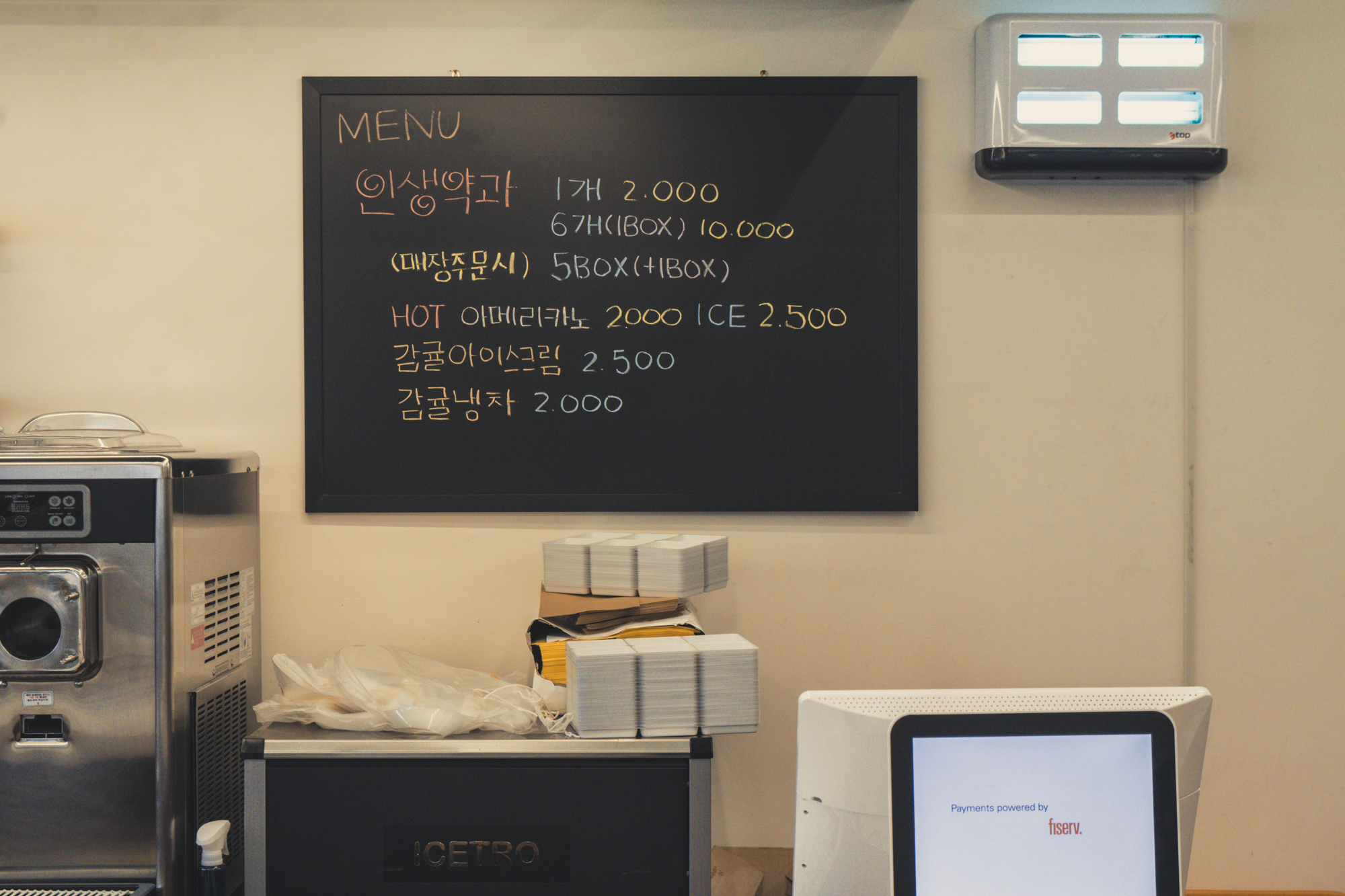 제주 인생약과에서 약과를 주문하고 기다리는 동안 마셨던 아메리카노 또한 진한 풍미가 느껴졌다. 아메리카노 한잔 가격은 2,000원인데 시중에 있는 다른 카페의 커피와 비교해도 손색없었다.