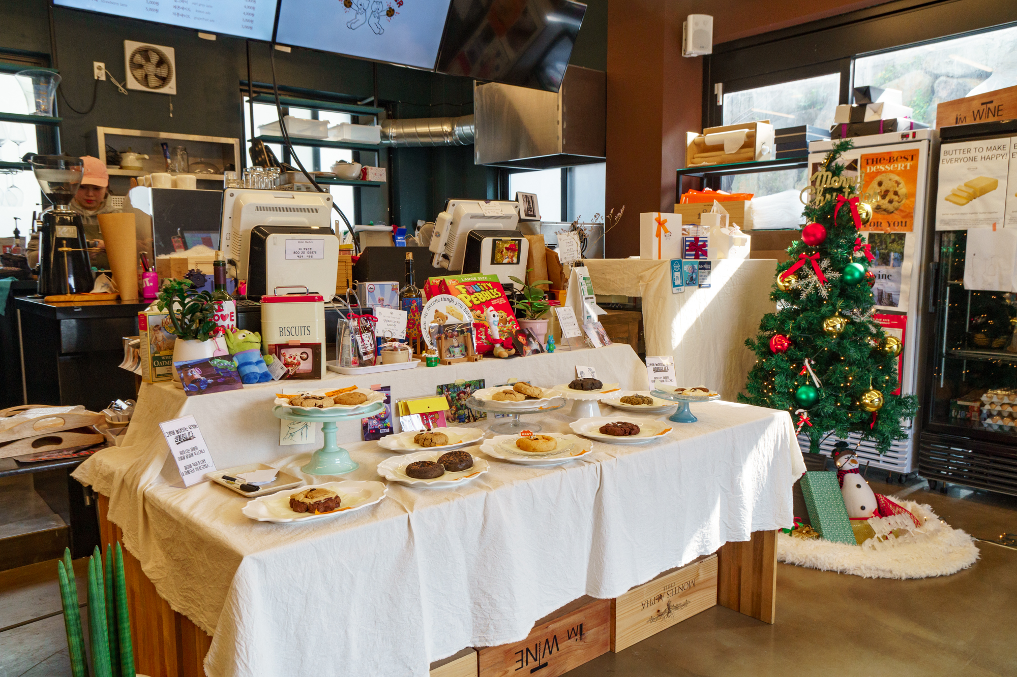 크리스마스 트리가 설치된 매장 안에는 쿠키를 주문하고 기다리는 동안 편하게 앉을 수 있는 테이블이 마련되어 있으며 수제 쿠키 전문점답게 곳곳에 쿠키를 담은 포스터로 공간이 꾸며져 있어 눈길을 사로잡았다.