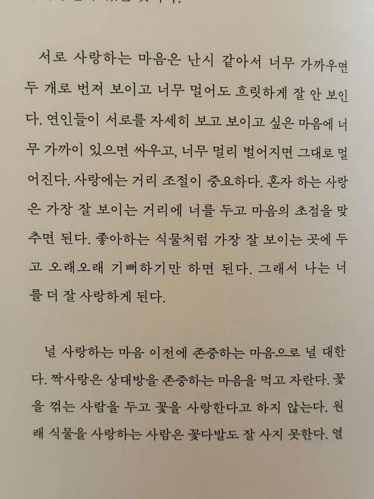 사랑에는 거리 조절이 중요하다. 혼자 하는 사랑은 가장 잘 보이는 거리에 너를 두고 마음의 초점을 맞추면 된다. 좋아하는 식물처럼 가장 잘 보이는 곳에 두고 오래오래 기뻐하기만 하면 된다. 그래서 나는 너를 더 잘 사랑하게 된다.