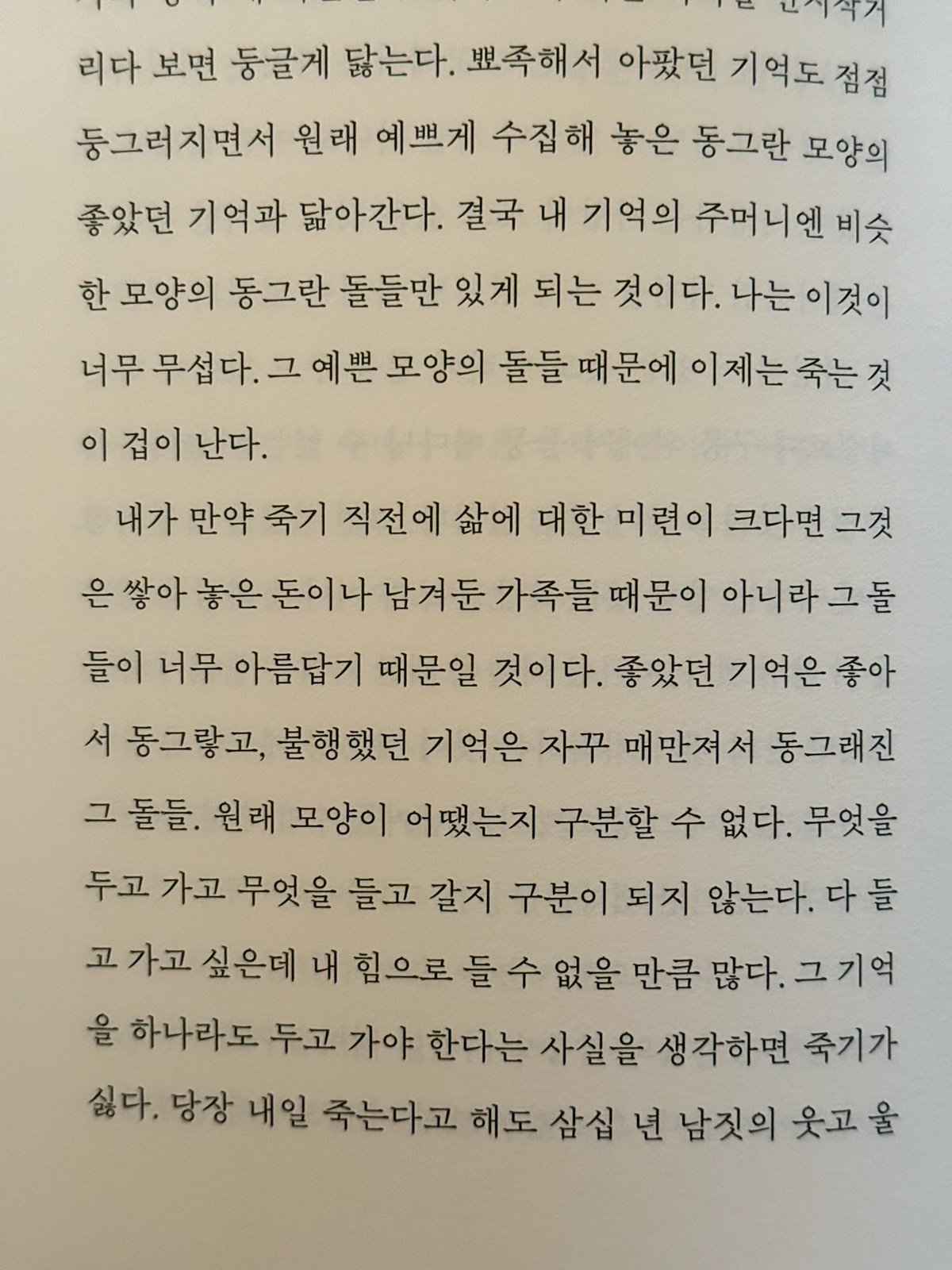 좋았던 기억은 좋아서 동그랗고, 불행했던 기억은 자꾸 매만져서 동그래진 그 돌들, 원래 모양이 어땠는지 구분할 수 없다. 무엇을 두고 가고 무엇을 두고 갈지 구분이 되지 않는다.