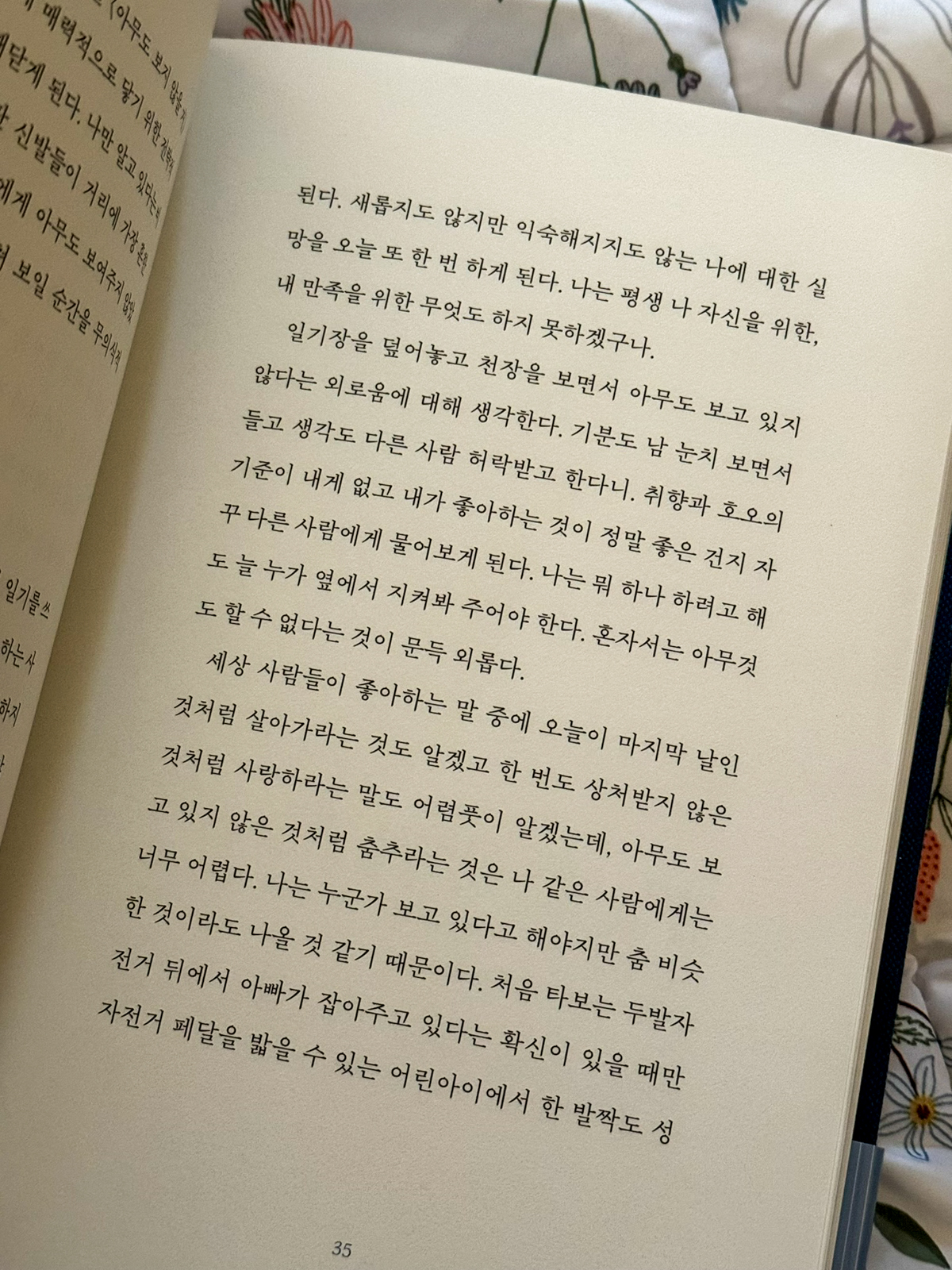 일기장을 덮어놓고 천장을 보면서 아무도 보고 있지 않다는 외로움에 대해 생각한다. 기분도 남 눈치 보면서 들고 생각도 다른 사람 허락받고 하다니.