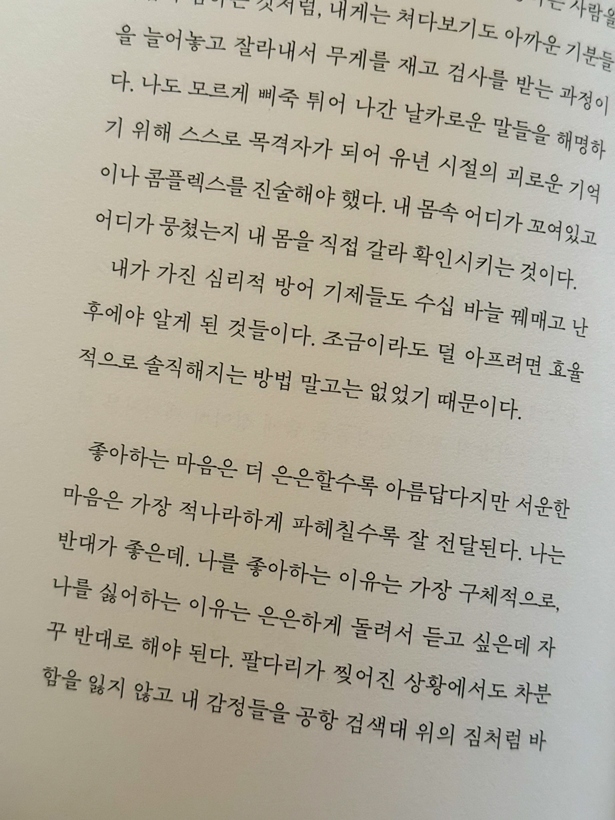 팔다리가 찢어진 상황에서도 차분함을 잃지 않고 내 감정들을 공항 검색대 위에 짐처럼 바리바리 다 꺼내 놓아야만 이해 받을 수 있다는 사실이 아직도 매번 서글프다.