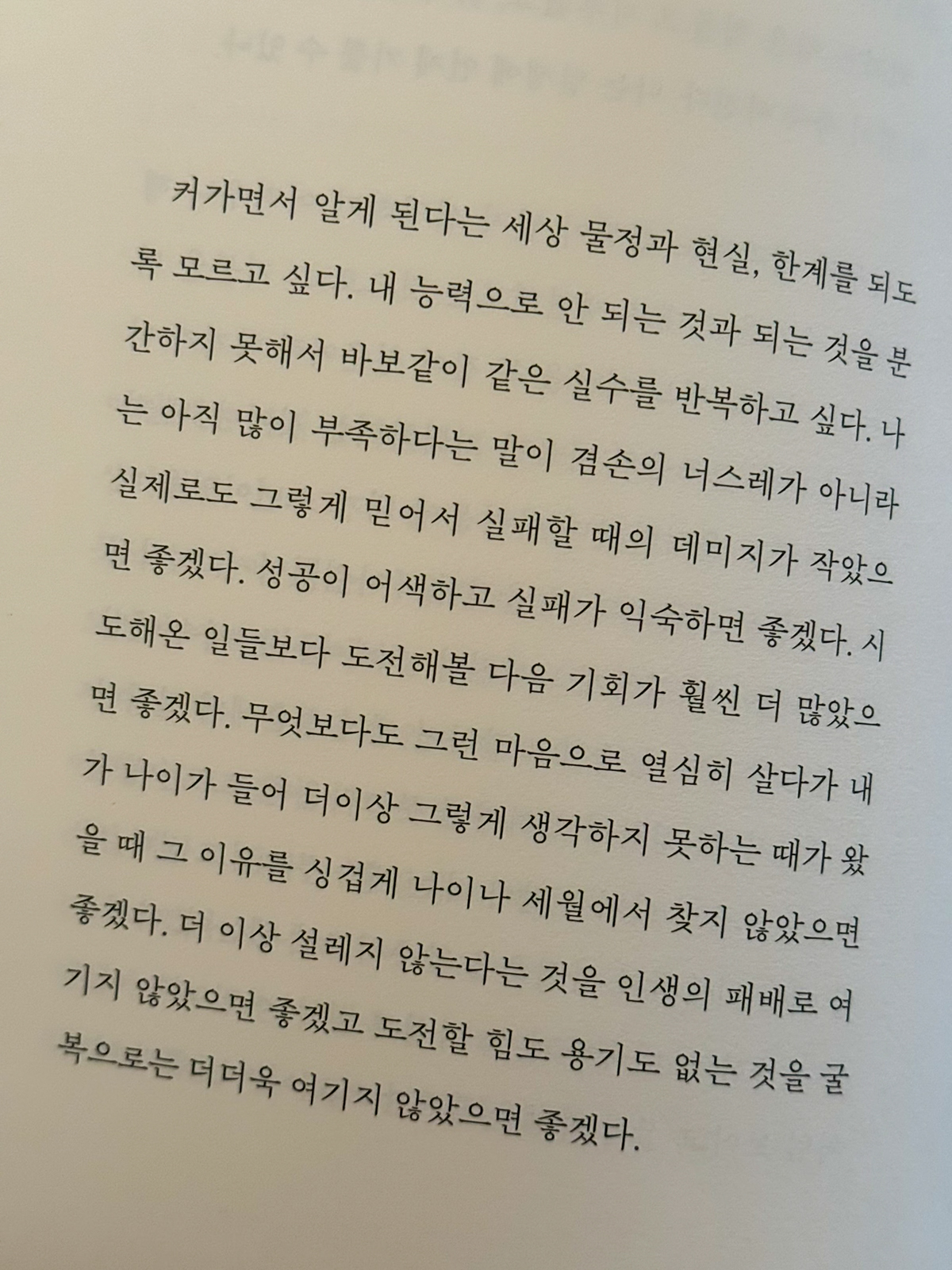 시도해온 일들보다 도전해볼 다음 기회가 훨씬 더 많았으면 좋겠다. 무엇보다도 그런 마음으로 열심히 살다가 내가 나이가 들어 더이상 그렇게 생각하지 못하는 때가 왔을 때 그 이유를 싱겁게 나이나 세월에서 찾지 않았으면 좋겠다.