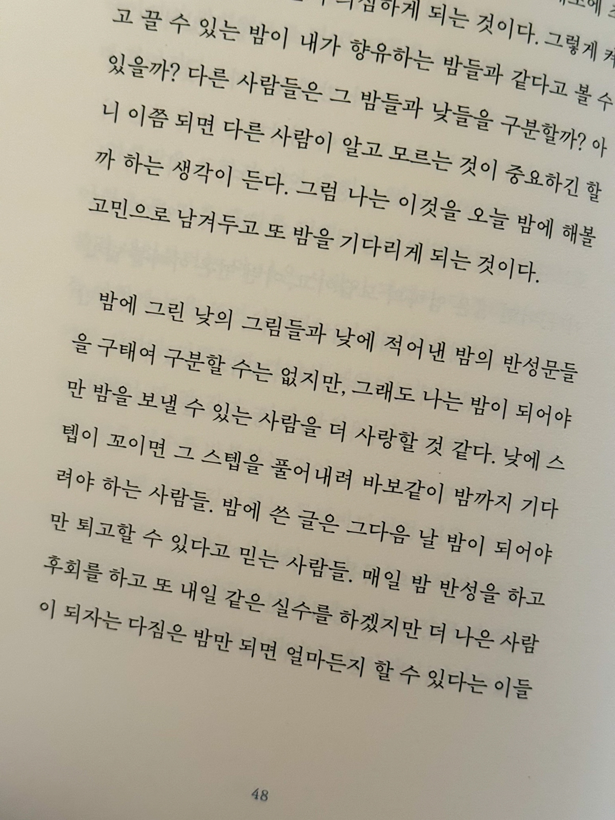 밤에 그린 낮의 그림들과 낮에 적어낸 밤의 반성문들을 구태여 구분할 수는 없지만, 그래도 나는 밤이 되어야만 밤을 보낼 수 있는 사람을 더 사랑할 것 같다.