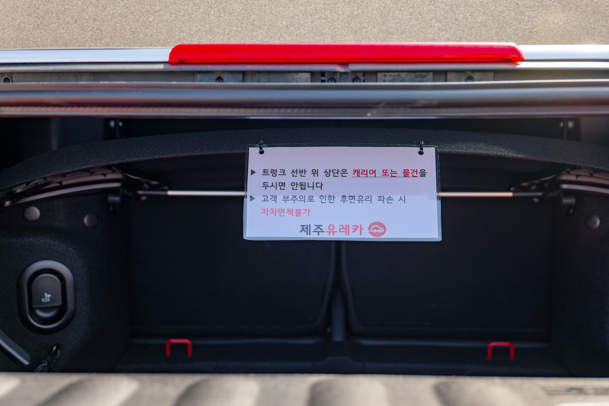 트렁크 공간은 일반 승용차와 비교하면 용량이 크지 않다. 참고로 제주도 오픈카 렌트카 개방 시 트렁크 선반 위 상단에 캐리어 가방이나 물건을 둘 경우 후면 유리가 파손될 수 있고 완전자차 보험을 들더라도 면책이 적용되지 않기에 반드시 수납공간에만 소집품을 보관해야 한다.