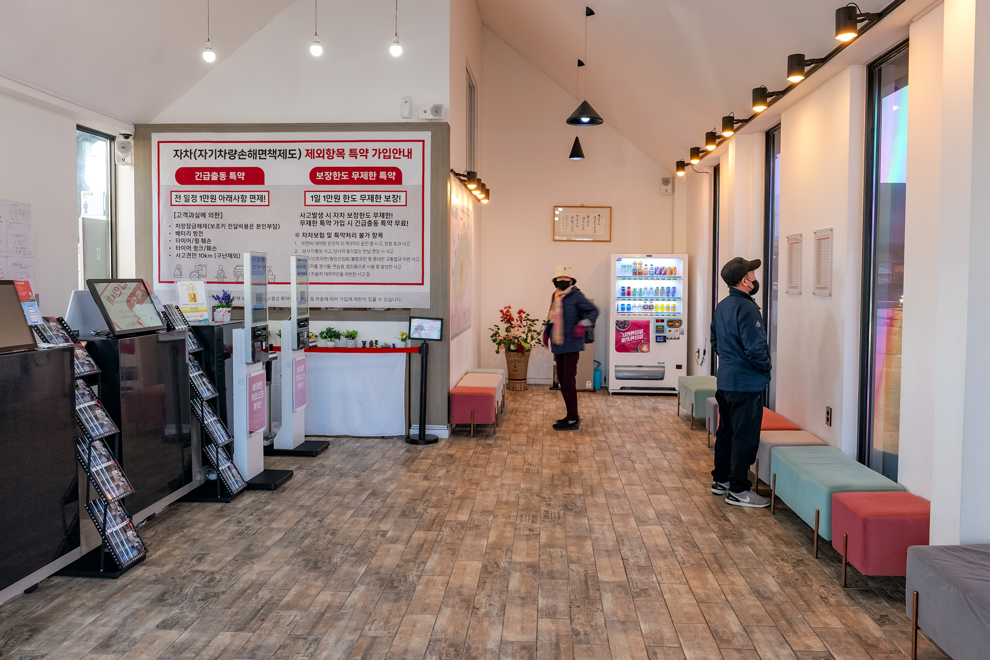 차고지에 도착했다면 라운지에 있는 데스크 직원의 안내에 따라 운전면허증을 내고 제주속으로에서 예약했던 제주도 오픈카 렌트카 가격 내역을 확인한 후 완전자차 보험에 대한 설명을 듣고 모니터에 서명하면 된다.
