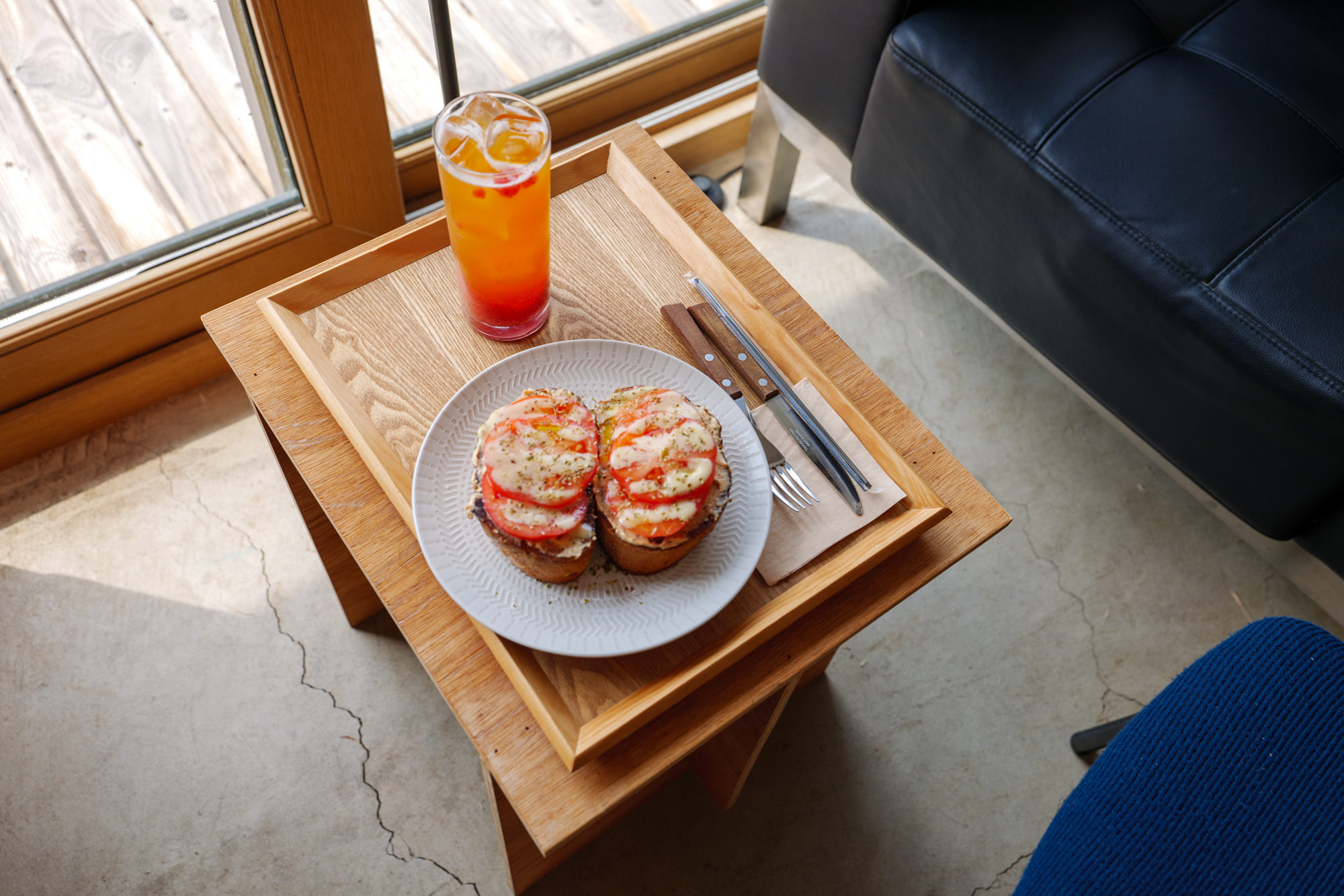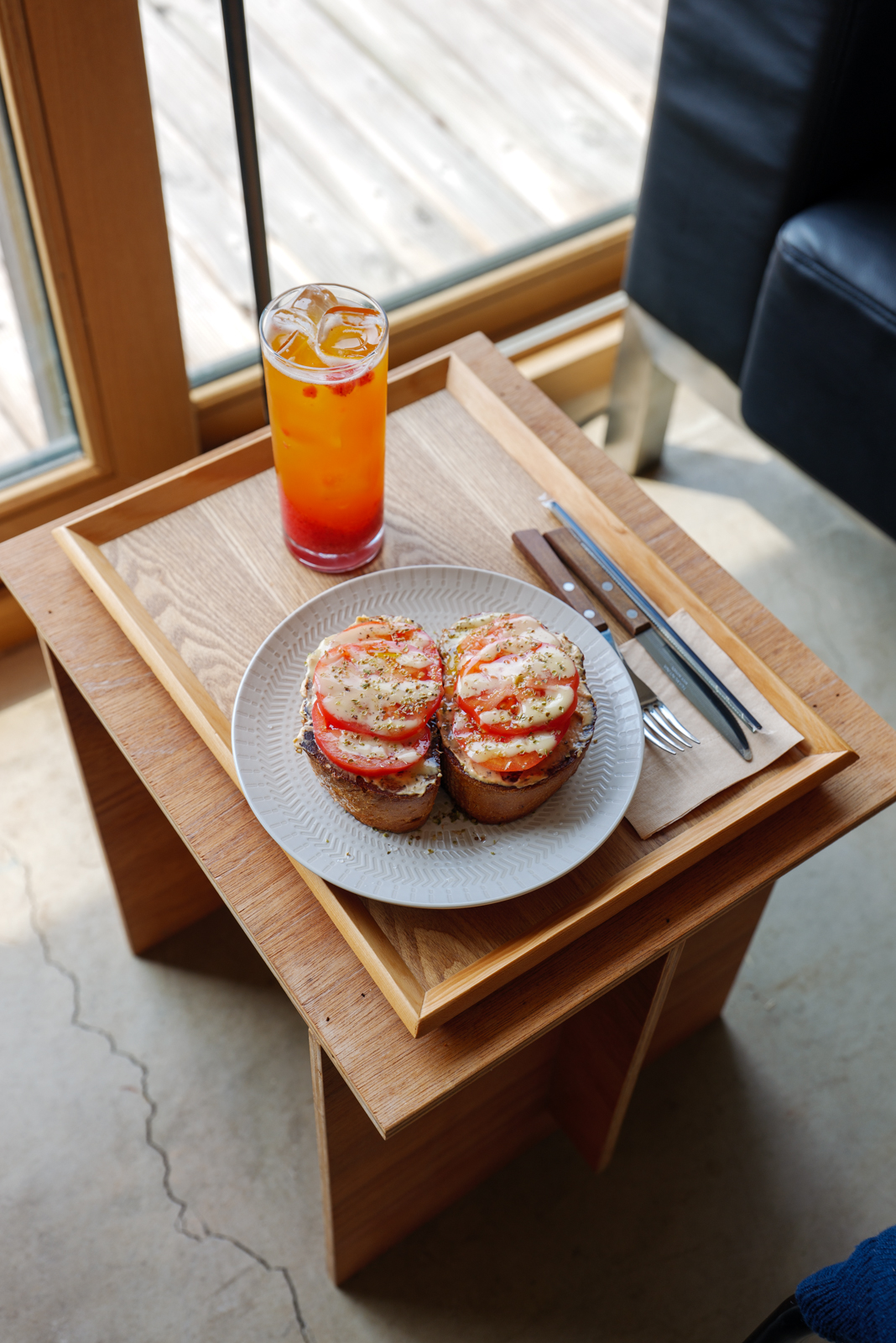 제주 애월 가볼만한곳 그라운드폴 카페에서 시그니처 음료인 폴만다린과 함께 점심식사 대용으로 토마토 바질토스트를 주문해서 먹었다.