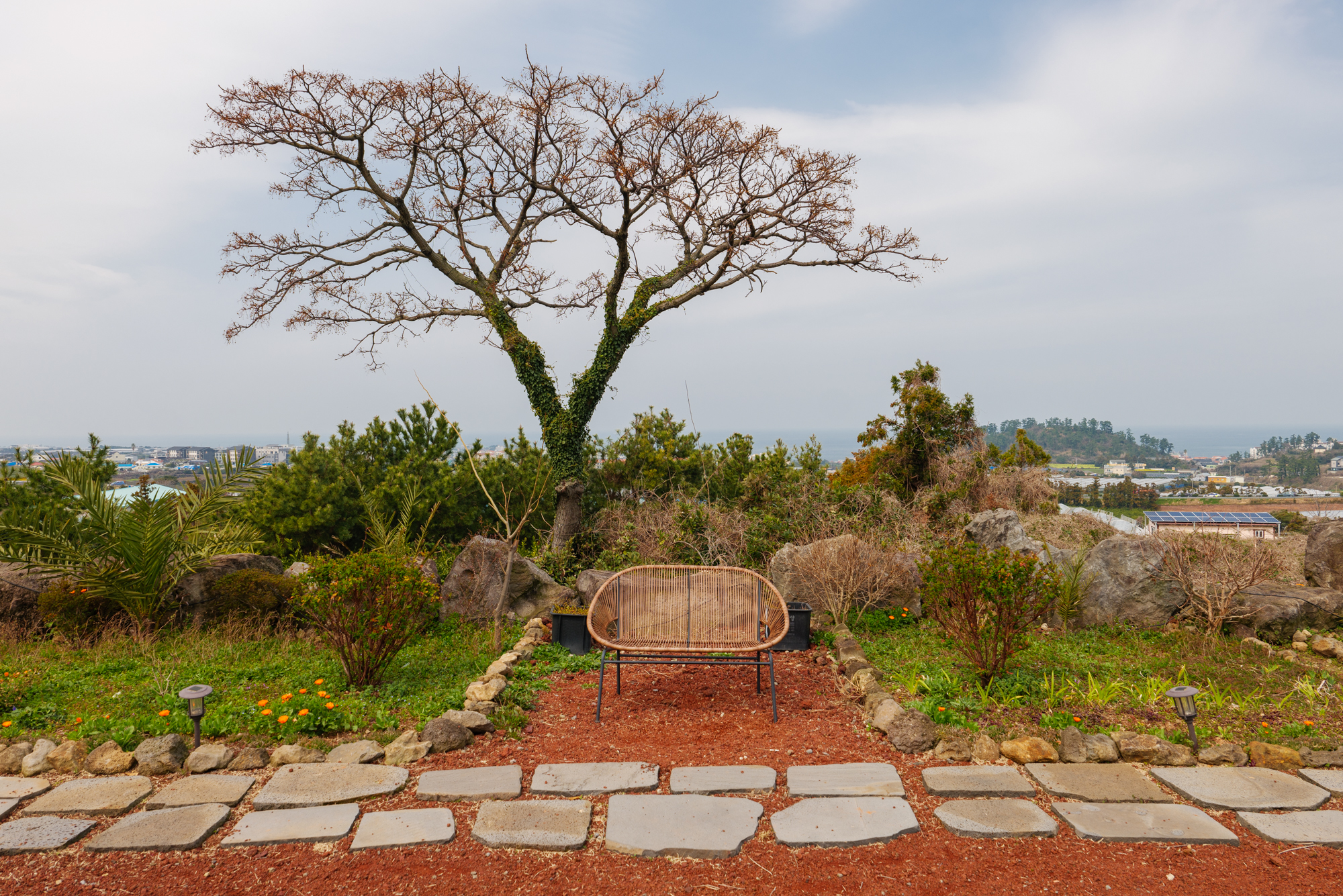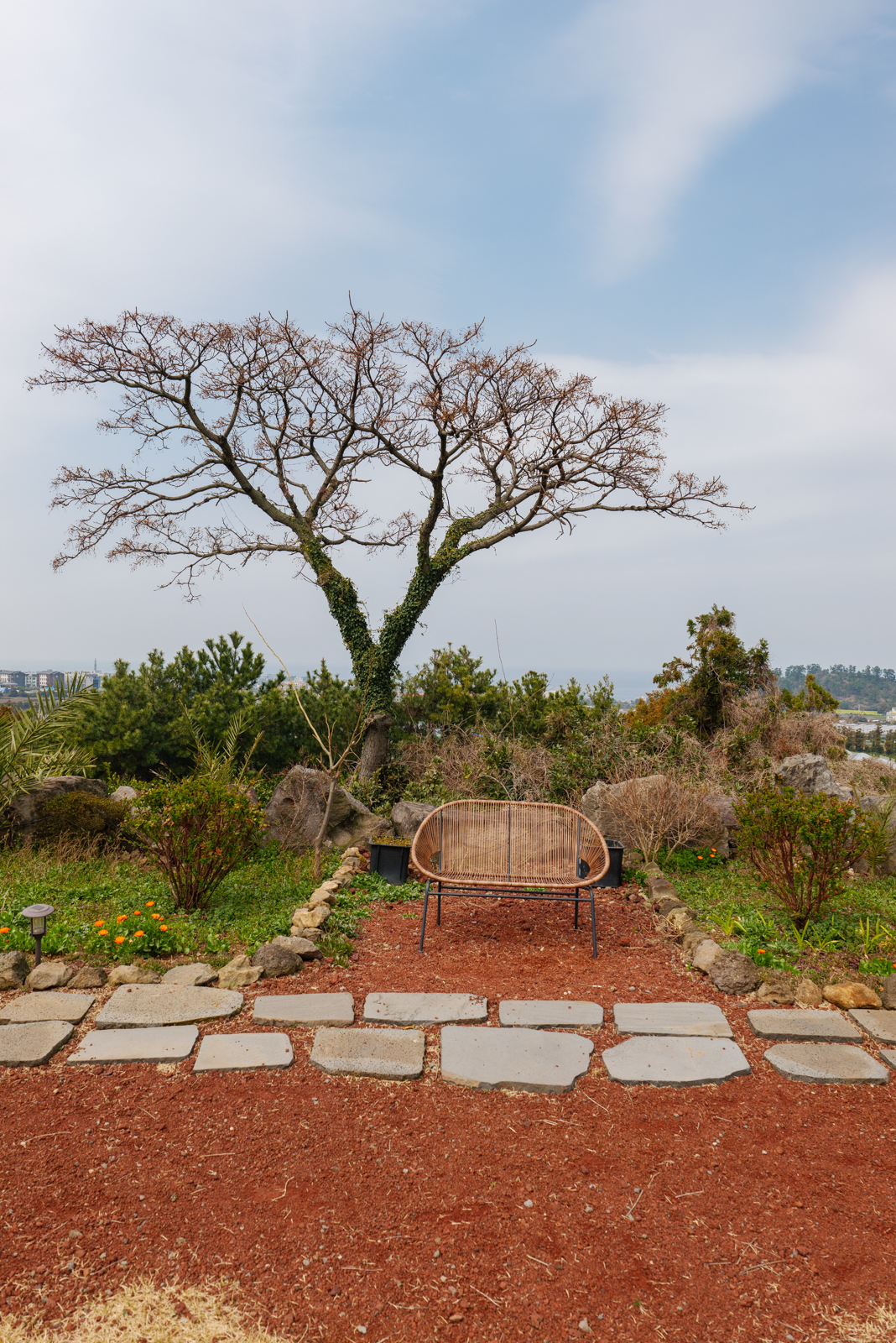 또한 카페로 들어가는 길 옆에는 나홀로나무와 함께 벤치에 앉아 뒤로 보이는 오름과 바다를 배경으로 사진을 찍을 수 있는 포토존도 마련되어 있었다.