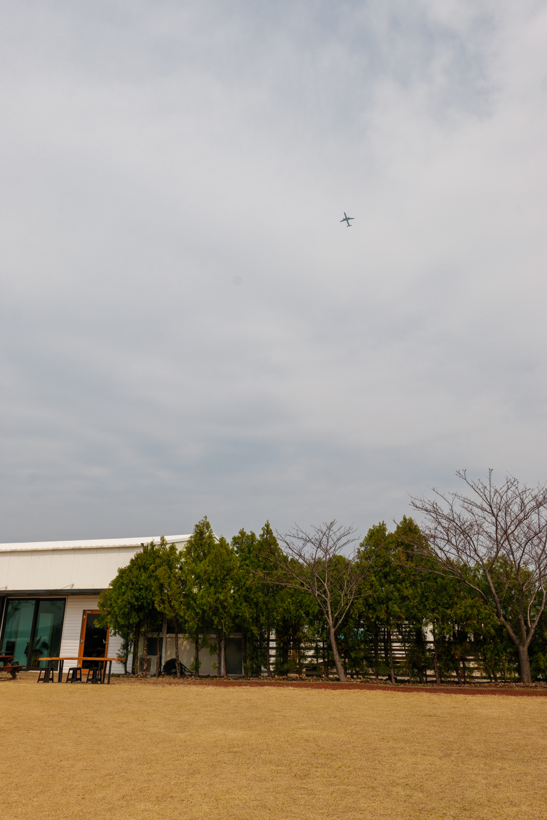 제주 애월 그라운드폴 카페는 제주공항에서 멀지 않은 거리에 있어 5~10분 마다 하늘 위로 비행기가 뜨는 모습을 만나볼 수 있는 장소이기도 하다.