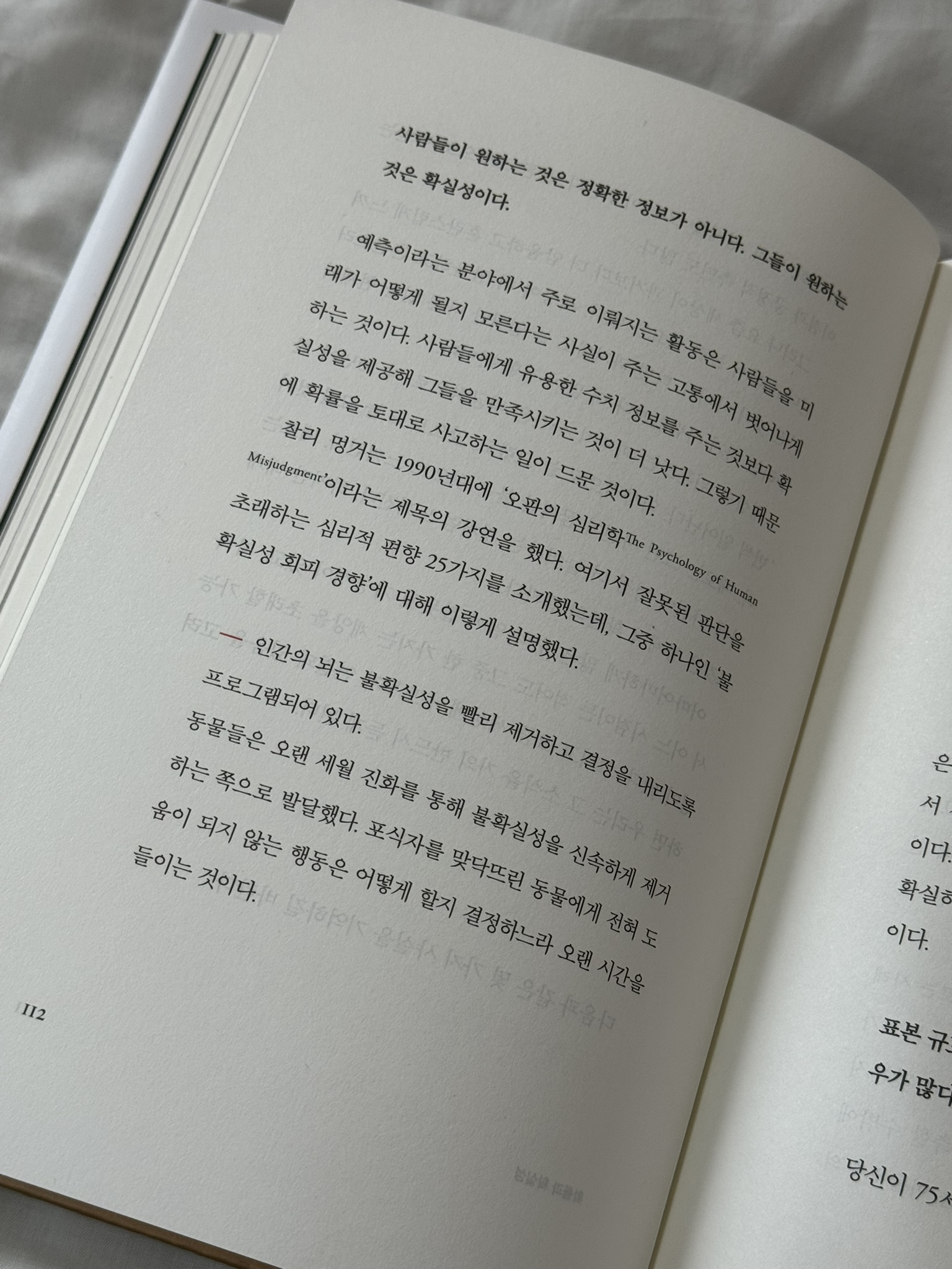 예측이라는 분야에서 주로 이뤄지는 활동은 사람들을 미래가 어떻게 될지 모른다는 사실이 주는 고통에서 벗어나게 하는 것이다. 사람들에게 유용한 수치 정보를 주는 것보다 확실성을 제공해 그들을 만족시키는 것이 더 낫다. 그렇기 때문에 확률을 토대로 사고하는 일이 드문 것이다 - 112