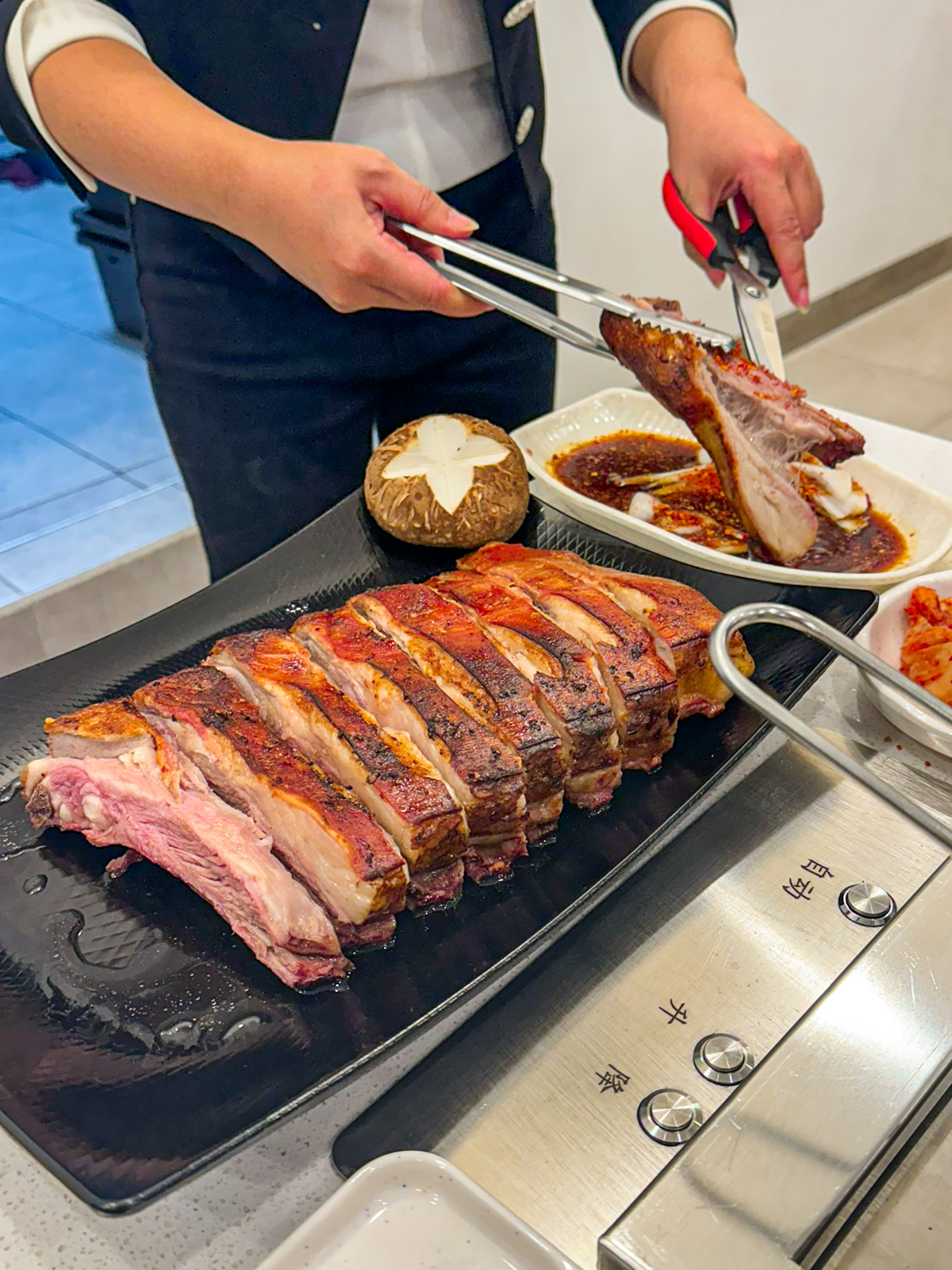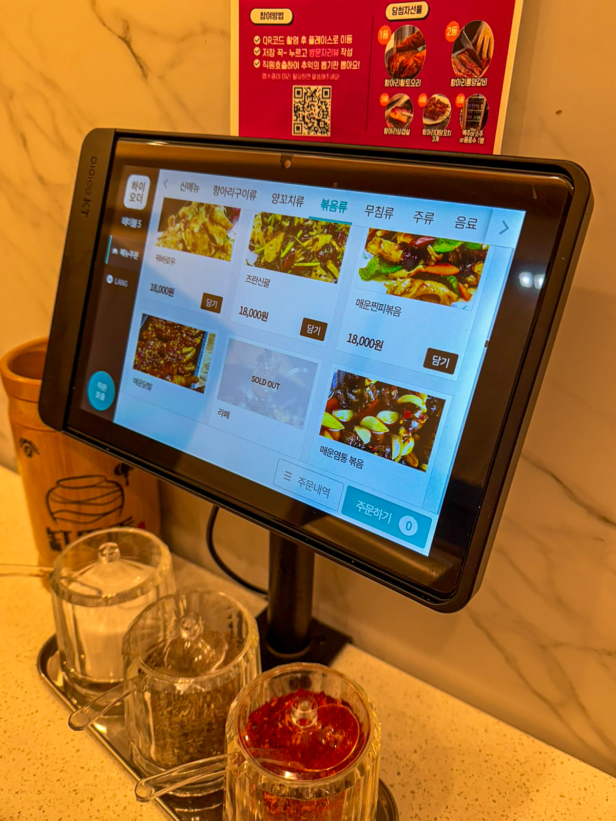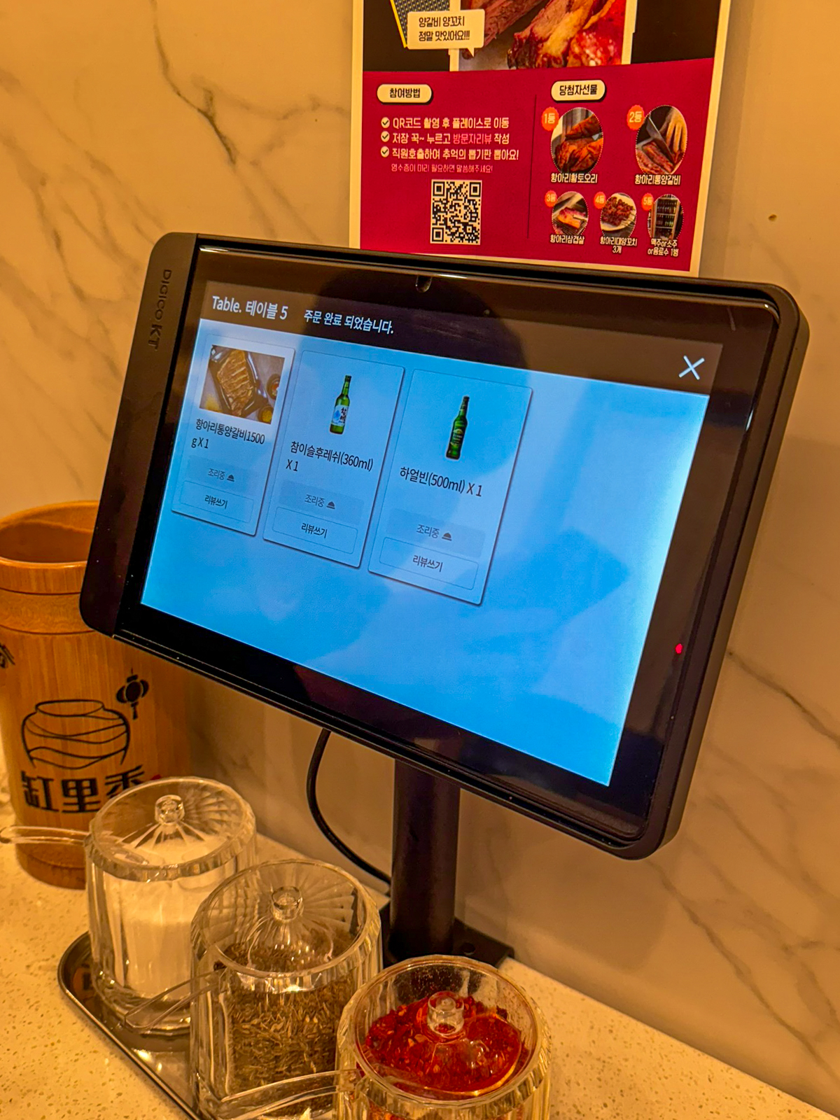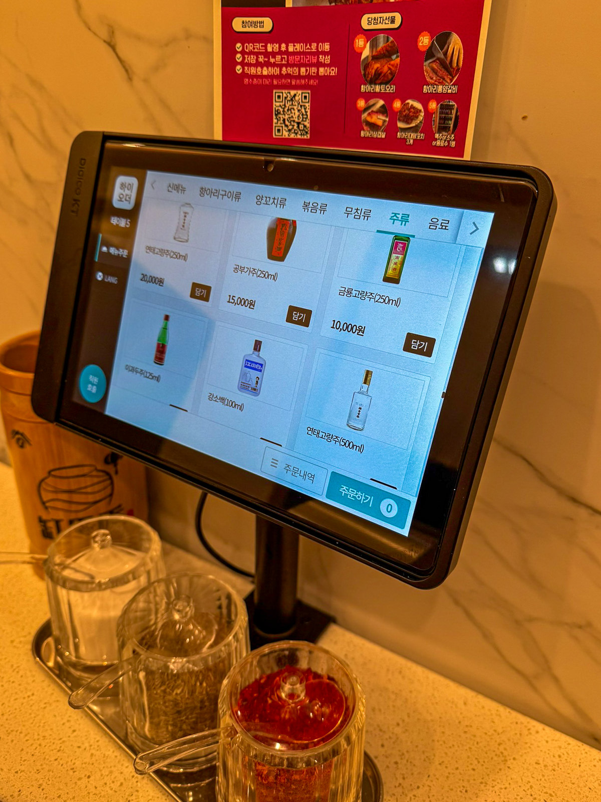 그랜드하얏트 제주 노형 강리향에 갔던 날에는 친구와 함께 먹을 1.5kg짜리 항아리 통양갈비와 소주, 맥주를 키오스크로 주문했다.