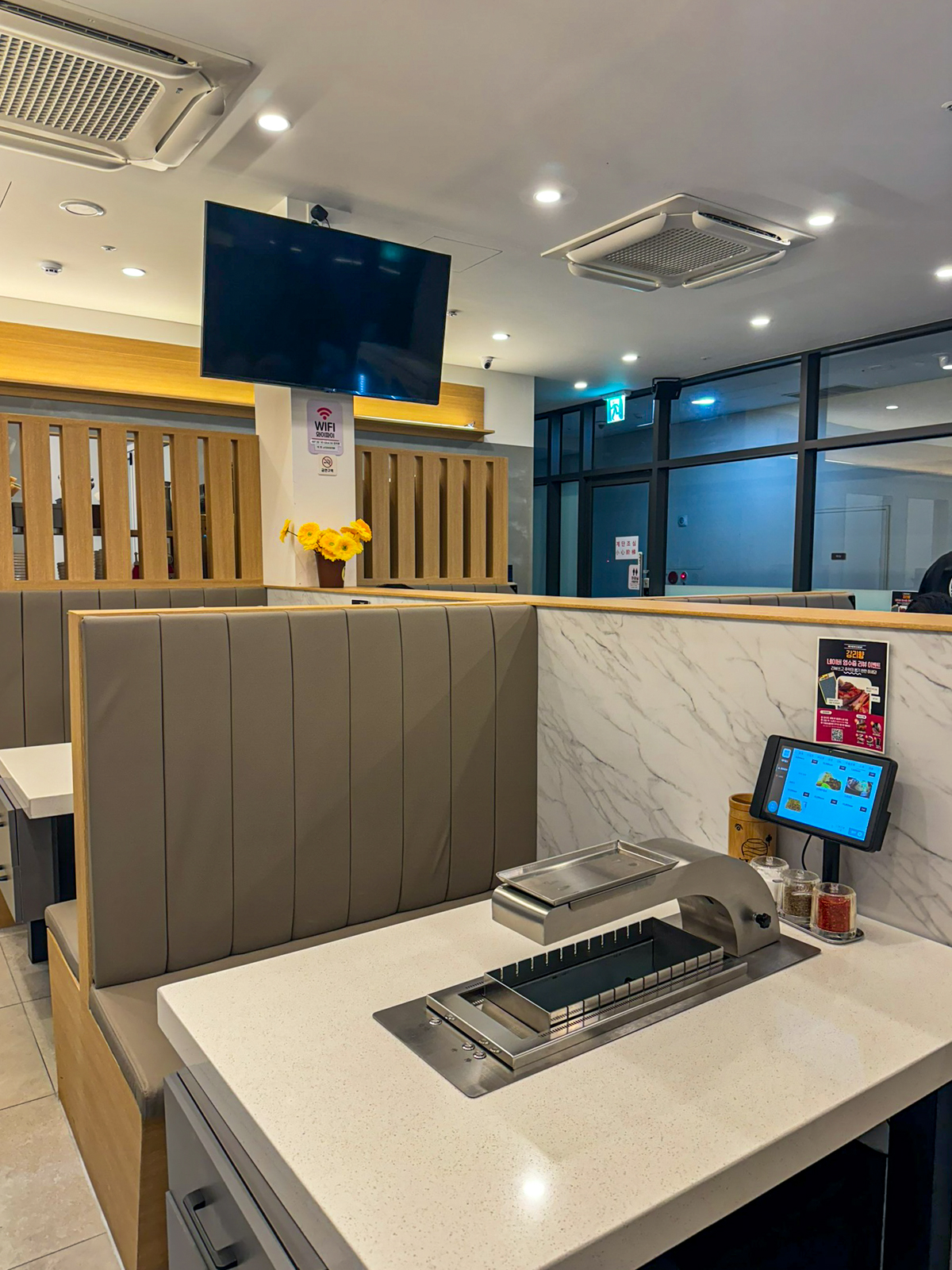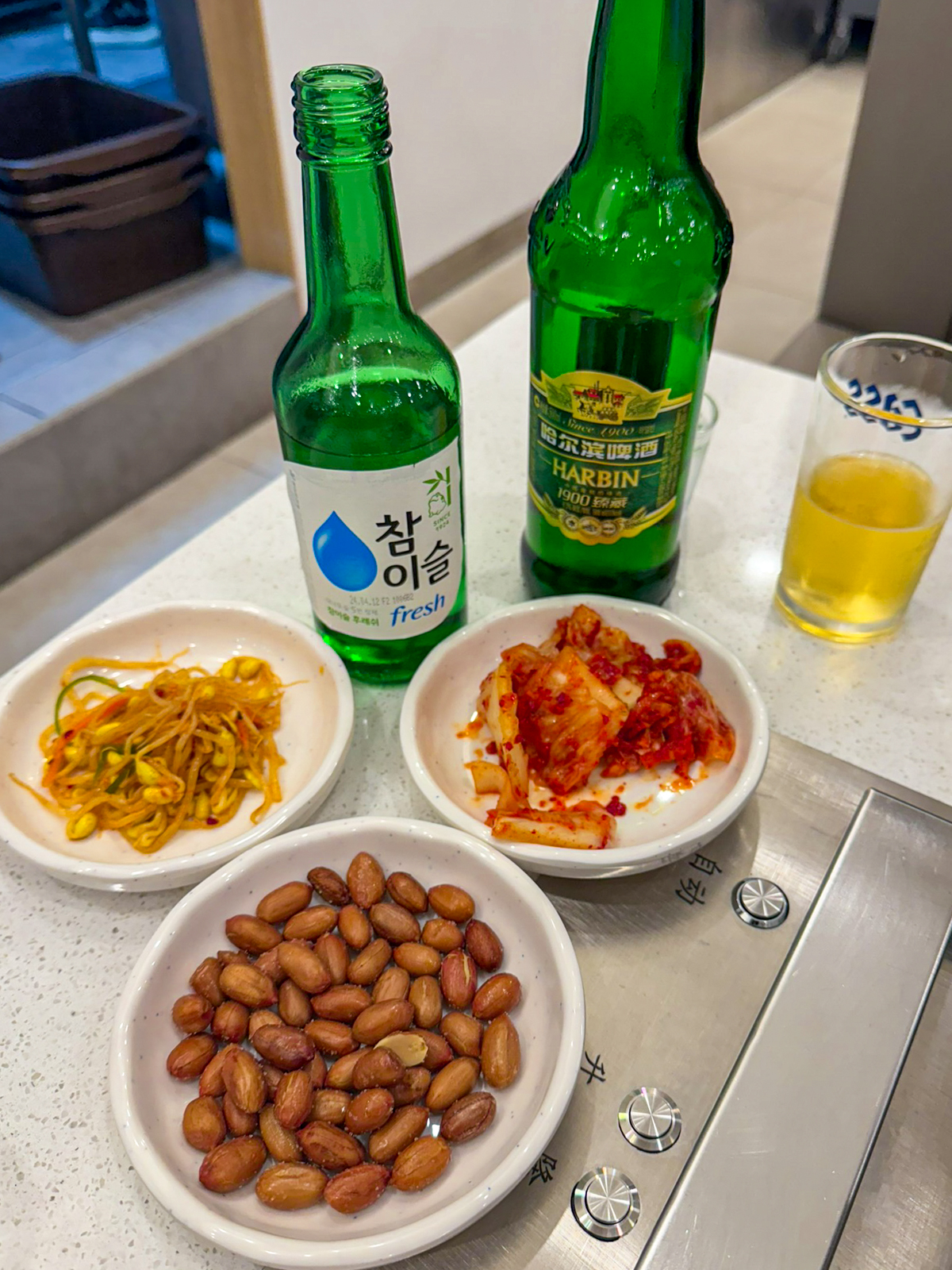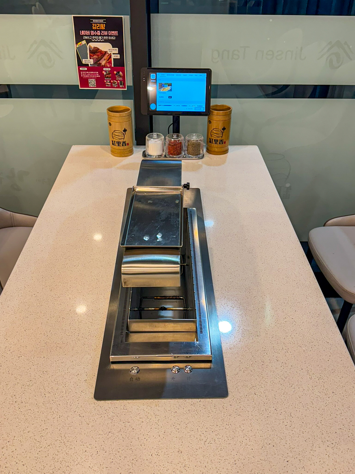 테이블이 대리석으로 제작되어 더욱 깔끔했으며 테이블 옆 수납공간에는 물컵, 유리컵, 소주잔, 물티슈, 수저통, 휴지가 있어 직원을 따로 부르지 않고 사용할 수 있어서 더 편리했다.