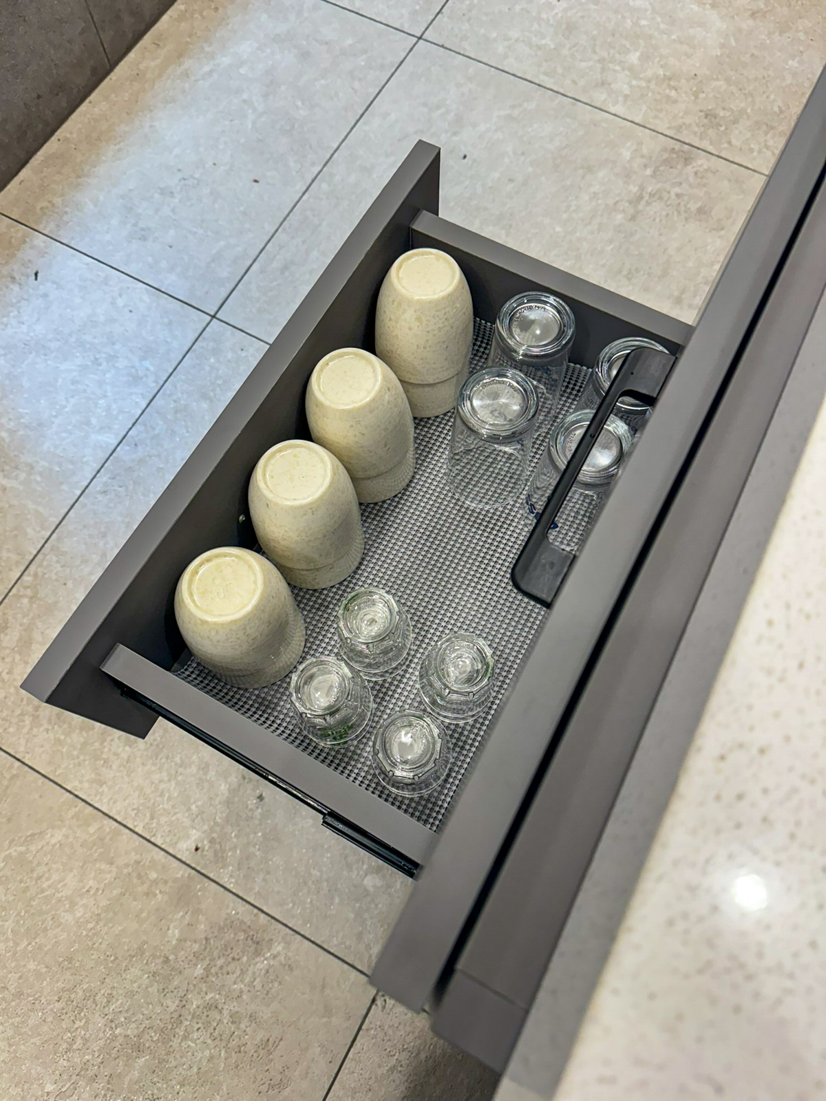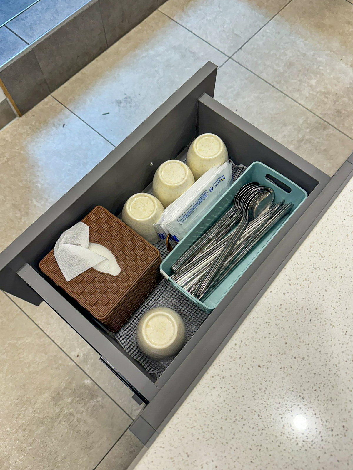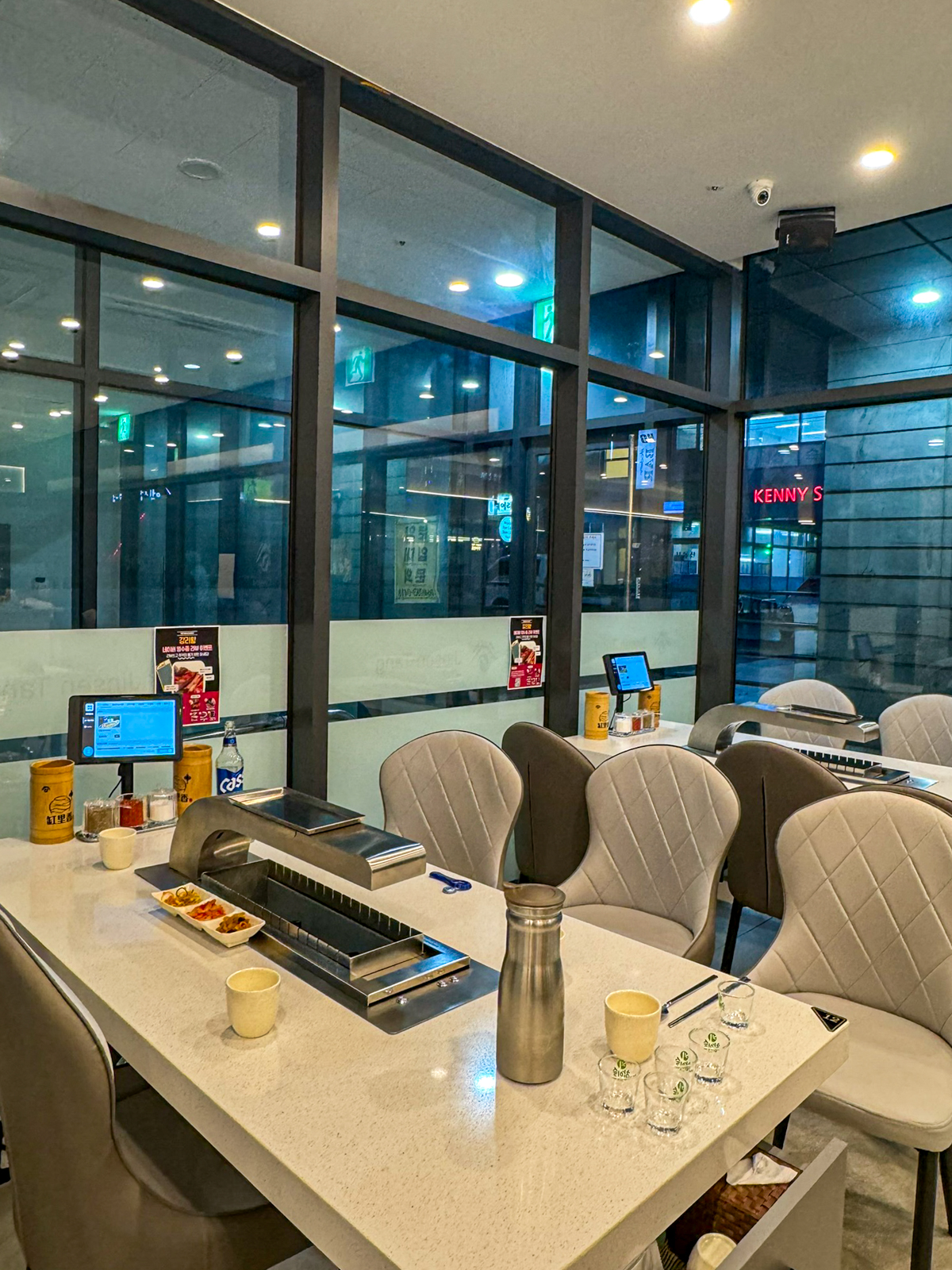 테이블이 대리석으로 제작되어 더욱 깔끔했으며 테이블 옆 수납공간에는 물컵, 유리컵, 소주잔, 물티슈, 수저통, 휴지가 있어 직원을 따로 부르지 않고 사용할 수 있어서 더 편리했다.