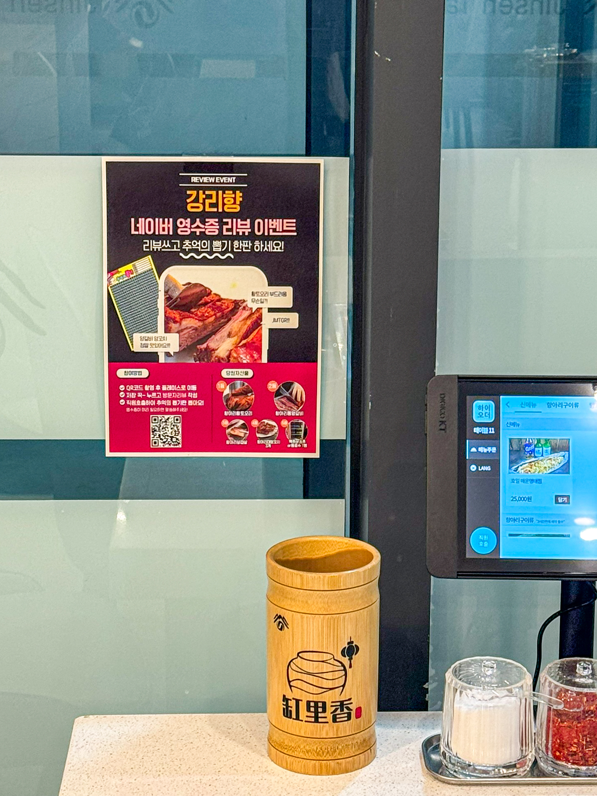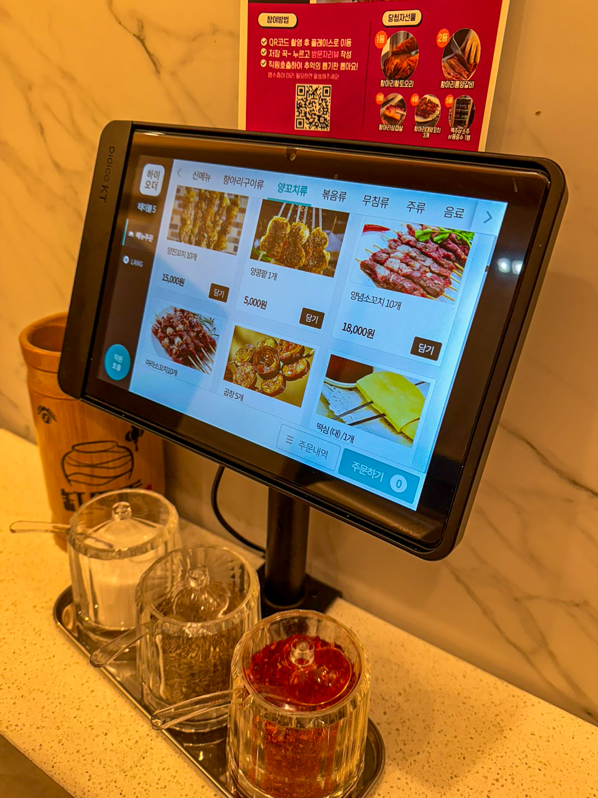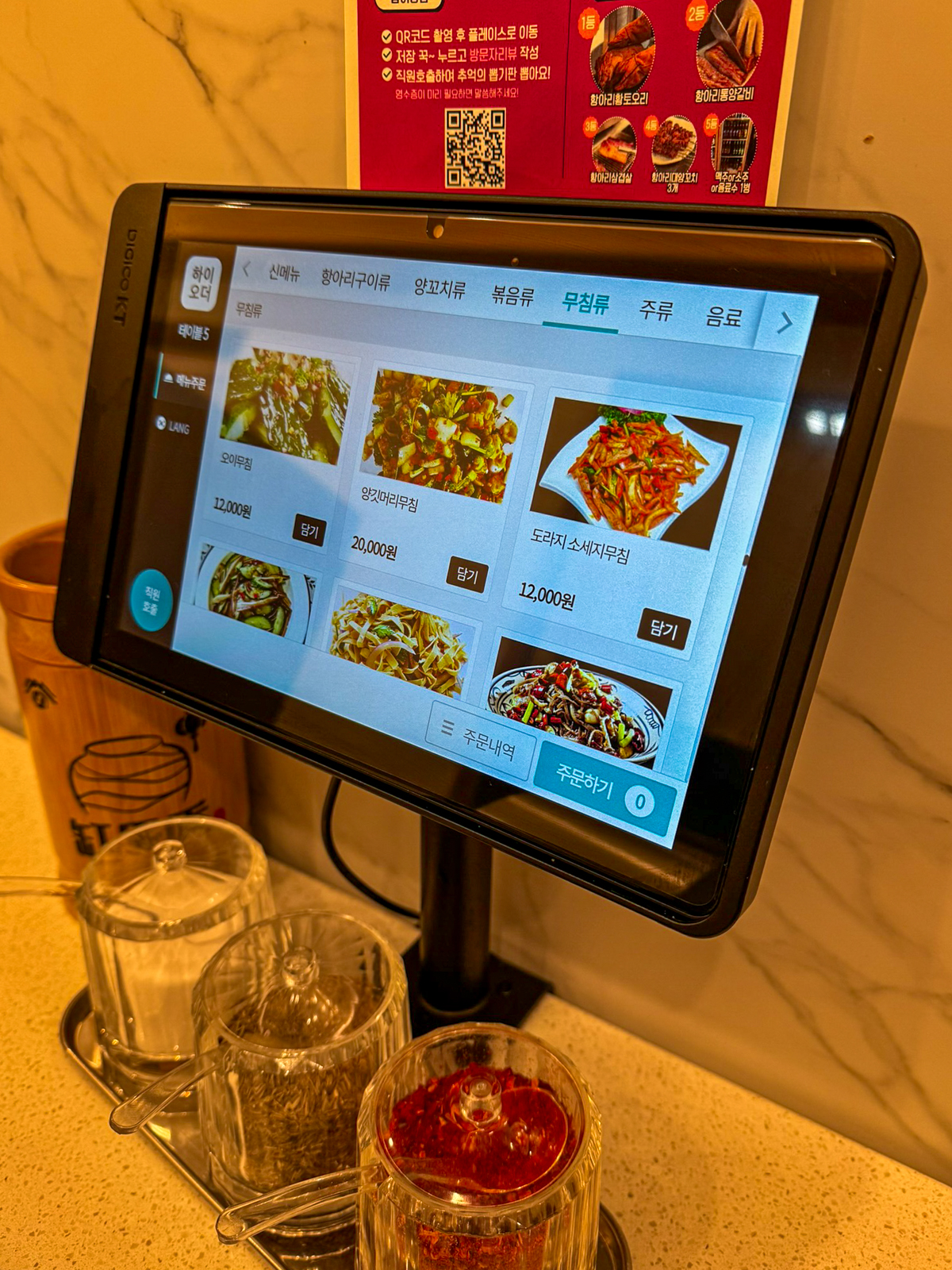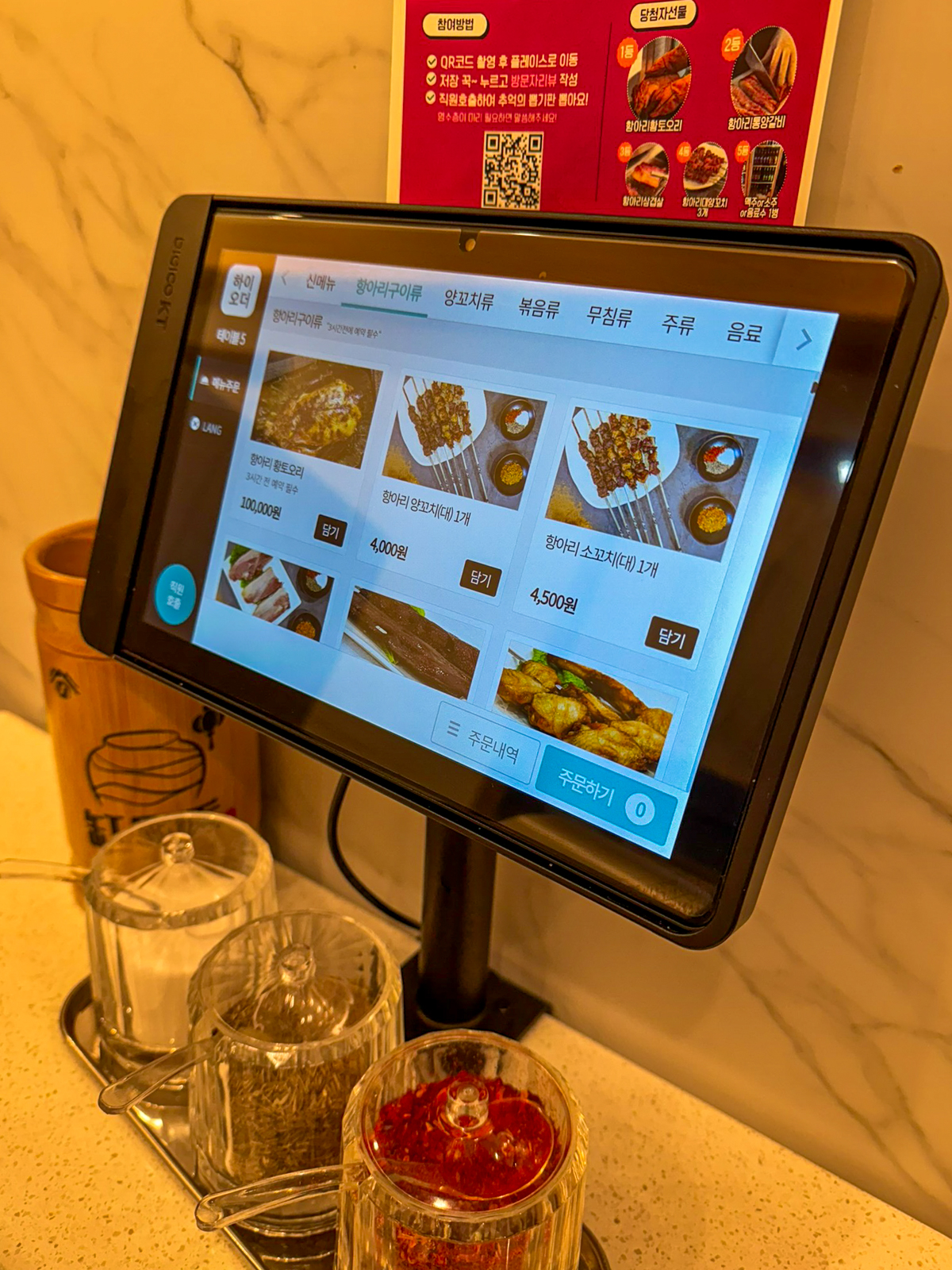 제주도 맛집 현지인 추천 노형 강리향은 키오스크 무인단말기를 통해 메뉴를 주문할 수 있으며 항아리구이, 양꼬치, 볶음요리, 무침요리 등을 주문할 수 있다.