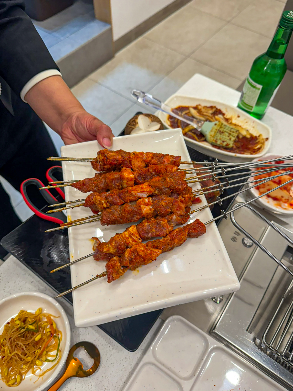 통양갈비와 함께 제주 양고기 맛집 노형 강리향의 대표메뉴인 양꼬치는 양념으로 주문해봤다. 양갈비를 구웠던 판을 교체하고 직접 꼬치를 올려서 먹었는데 마찬가지로 느끼하지 않고 특유의 양념맛이 좋아 개인적으로 입맛에 맞았다.