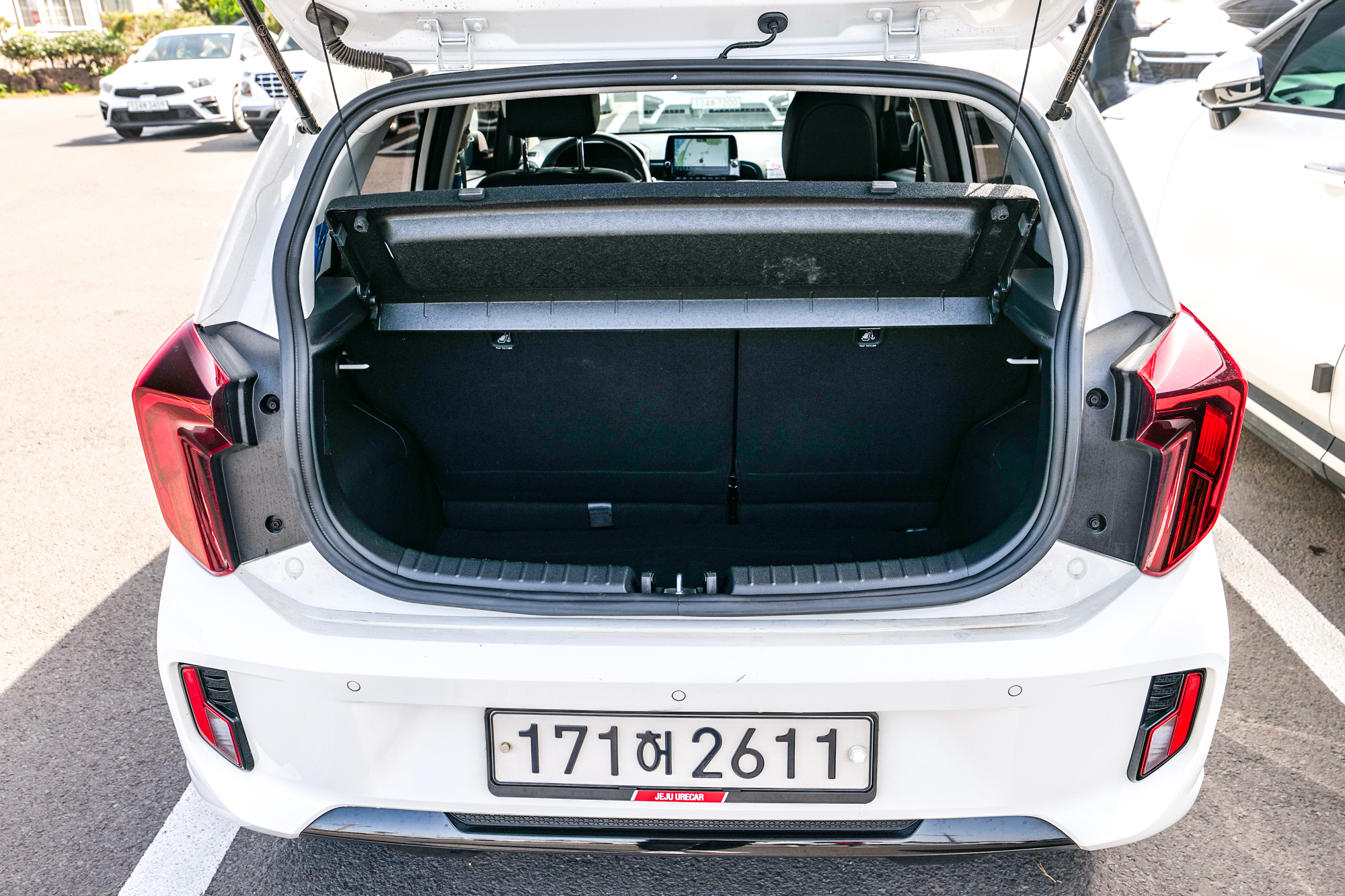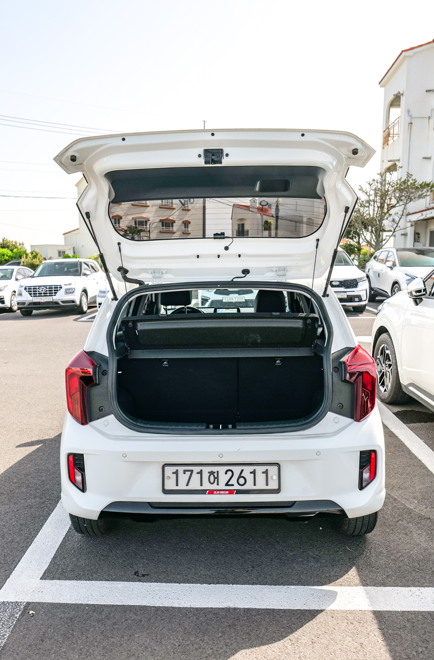 트렁크 공간은 캐리어 가방 2개 정도 들어가며 이외 다른 짐을 보관하기에도 편리하다. 경차인 만큼 다른 중소형차보다 공간은 작지만 혼자 제주도 여행을 가거나 2인 커플 여행, 우정 여행에서 사용한다면 가성비가 매우 좋다고 볼 수 있다.