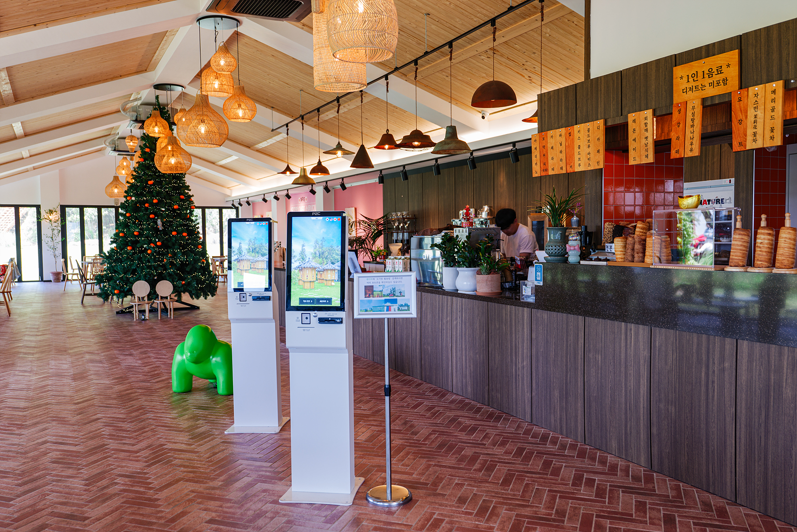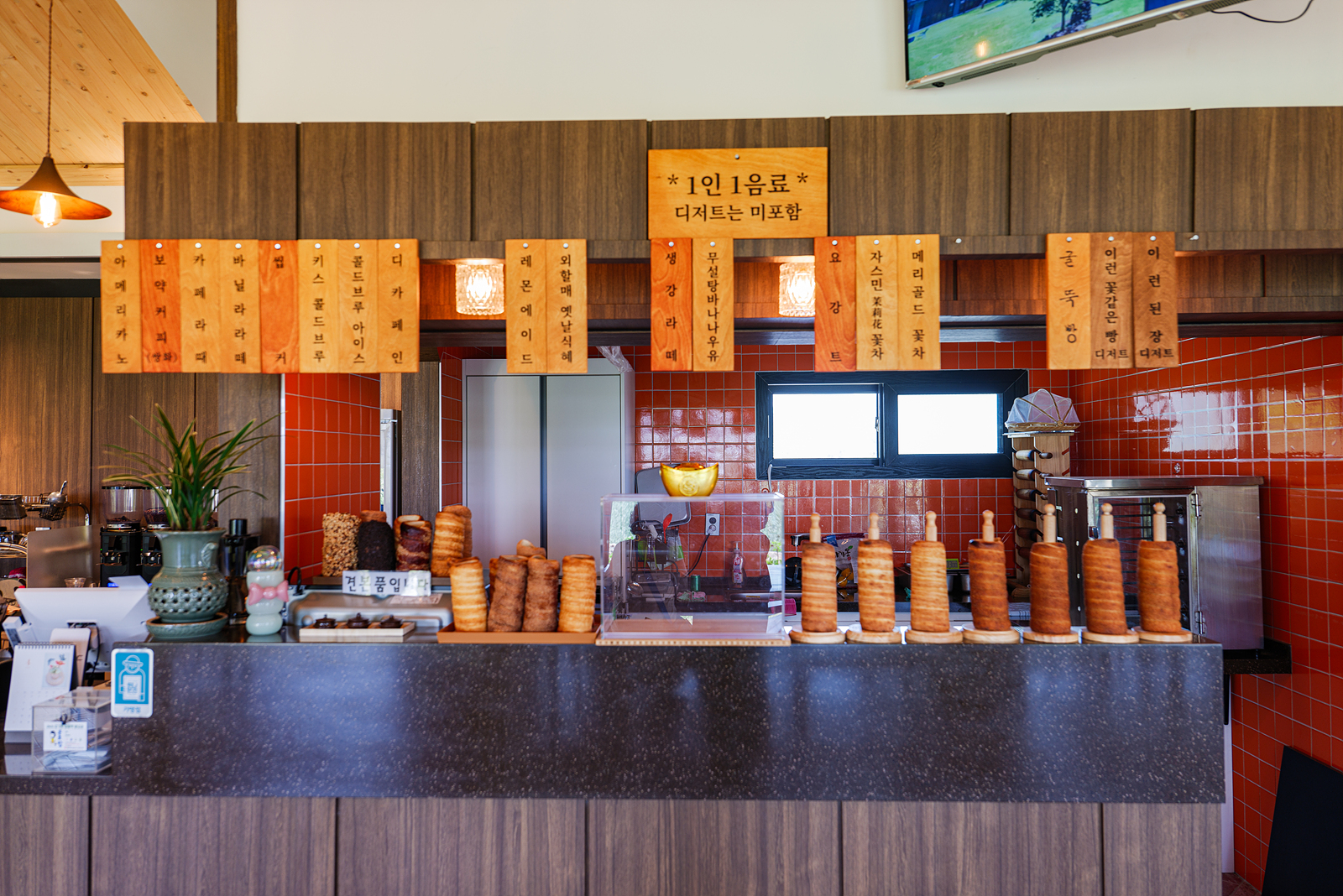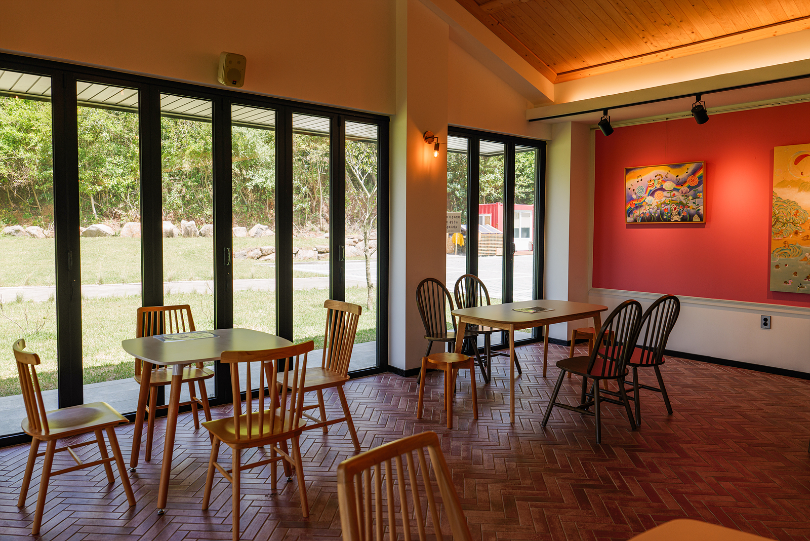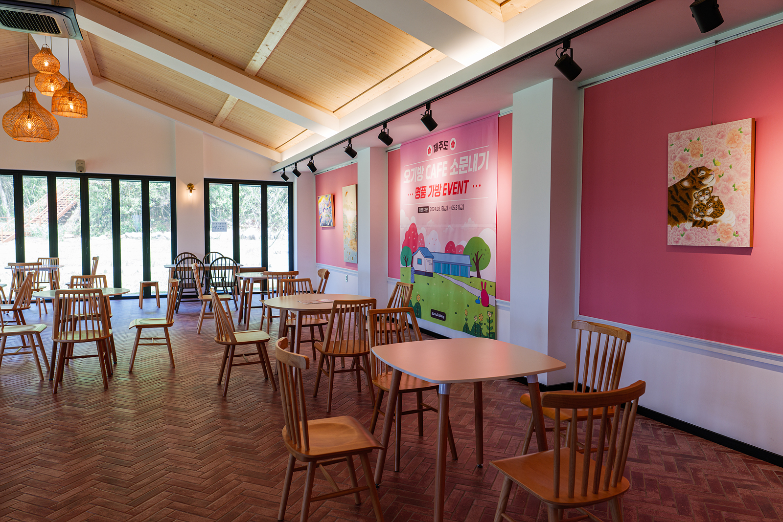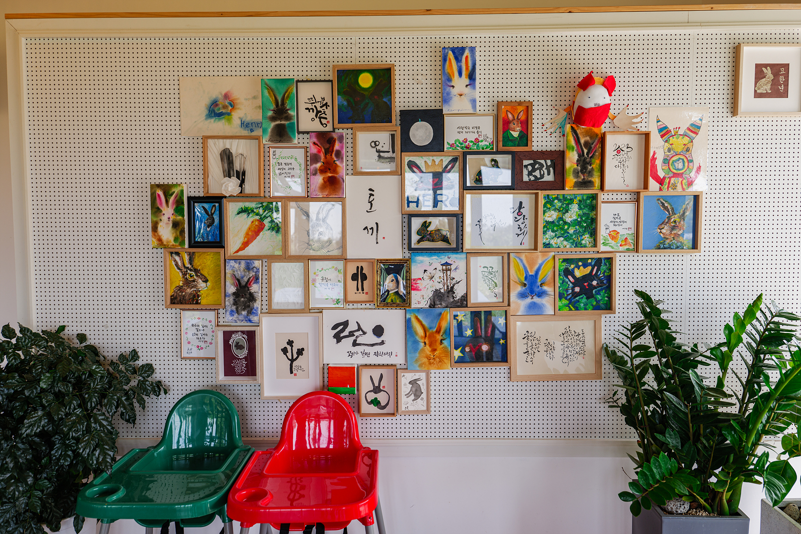 카페 입구를 따라 안으로 들어가면 토끼 그림이 담긴 그림 액자 아래 유아용 식탁의자가 있으며 카운터 앞쪽과 옆으로 여러 명이 앉을 수 있는 대형 테이블이 있다.