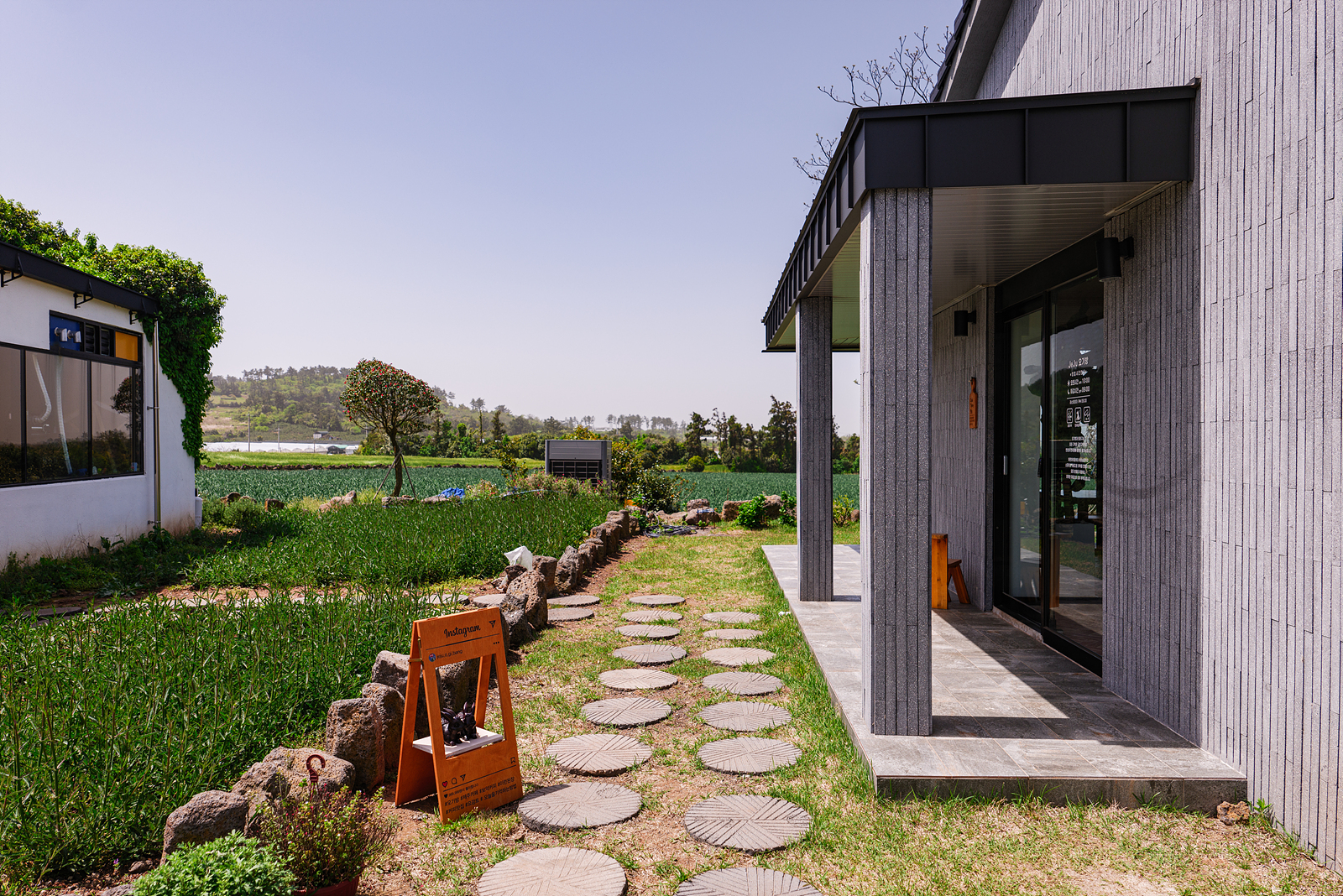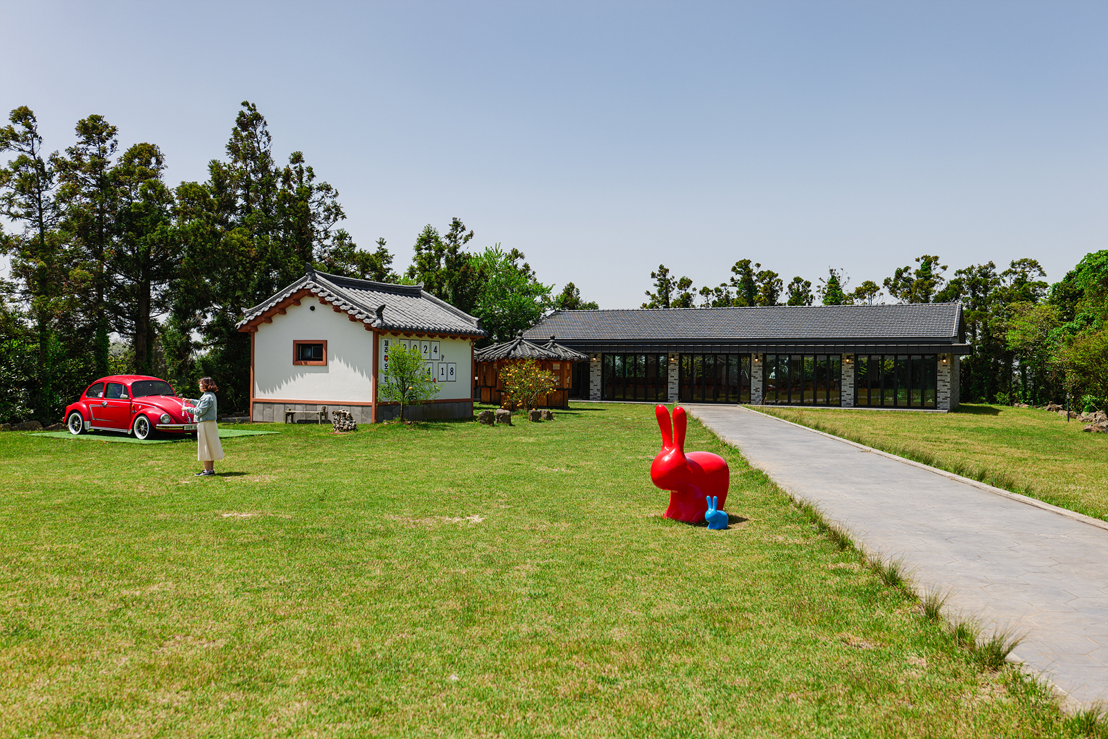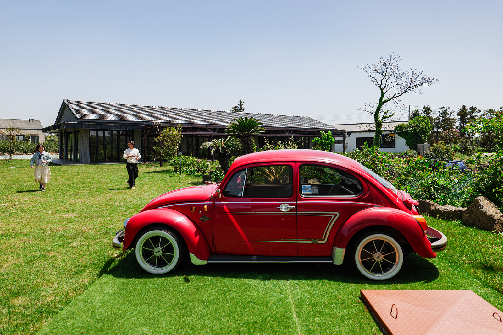오기방 카페를 제주 한경면 가볼만한곳으로 추천하고 싶은 또다른 이유로는 야외 정원이 무척 예쁘기 때문이다. 카페 밖으로 나와 빨간색 외제차가 있는 곳으로 가면 여러 꽃과 나무가 있는 정원이 있고 건축물과 자동차를 배경 삼아 비눗방울을 뿌리며 여행 사진을 남겨볼 수 있다.