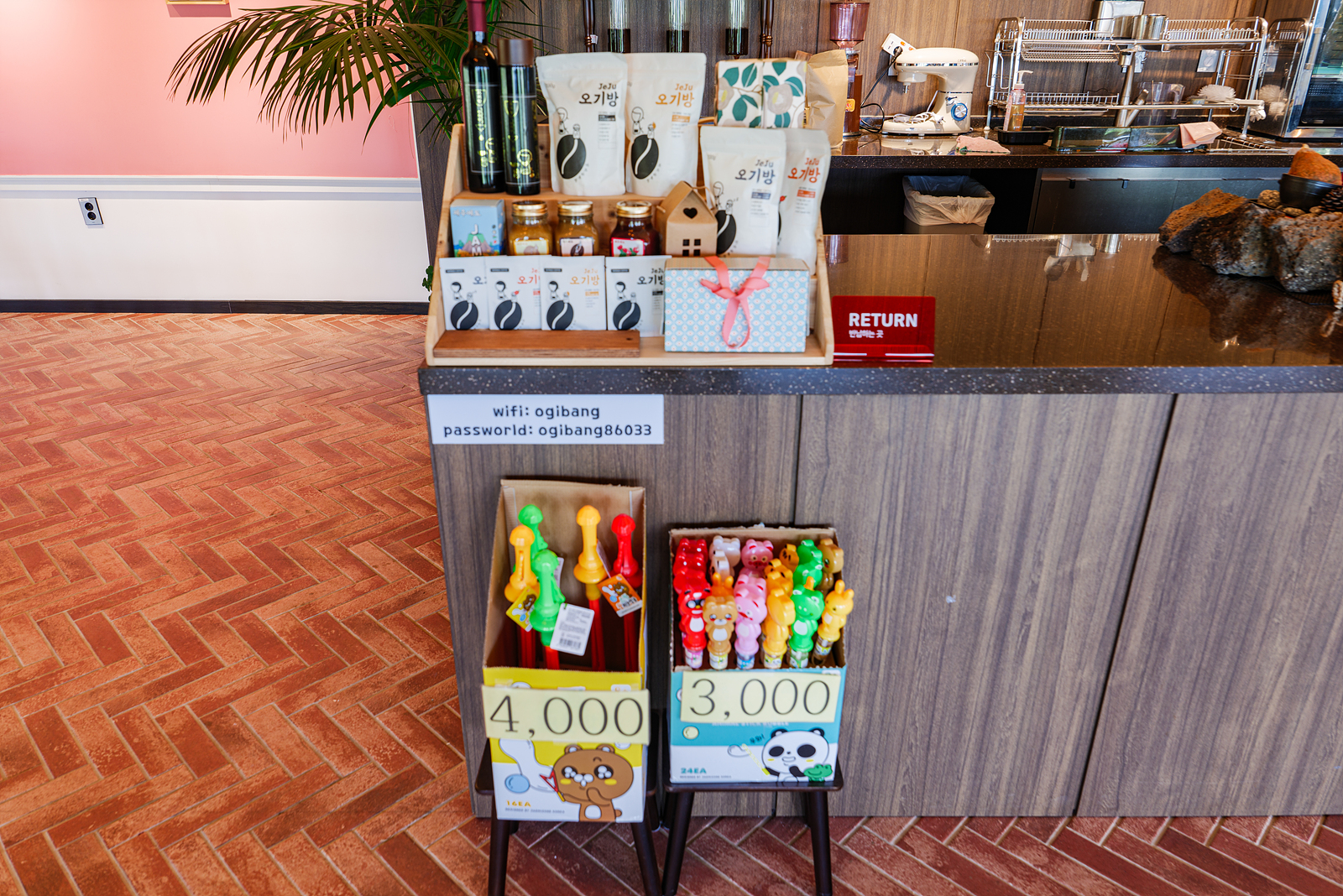 키오스크 무인단말기를 통해 커피, 음료, 차, 에이드, 디저트를 주문할 수 있는데 제주 카페 오기방에서 주문할 수 있는 시그니처 메뉴로는 씹커(씹어먹는 커피), 쌍화탕 보약커피이 있으며 각각 1잔에 9,000원이다.