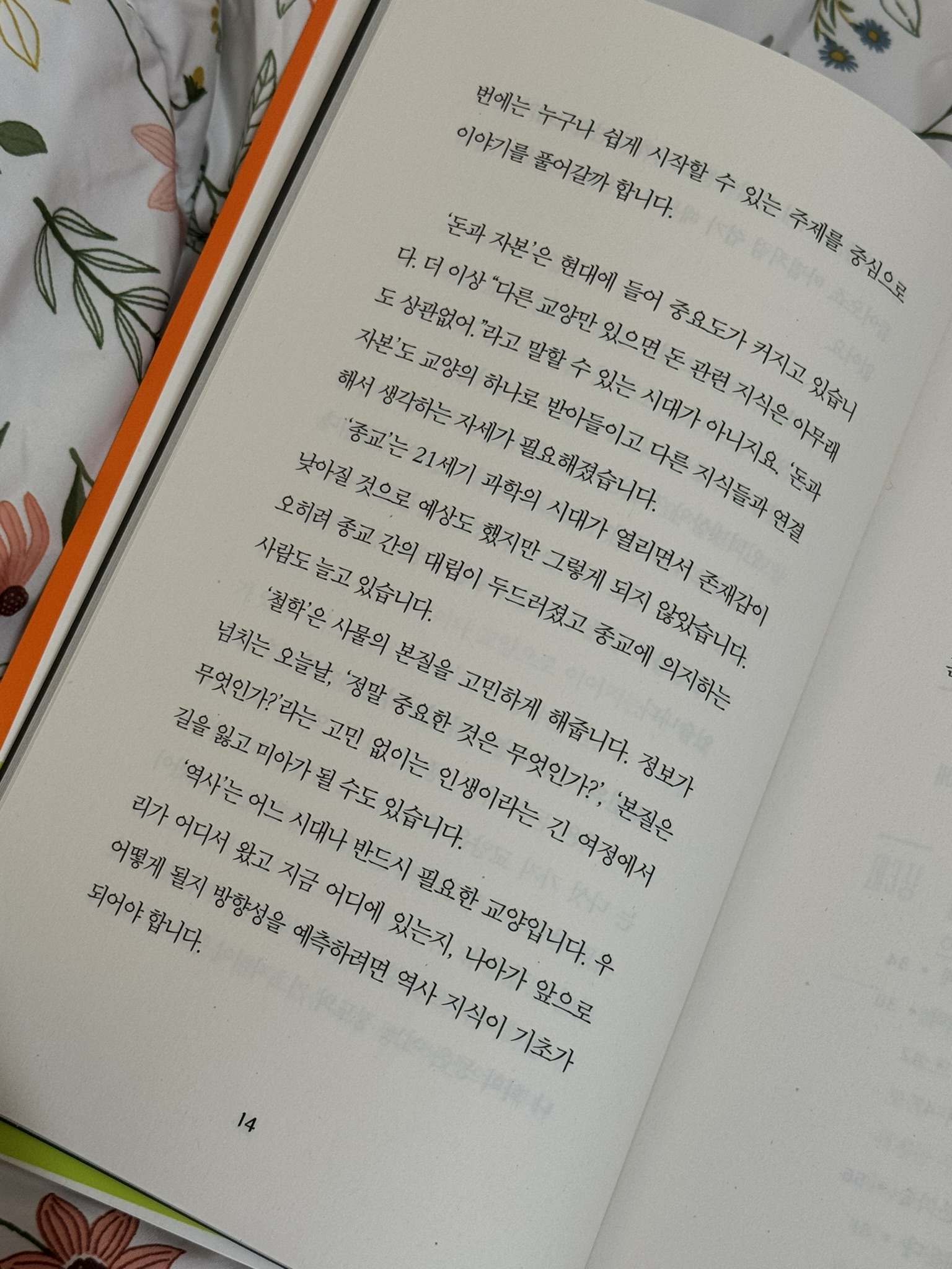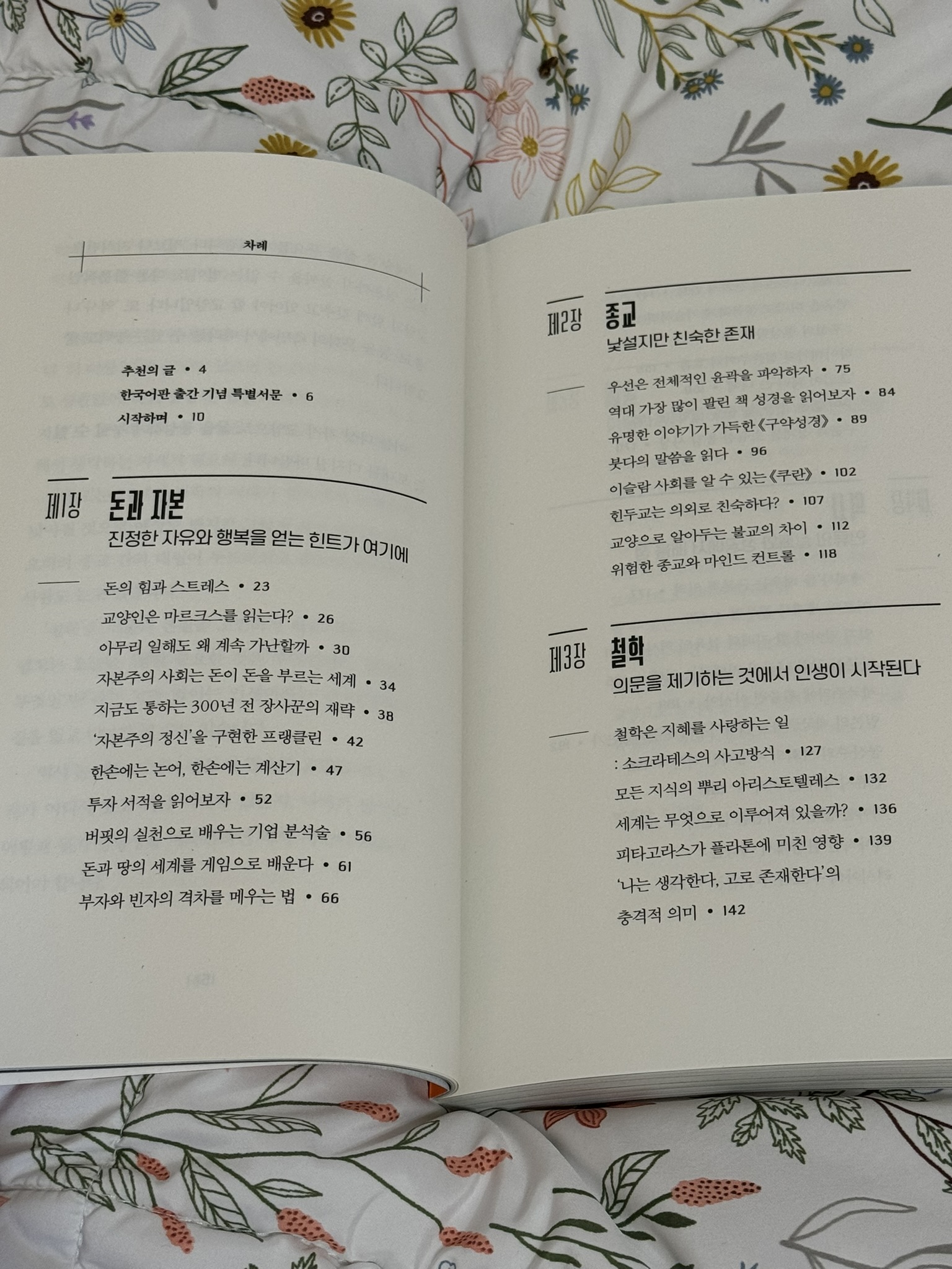 읽을만한 책 추천 '지적인 어른을 위한 최소한의 교양수업'에서 첫 주제인 '돈과 자본'은 산업혁명, 자본주의, 투자 서적, 마르크스, 프랭클린, 워렛 버핏에 대한 내용이 나오며, 두 번째 장인 '종교'에서는 개신교, 불교, 이슬람교, 힌두교에 대한 기초 지식을 알려준다.