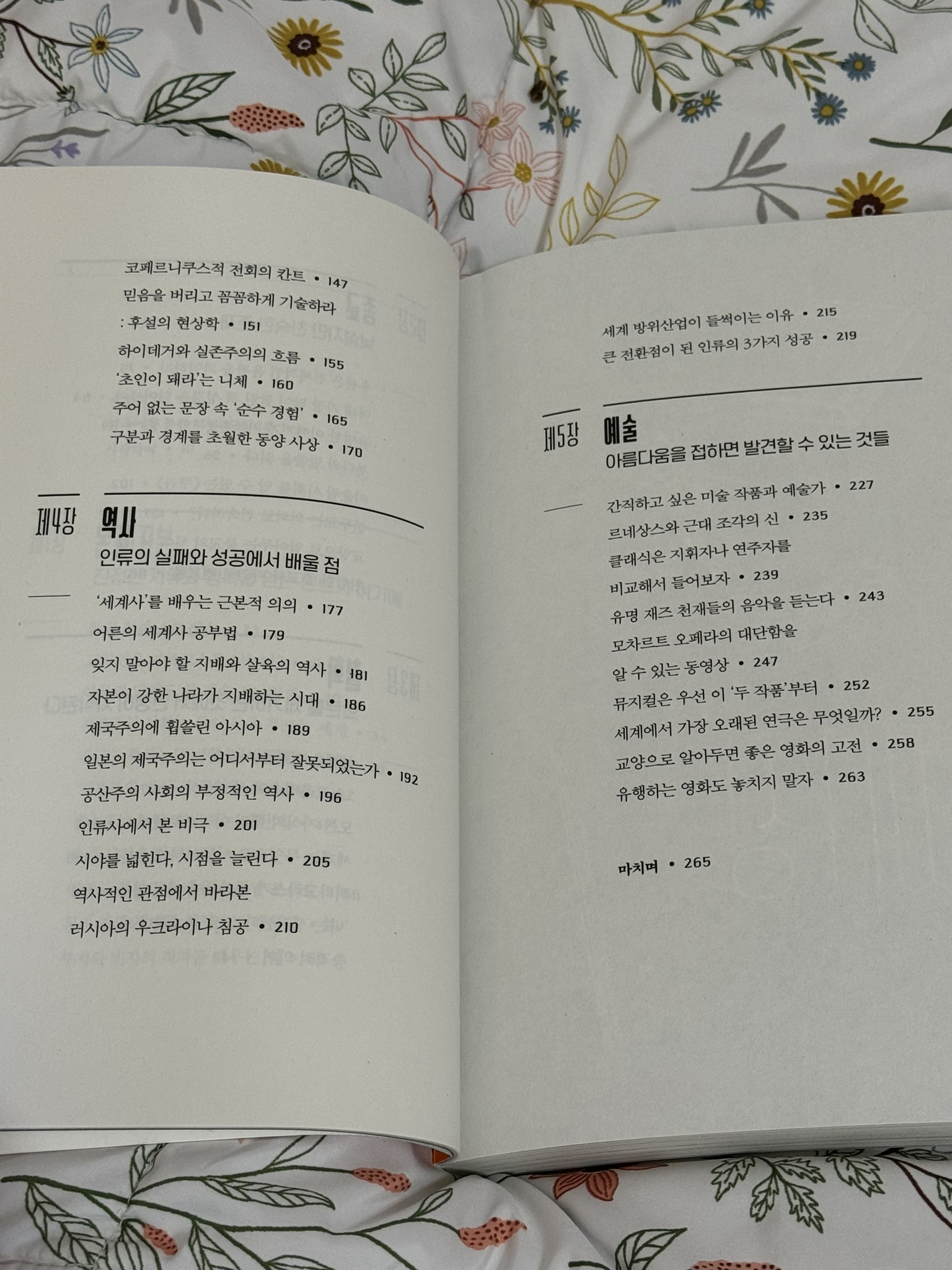 세 번째 장 '철학' 편에서는 소크라테스, 아리스토텔레스, 피카토라스, 플라톤, 데카트르, 칸트, 하이데거 등 세계적으로 유명한 철학자에 대해 이야기하며, 네 번째 장 '역사' 편에서는 세계자, 지배와 살육의 역사, 제국주의, 공산주의, 러시아 우크라이나 침공 등 오래전 발생한 사건부터 현재 일어나고 있는 것까지 말해주면서 독자의 지식과 교양을 넓혀준다.