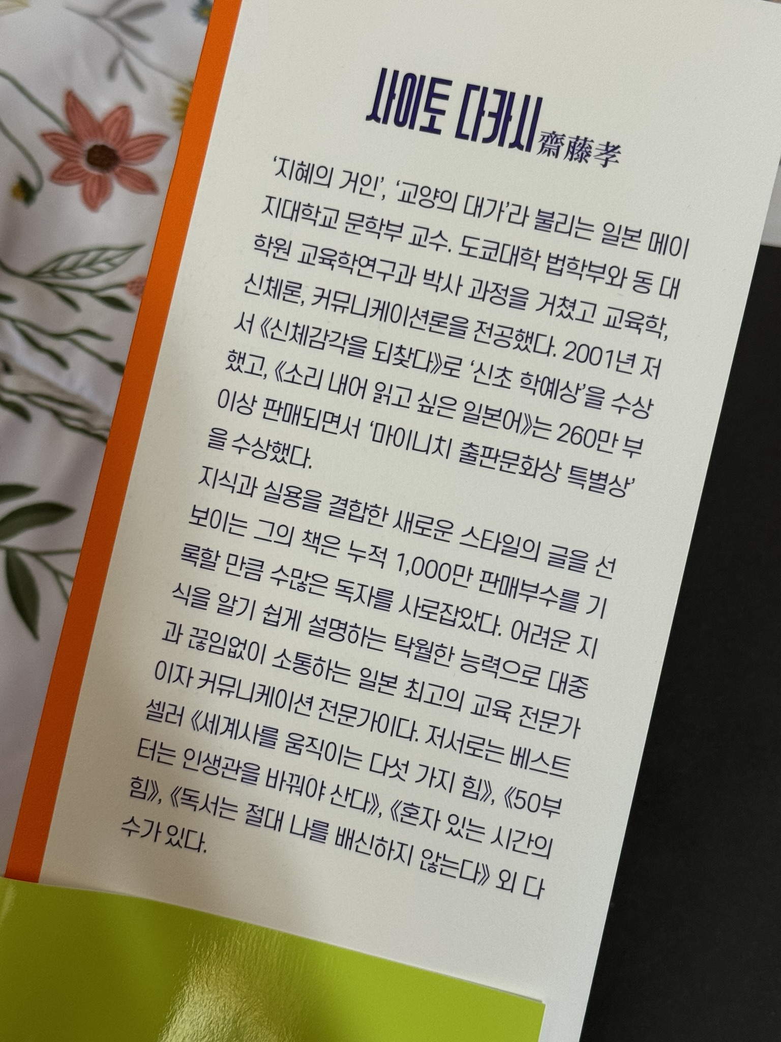 '지적인 어른을 위한 최소한의 교양수업'를 쓴 저자 사이토 타카시는 '지혜의 거인', '교양의 대가'라 불리는 일본 메이지대학교 문학부 교수이며, 전작 '신체감각을 되찾다', '소리 내어 읽고 싶은 일본어', '세계사를 움직이는 다섯 가지 힘', '50부터는 인생관을 바꿔야 산다', '혼자 있는 시간의 힘', '독서는 절대 나를 배신하지 않는다'를 출간하면서 누적 1,000만이 넘는 판매부수를 기록한 베스트셀러 작가로 이번 작품은 한국어로 번역하면서 교양의 중요성을 강조해준다.