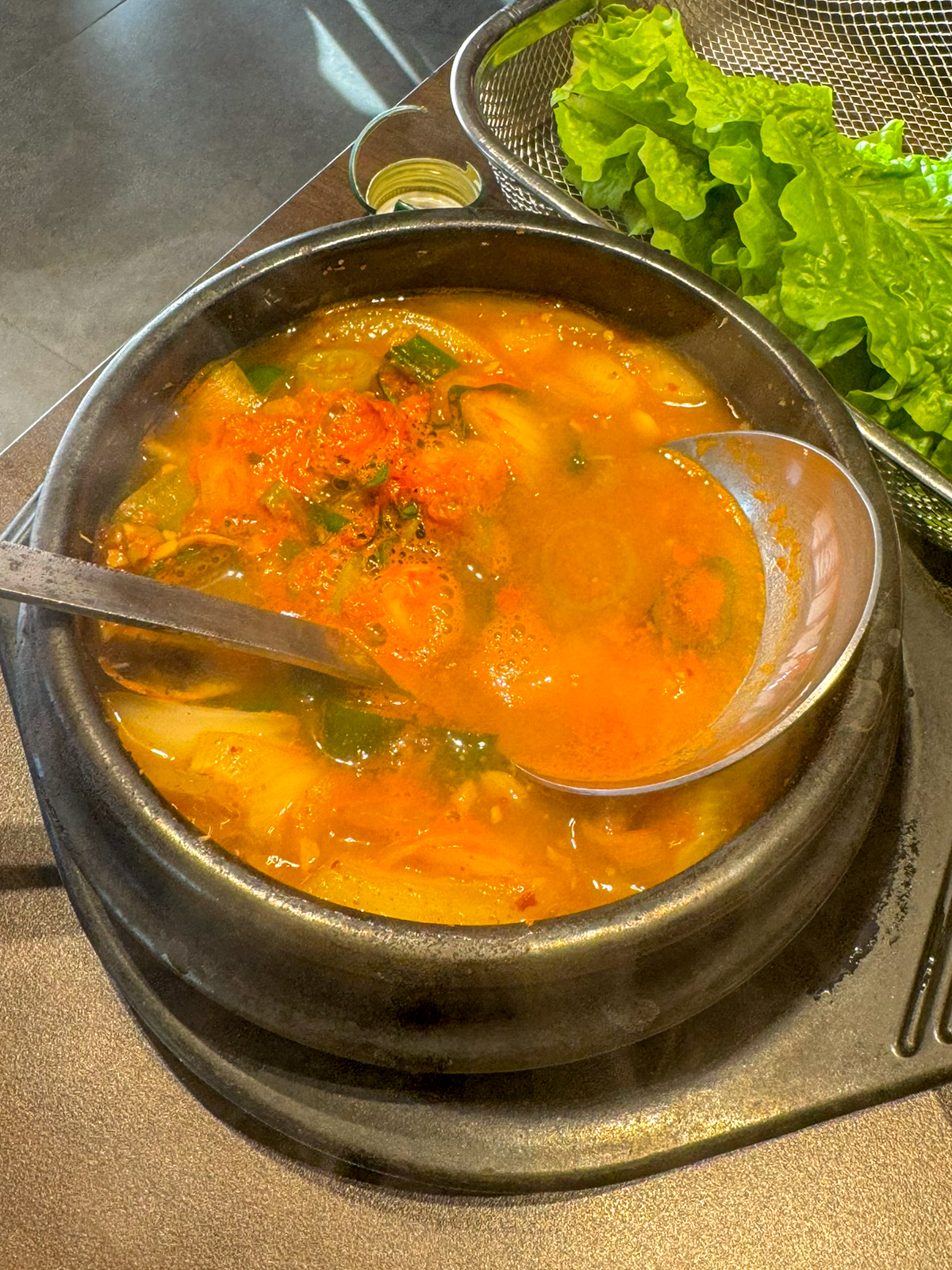 제주 고기왕에서 세트메뉴 혹은 단품메뉴를 통해 흑돼지 김치찌개나 해물 된장찌개를 주문할 수 있다. 평소 된장찌개를 더 선호하기에 시켜서 먹어봤는데 게가 들어 있고 진한 된장맛이 입맛에 맞아 술안주로 제격이었다.