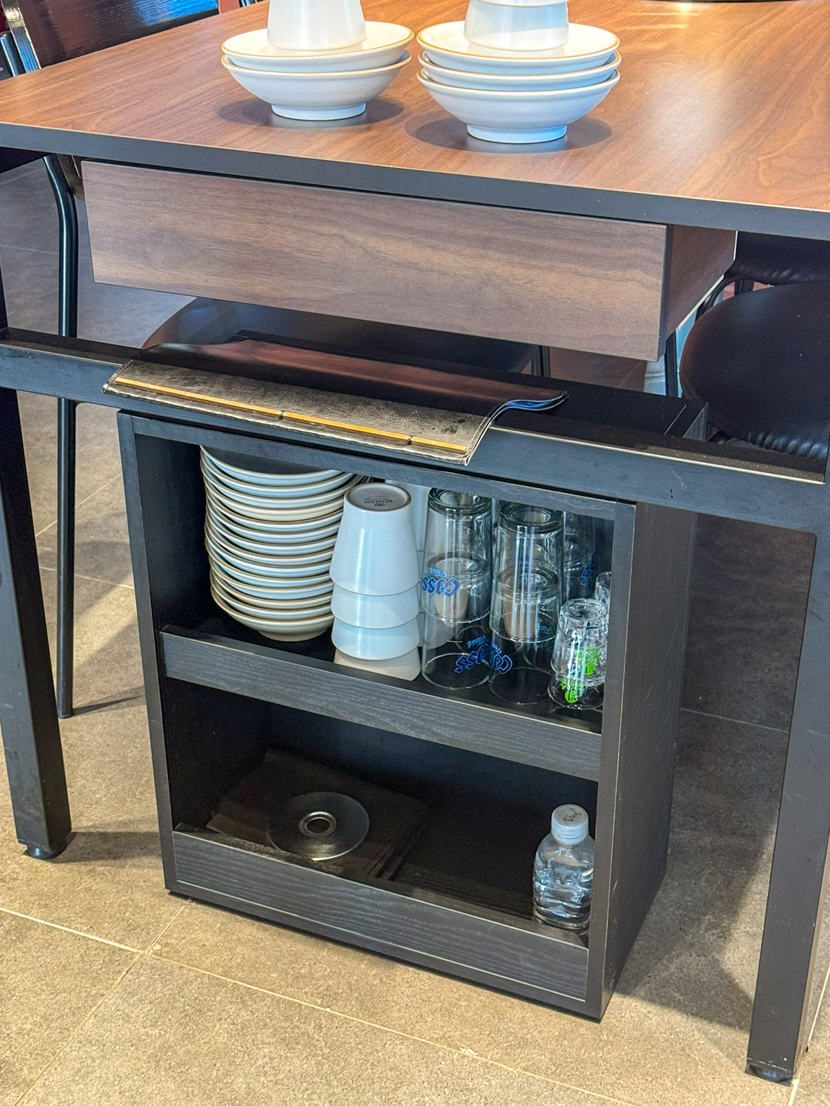테이블 옆에는 수저통 아래로 빈 접시, 물컵, 소주잔, 맥주잔, 티슈 등이 마련되어 있어 따로 직원을 부르지 않고 편하게 사용할 수 있다.