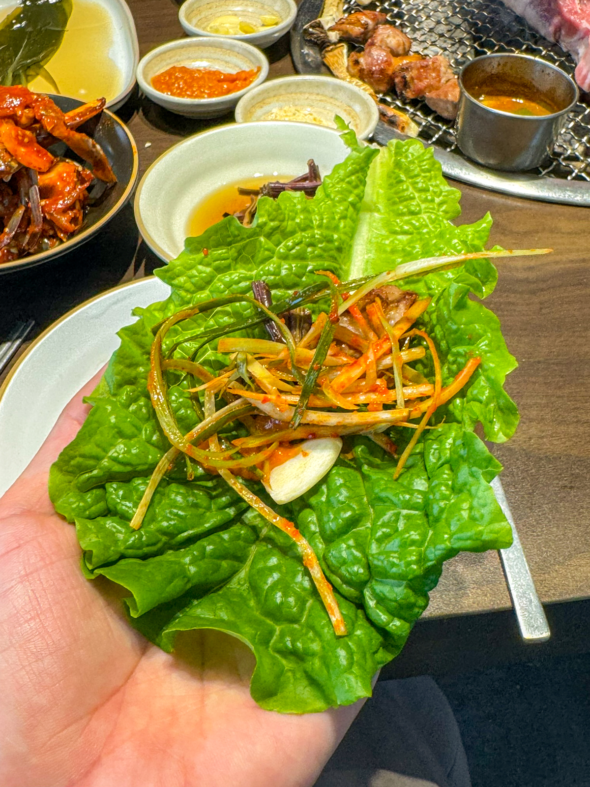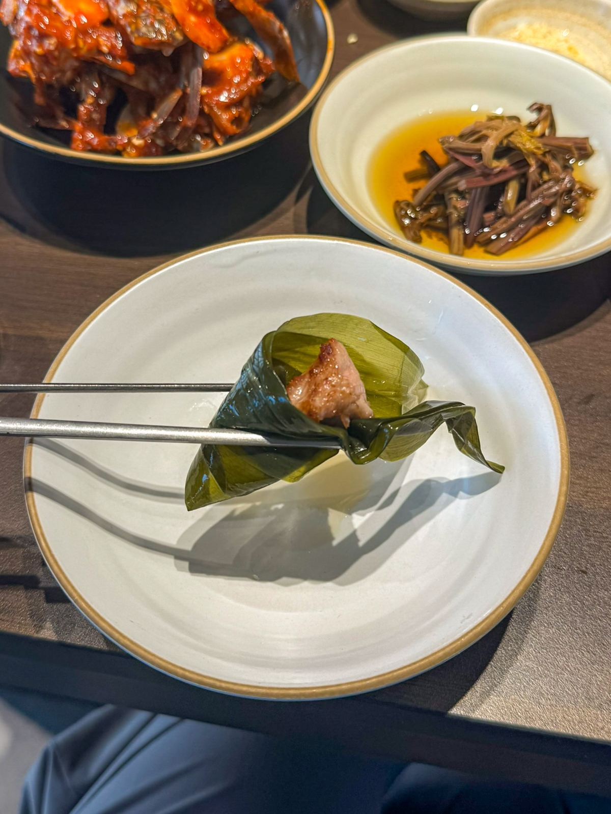 애월 흑돼지는 취향에 따라 소금, 와사비를 곁들여먹거나 반찬으로 나오는 명이나물에 감싸 먹어도 맛있다. 상추도 있기에 마늘, 된장, 파채를 함께 넣어 먹으면 맛과 건강을 동시에 챙길 수 있다.