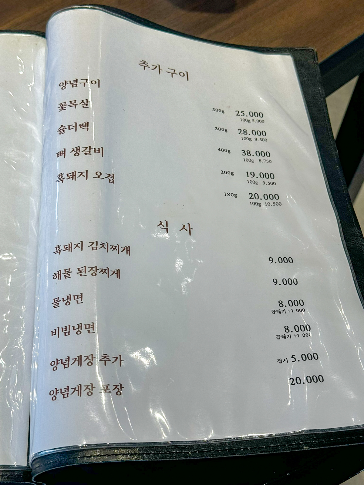 단품메뉴로는 양념구이, 꽃목살, 숄더렉, 뼈생갈비, 흑돼지 오겹살이 있으며 사이드메뉴로는 흑돼지 김치찌개, 해물 된장찌개, 물냉면, 비빔냉면, 양념게장이 있다.