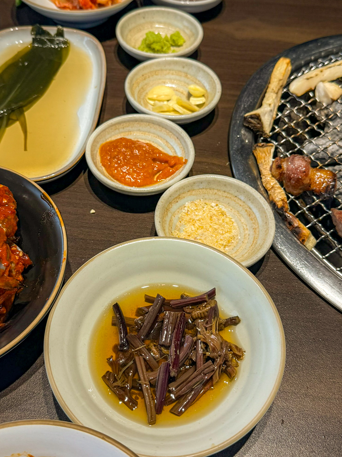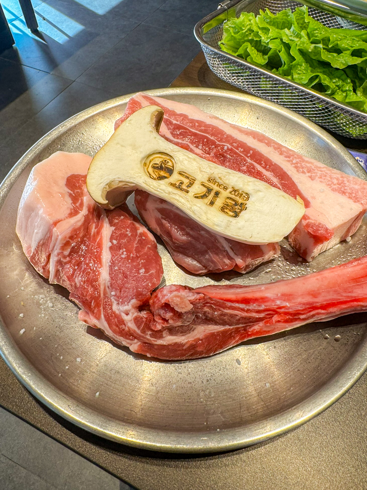 제주도 신라스테이 이호테우 근처 고기왕에 갔던 날에는 토마호크 숄더렉와 흑돼지 오겹살을 함께 먹을 수 있는 탐라세트를 주문했다. 음식을 주문하면 고사리무침, 파채, 명이나물, 상추, 와사비, 마늘, 된장, 황태소금이 차례대로 나온다.