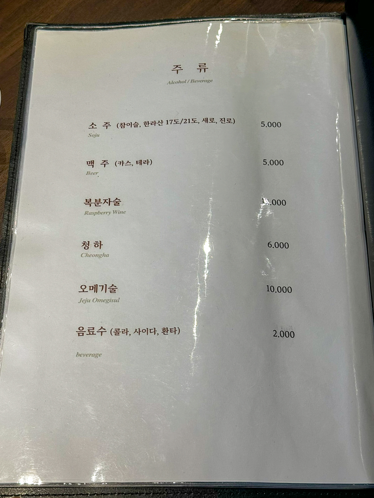 주류 종류로는 소주, 맥주, 청하, 복분자와 함께 제주도 전통주인 오메기술도 있다. 참고로 오메기술은 한 병에 만 원으로 차조를 주재료로 만든 순곡주로 흑돼지와 궁합이 좋기로 유명해 여행객 사이에서 인기 만점이다.