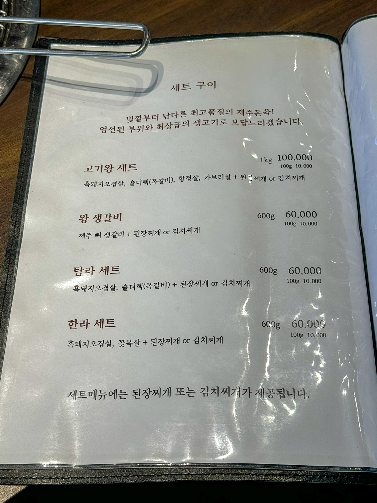 제주도 신라스테이 이호테우 근처 고기왕에서는 총 세 가지로 나뉘어진 세트 메뉴가 있다. 토마호크 숄더렉을 맛볼 수 있는 고기왕 세트, 뼈생갈비를 먹을 수 있는 왕생갈비 세트와 함께 탐라세트, 한라세트가 있으며 600g 기준으로 가격은 6만 원으로 다른 숙성 흑돼지 저문점과 비교하면 저렴해 언제나 많은 분들이 찾고 있다.