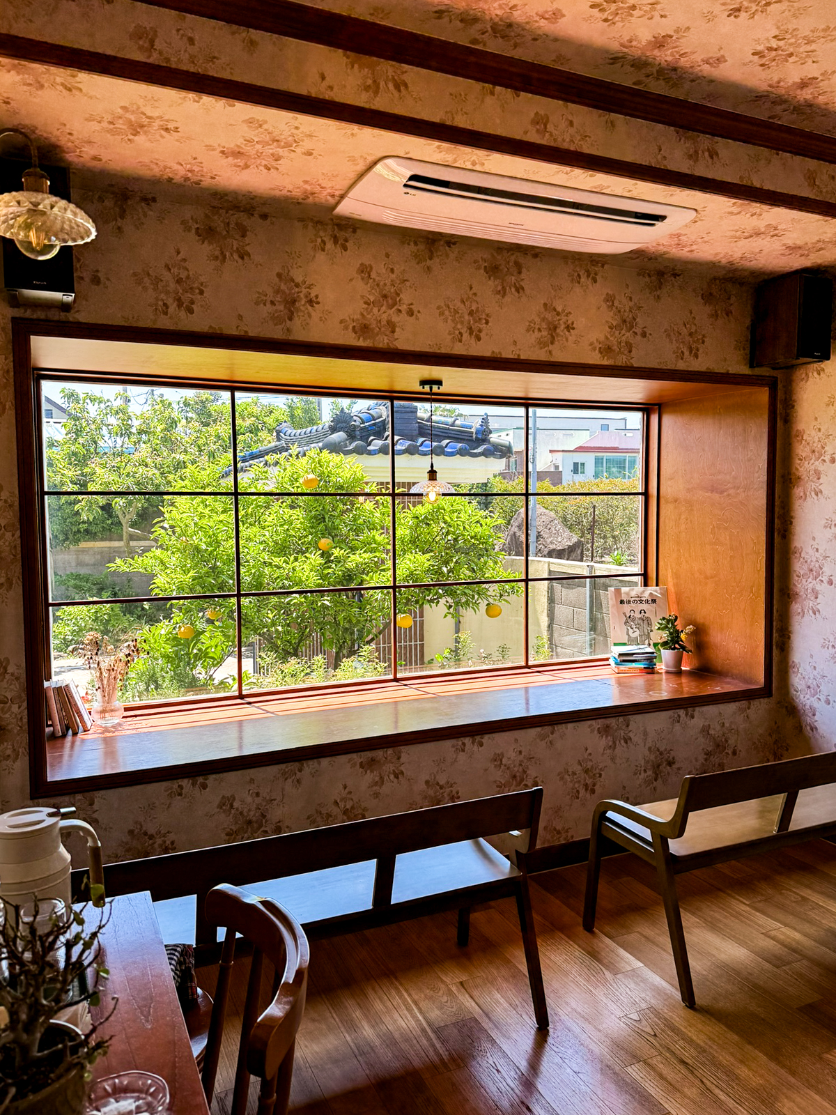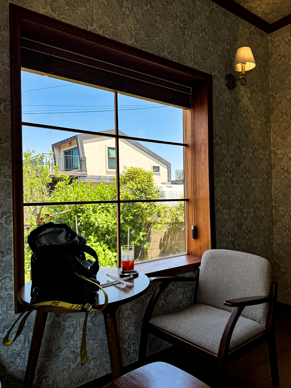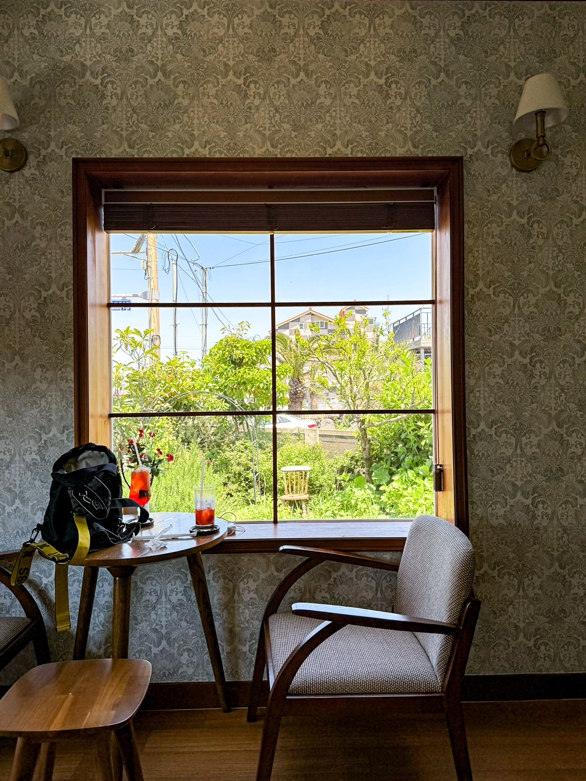 또다른 방으로 들어가면 앞서 봤던 공간보다 더 넓은 내부에 야외 정원이 보이는 창가 자리가 있는데 비오는 날에 가면 운치도 느껴지고 노트북 작업이나 책을 읽기에도 좋은 원형 테이블도 있어 전체적으로 괜찮았던 제주 애월 카페다.