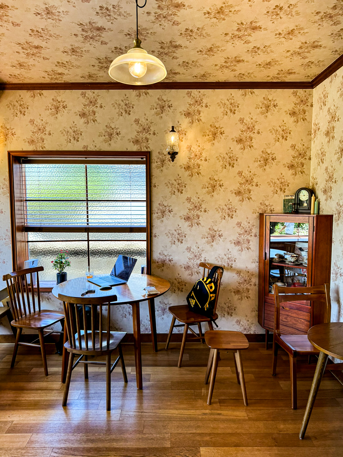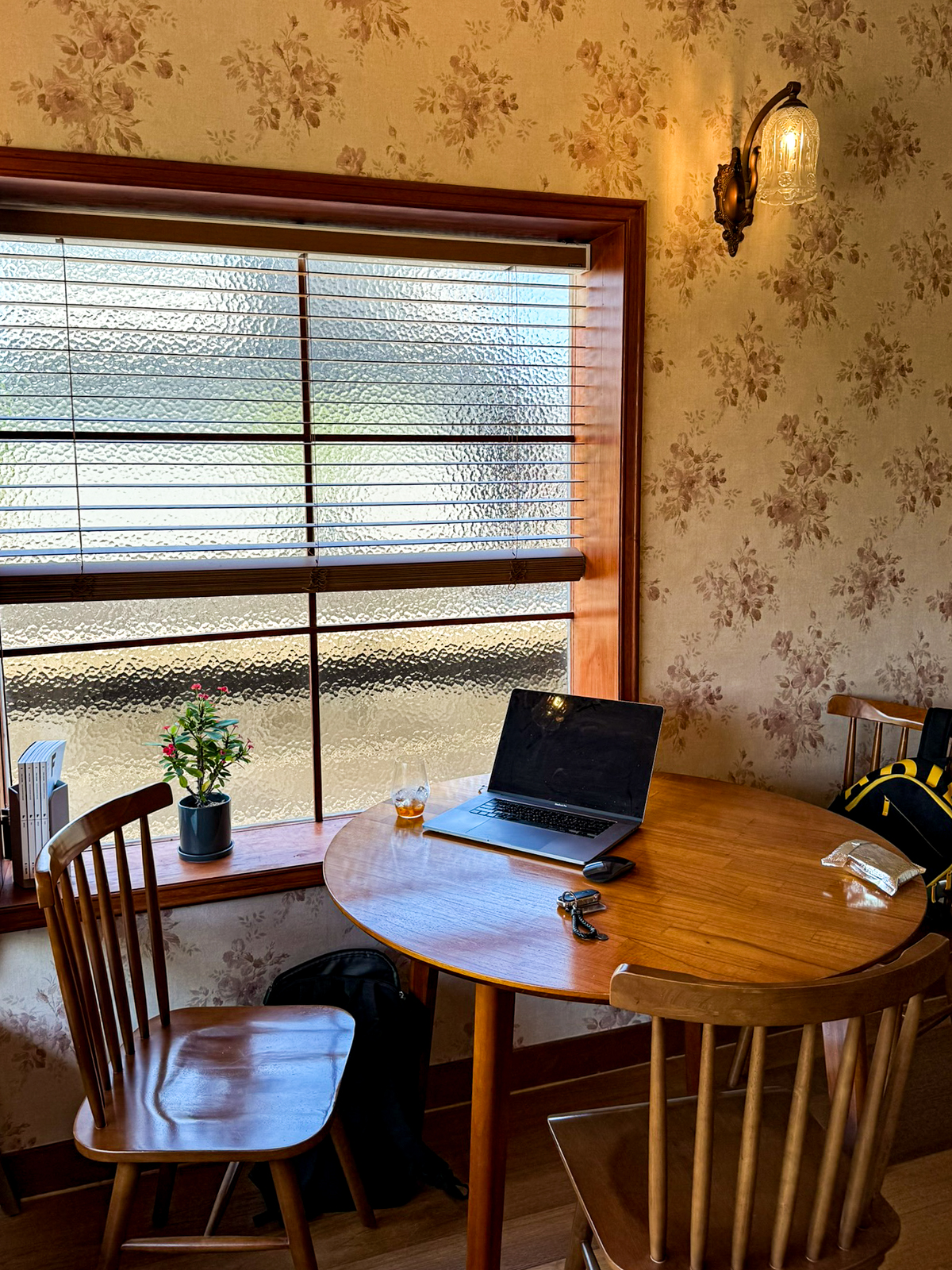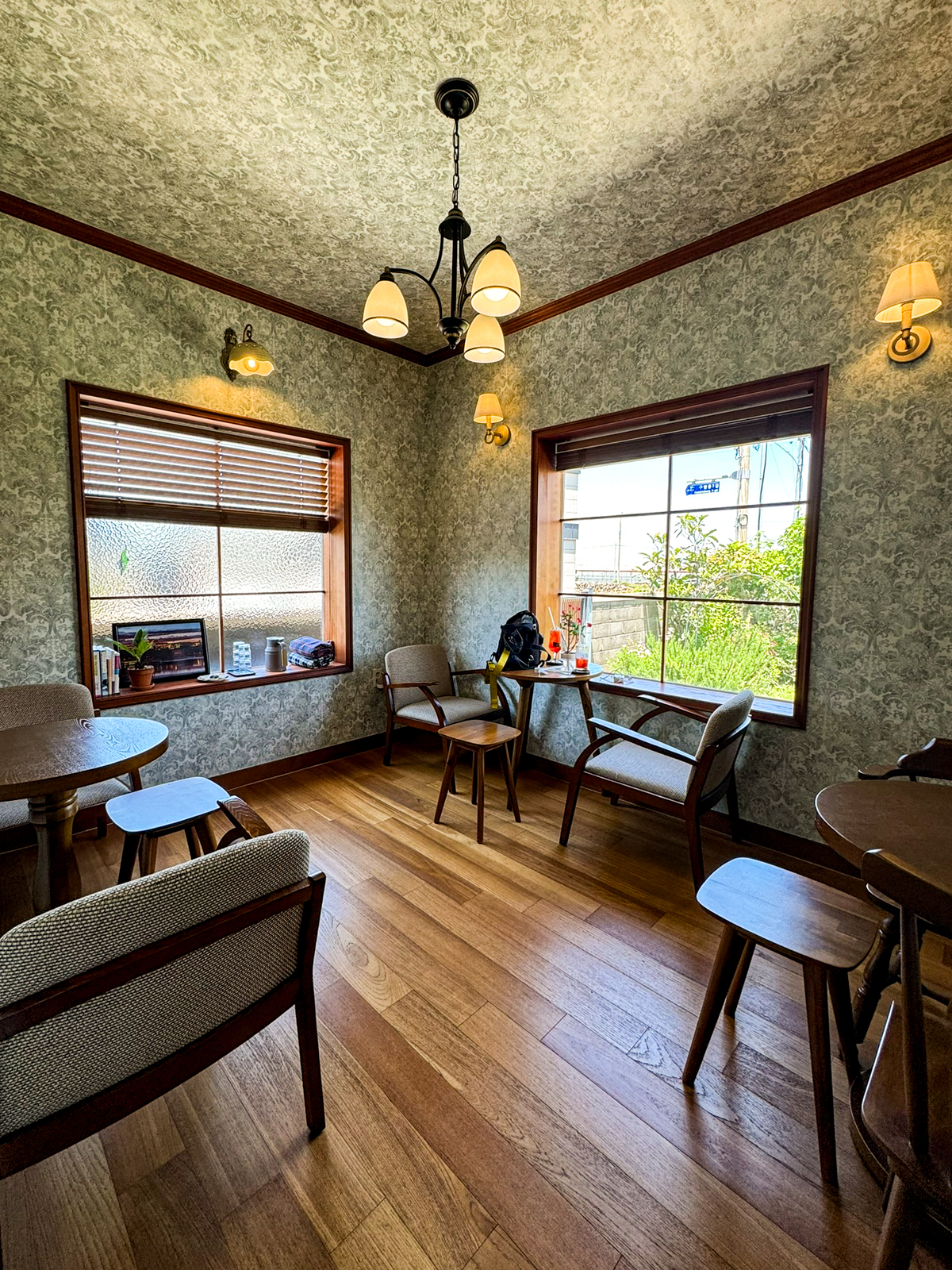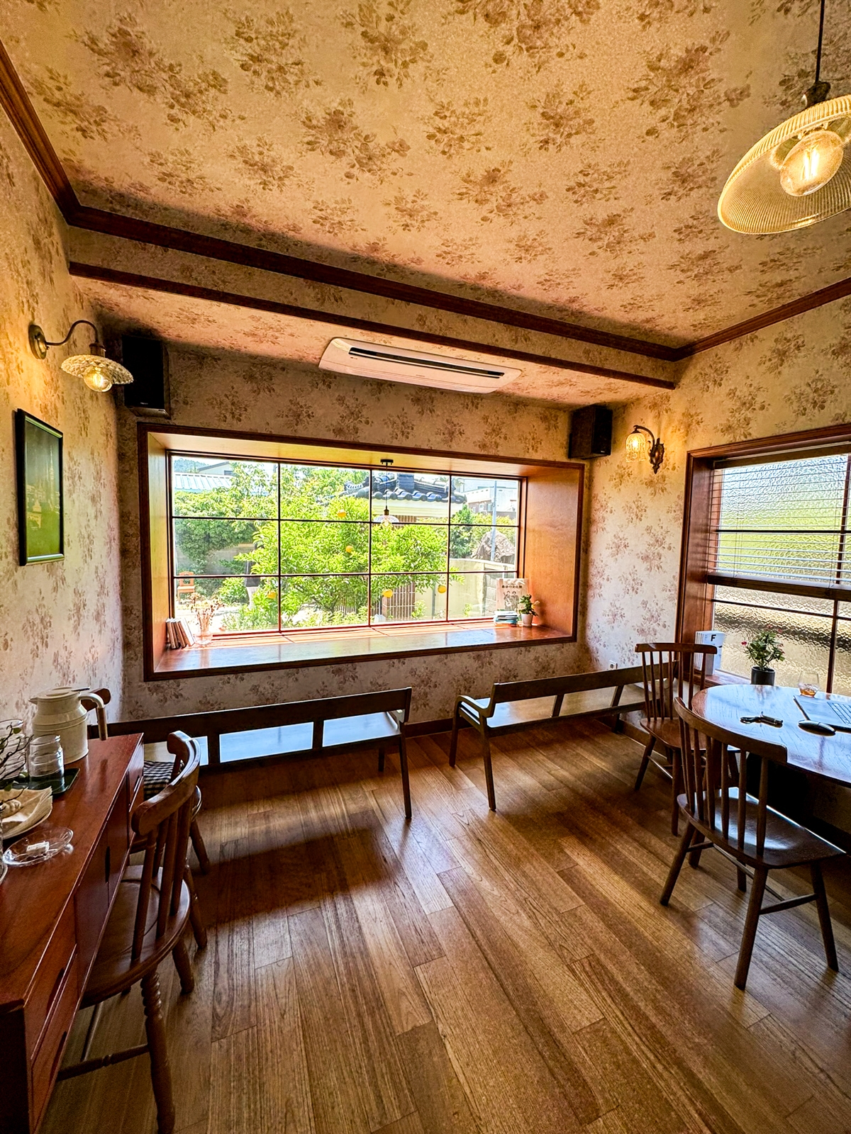 또다른 방으로 들어가면 앞서 봤던 공간보다 더 넓은 내부에 야외 정원이 보이는 창가 자리가 있는데 비오는 날에 가면 운치도 느껴지고 노트북 작업이나 책을 읽기에도 좋은 원형 테이블도 있어 전체적으로 괜찮았던 제주 애월 카페다.