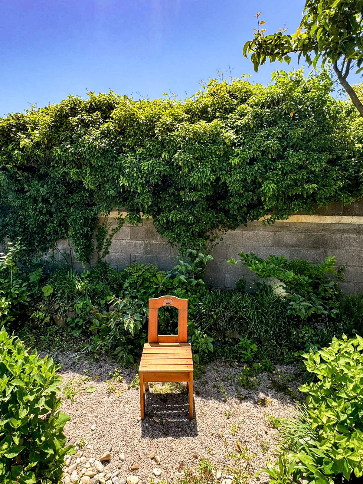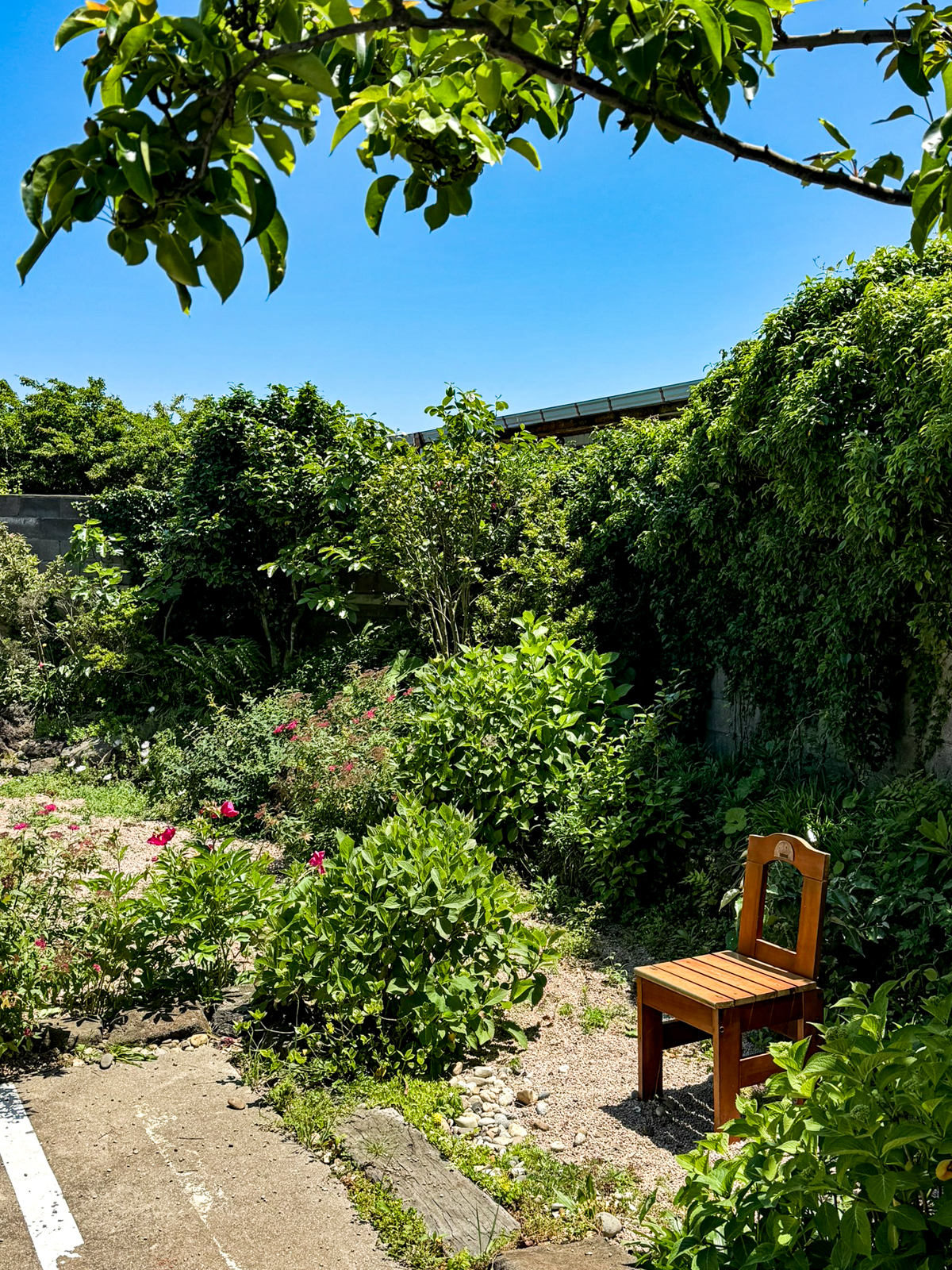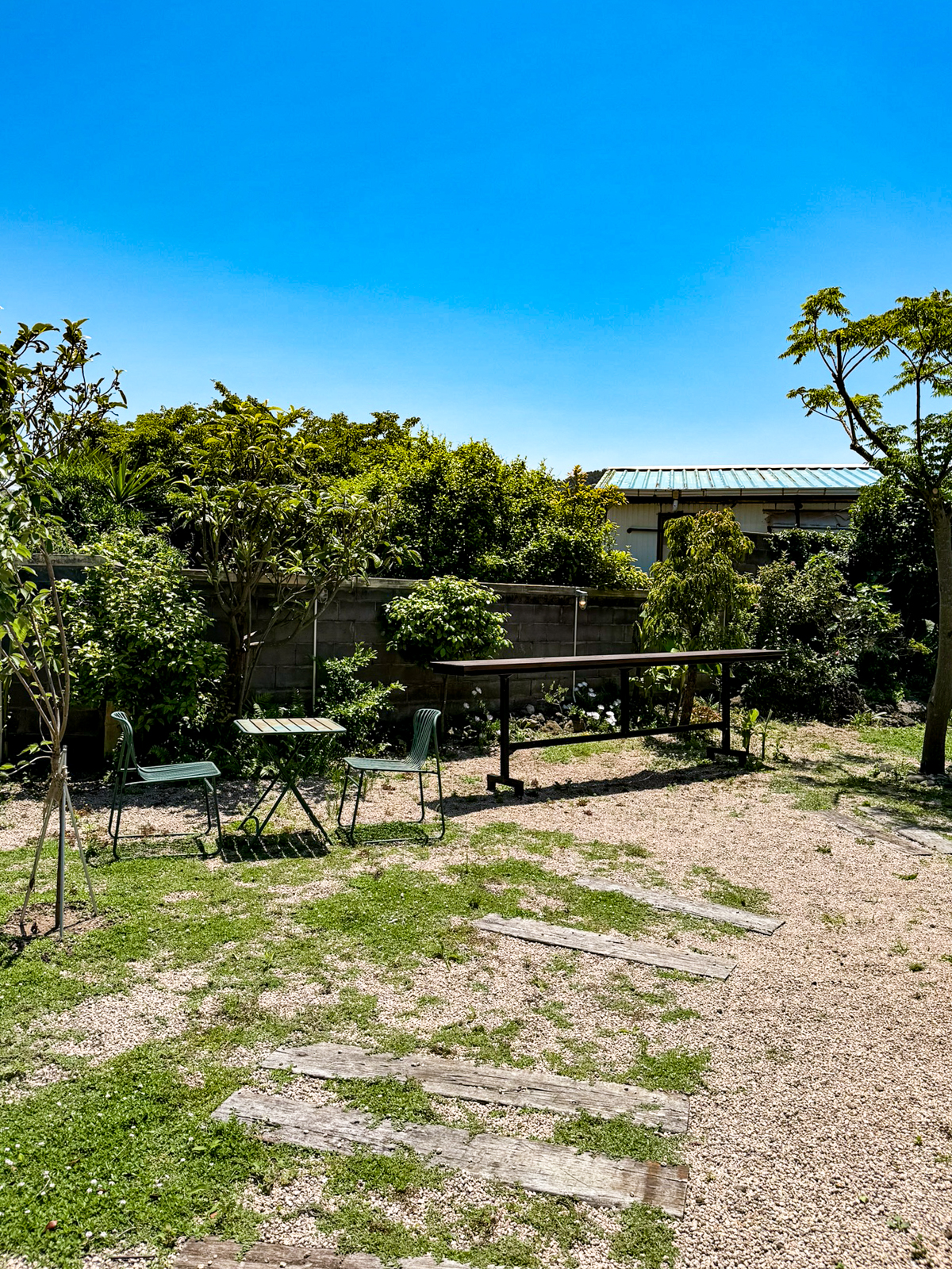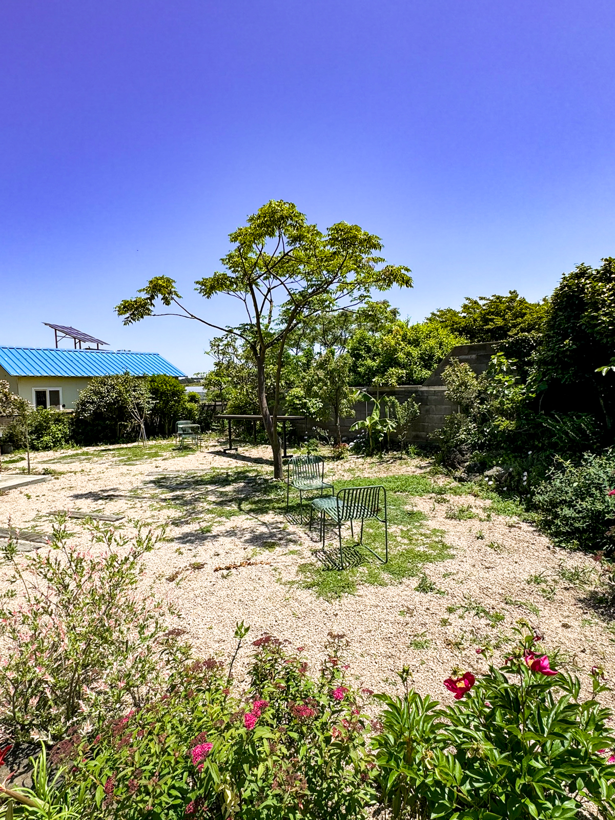 커피를 마시고 나가는 길에는 블로그 포스팅으로 소개하고 싶어 카페 외부에 있는 정원을 둘러봤다. 날씨가 화창한 날에는 초록색 나무와 꽃이 더 선명하게 보였고 곳곳에 앉아서 사진을 찍을 수 있게 원목의자가 마련되어 있었다.