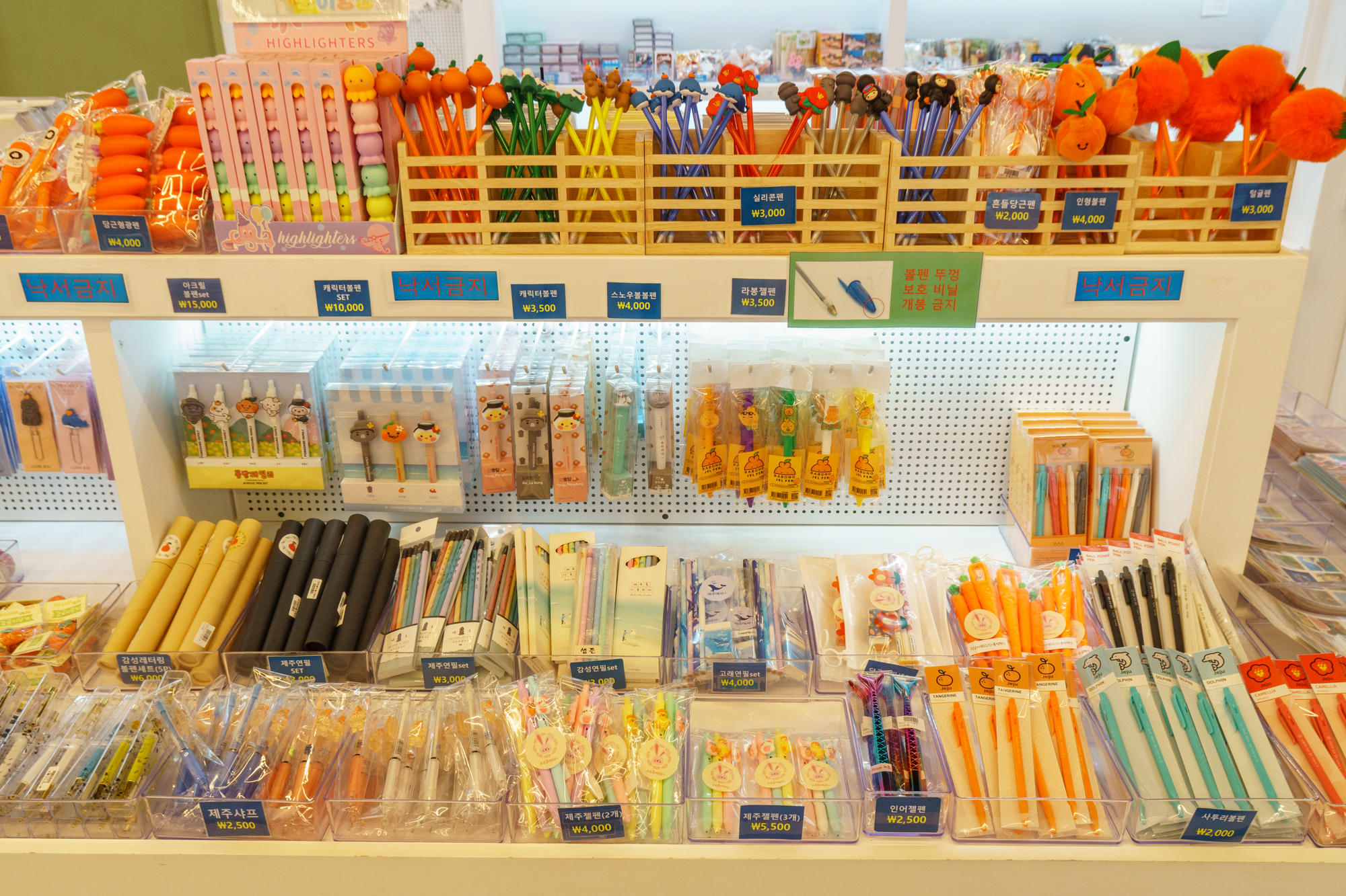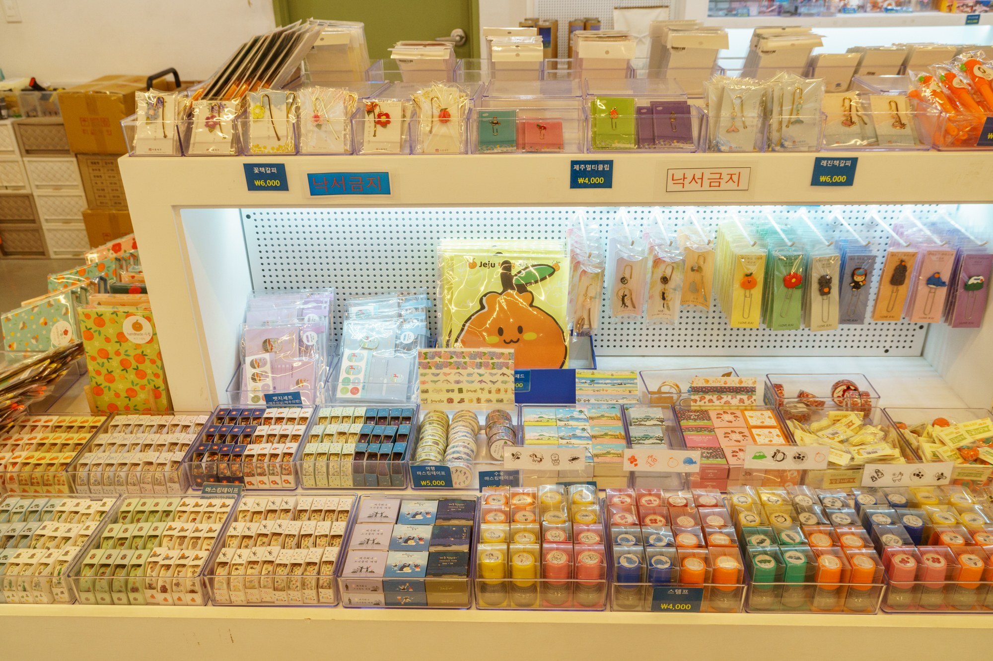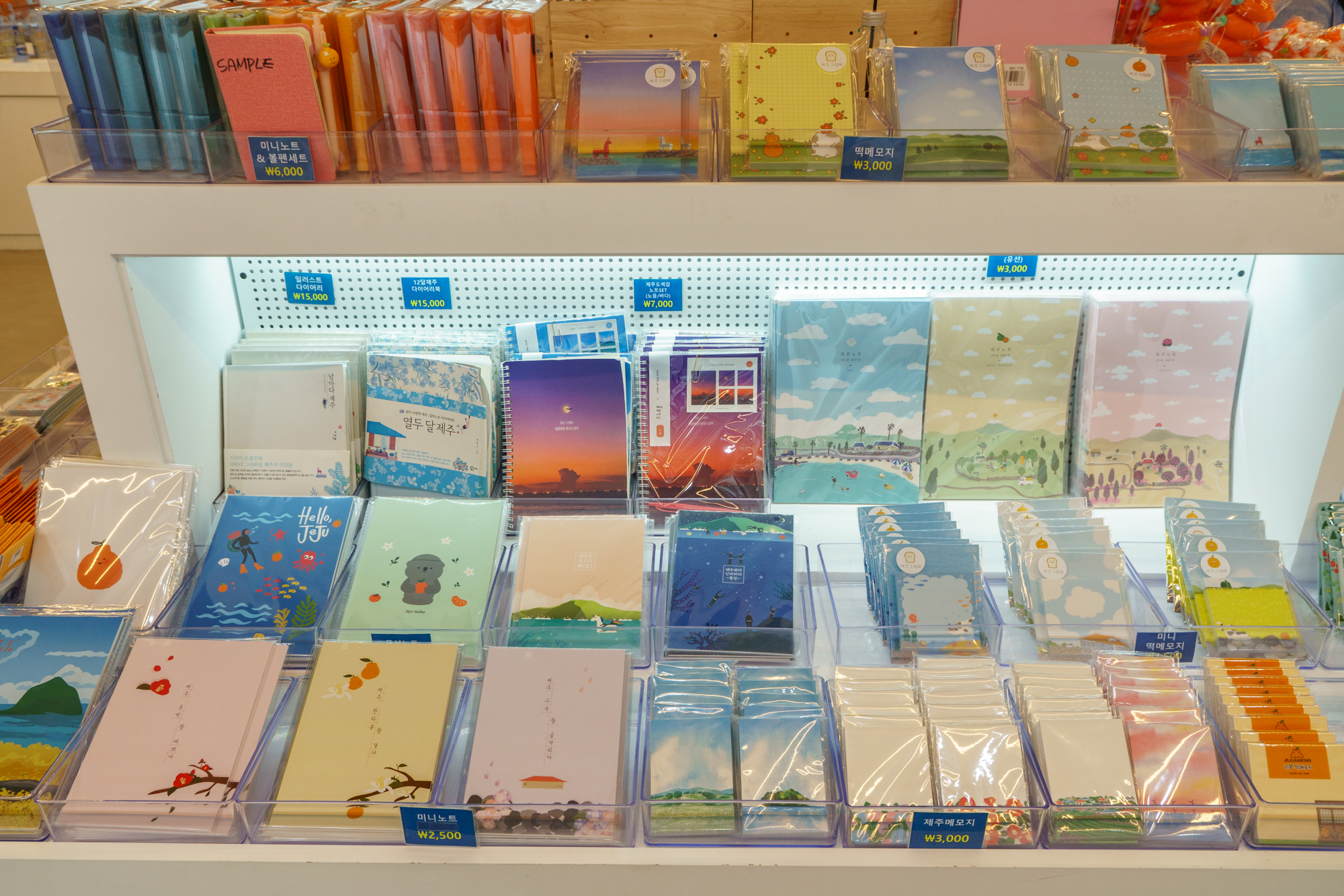제주 서귀포 소품샵 중문 만달에서 먹거리 코너로 들어가는 쪽으로 보면 문구류와 학용품도 있다. 제주도를 테마로 운영되는 기념품 가게답게 명소 풍경과 꽃을 담아낸 디자인 상품으로 구성되어 있었으며 가격도 비싸지 않아 부담없이 쇼핑을 즐길 수 있다.