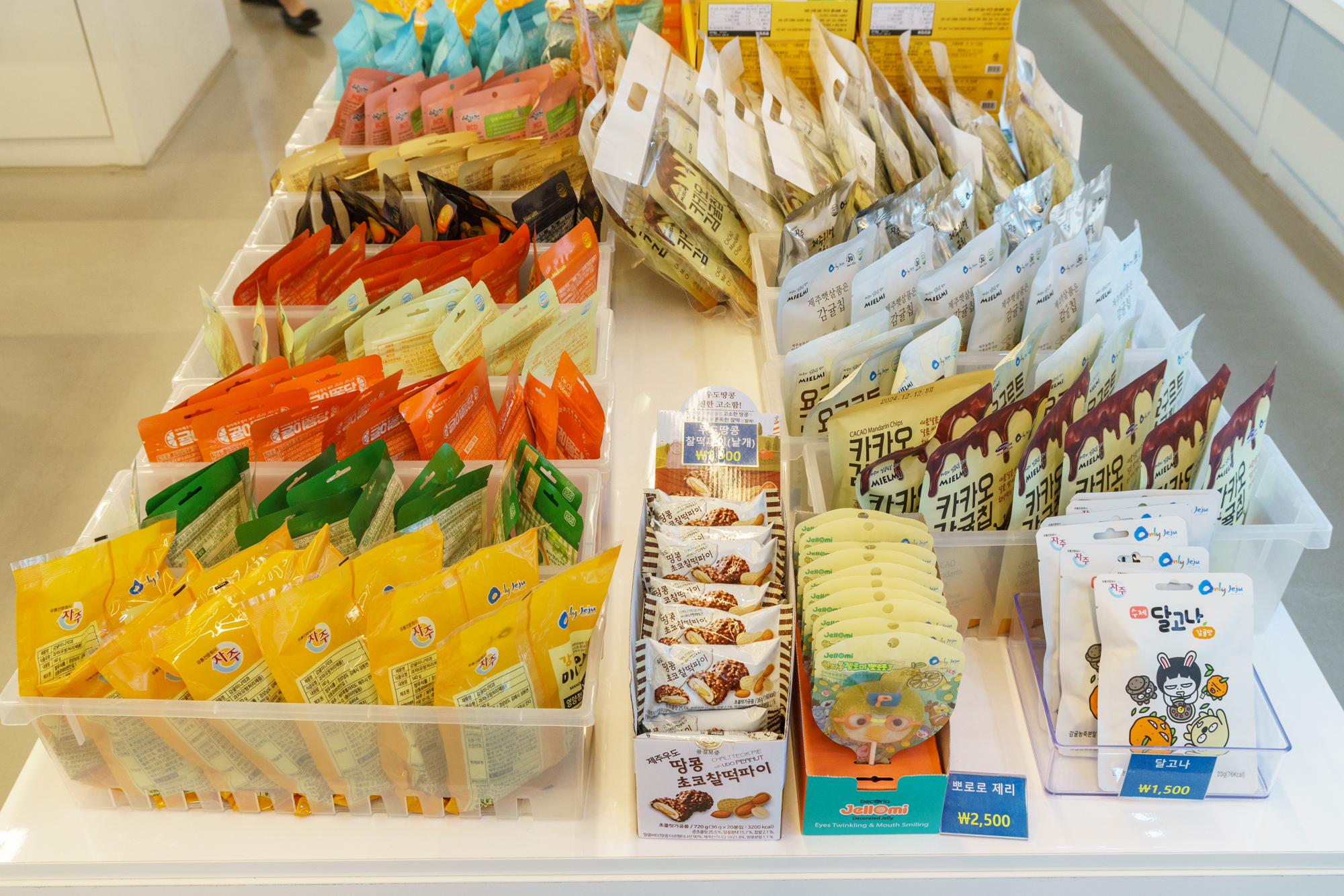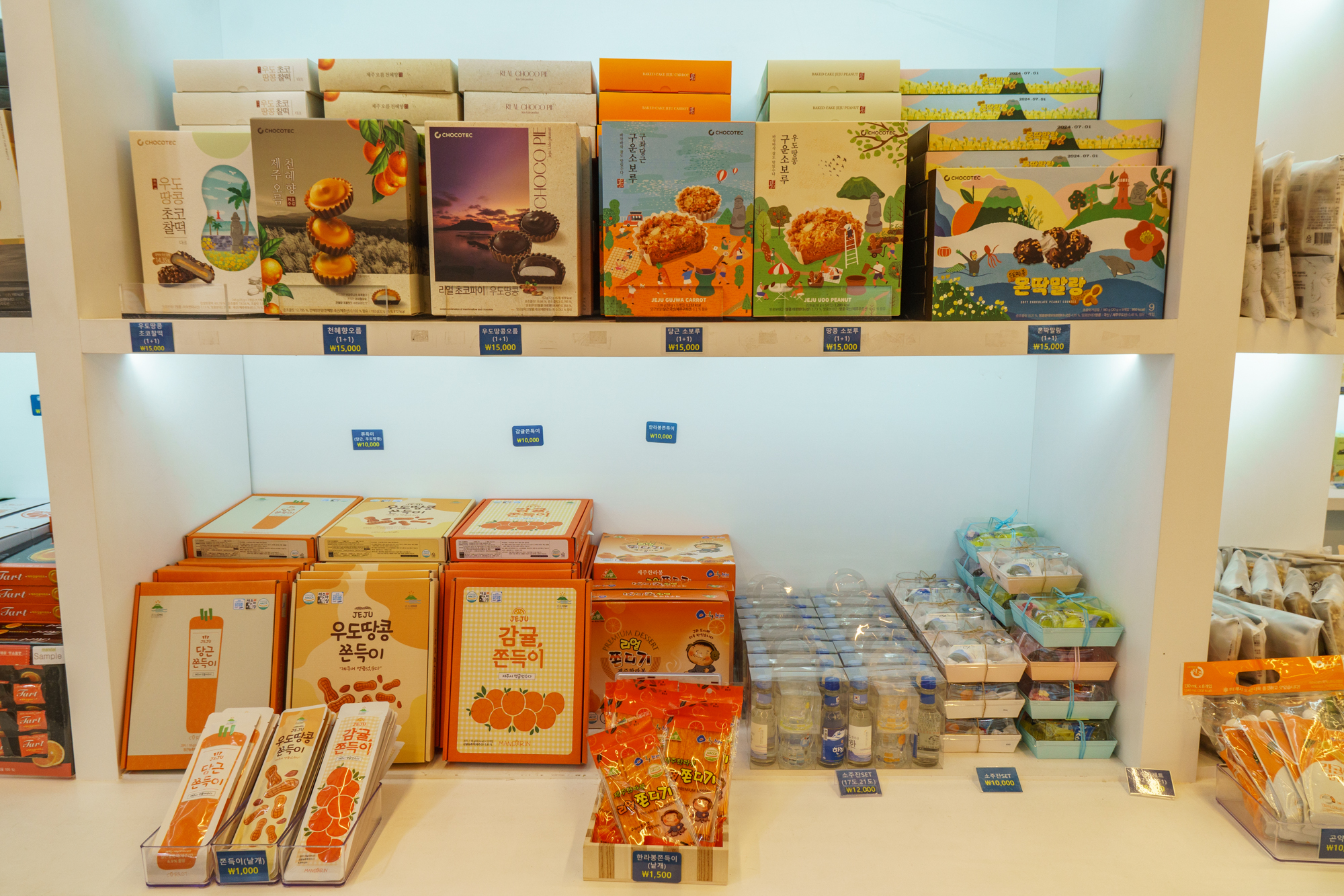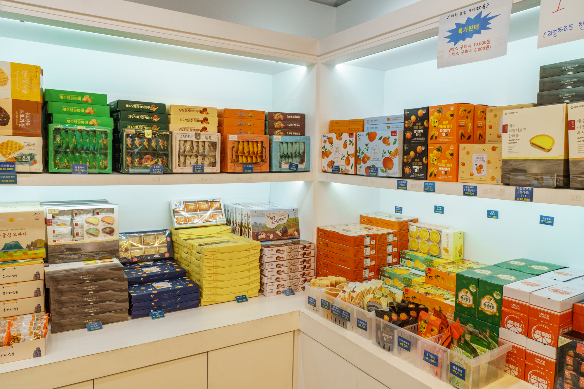매장 안쪽으로는 제주도 기념품 선물로 추천하고 싶은 먹거리가 가득했는데 많은 분들이 아는 제주 초콜릿이 아닌 쿠키, 타르트, 파이, 와플 등 제주도만의 간식 상품이 가득 있다.
