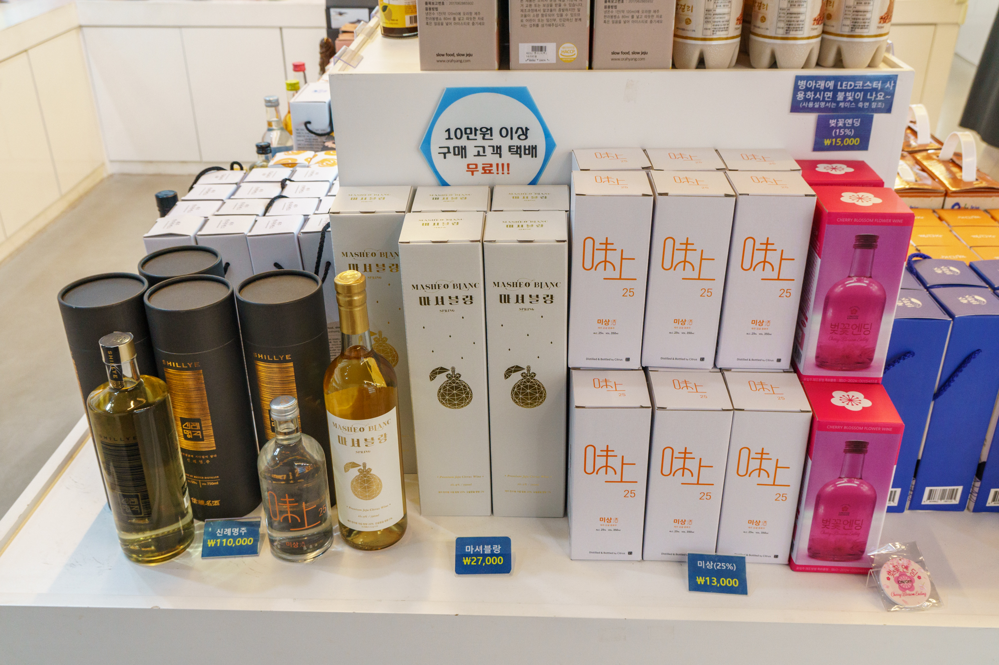 최근 입소문으로 인기가 많은 제주도 전통주인 신례명주 외에 신상품으로 혼디주, 마셔블랑, 미상25, 벚꽃엔딩도 있어 애주가거나 부모님에게 드릴 선물로 선택하기에 알맞았다.